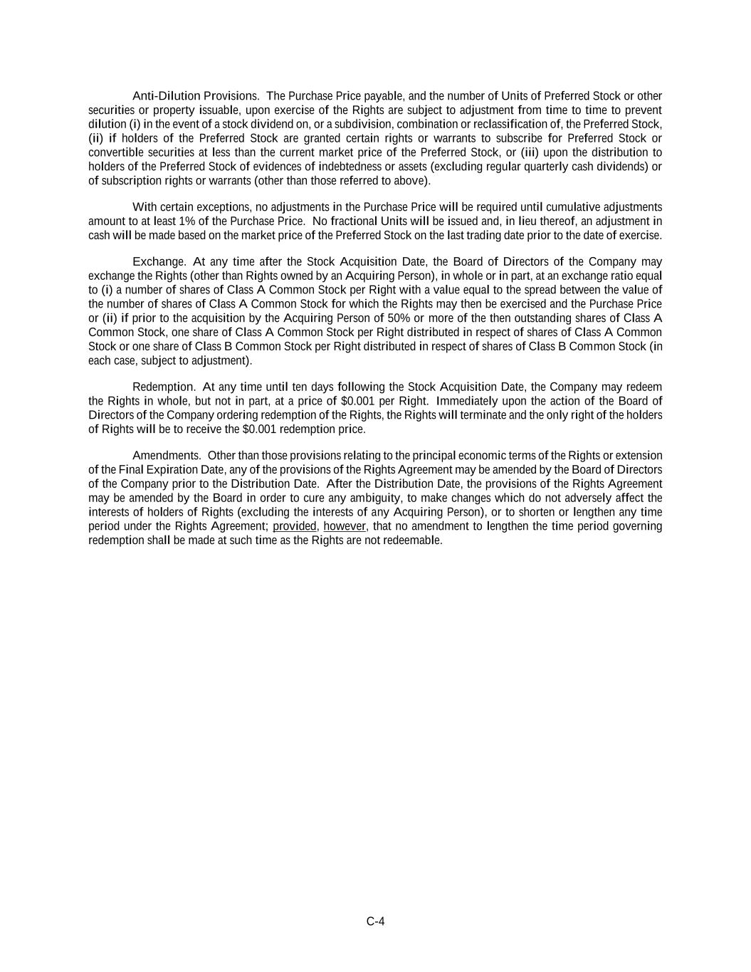 C-4 Anti-Dilution Provisions. The Purchase Price payable, and the number of Units of Preferred Stock or other securities or property issuable, upon exercise of the Rights are subject to adjustment from time to time to prevent dilution (i) in the event of a stock dividend on, or a subdivision, combination or reclassification of, the Preferred Stock, (ii) if holders of the Preferred Stock are granted certain rights or warrants to subscribe for Preferred Stock or convertible securities at less than the current market price of the Preferred Stock, or (iii) upon the distribution to holders of the Preferred Stock of evidences of indebtedness or assets (excluding regular quarterly cash dividends) or of subscription rights or warrants (other than those referred to above). With certain exceptions, no adjustments in the Purchase Price will be required until cumulative adjustments amount to at least 1% of the Purchase Price. No fractional Units will be issued and, in lieu thereof, an adjustment in cash will be made based on the market price of the Preferred Stock on the last trading date prior to the date of exercise. Exchange. At any time after the Stock Acquisition Date, the Board of Directors of the Company may exchange the Rights (other than Rights owned by an Acquiring Person), in whole or in part, at an exchange ratio equal to (i) a number of shares of Class A Common Stock per Right with a value equal to the spread between the value of the number of shares of Class A Common Stock for which the Rights may then be exercised and the Purchase Price or (ii) if prior to the acquisition by the Acquiring Person of 50% or more of the then outstanding shares of Class A Common Stock, one share of Class A Common Stock per Right distributed in respect of shares of Class A Common Stock or one share of Class B Common Stock per Right distributed in respect of shares of Class B Common Stock (in each case, subject to adjustment). Redemption. At any time until ten days following the Stock Acquisition Date, the Company may redeem the Rights in whole, but not in part, at a price of $0.001 per Right. Immediately upon the action of the Board of Directors of the Company ordering redemption of the Rights, the Rights will terminate and the only right of the holders of Rights will be to receive the $0.001 redemption price. Amendments. Other than those provisions relating to the principal economic terms of the Rights or extension of the Final Expiration Date, any of the provisions of the Rights Agreement may be amended by the Board of Directors of the Company prior to the Distribution Date. After the Distribution Date, the provisions of the Rights Agreement may be amended by the Board in order to cure any ambiguity, to make changes which do not adversely affect the interests of holders of Rights (excluding the interests of any Acquiring Person), or to shorten or lengthen any time period under the Rights Agreement; provided, however, that no amendment to lengthen the time period governing redemption shall be made at such time as the Rights are not redeemable.