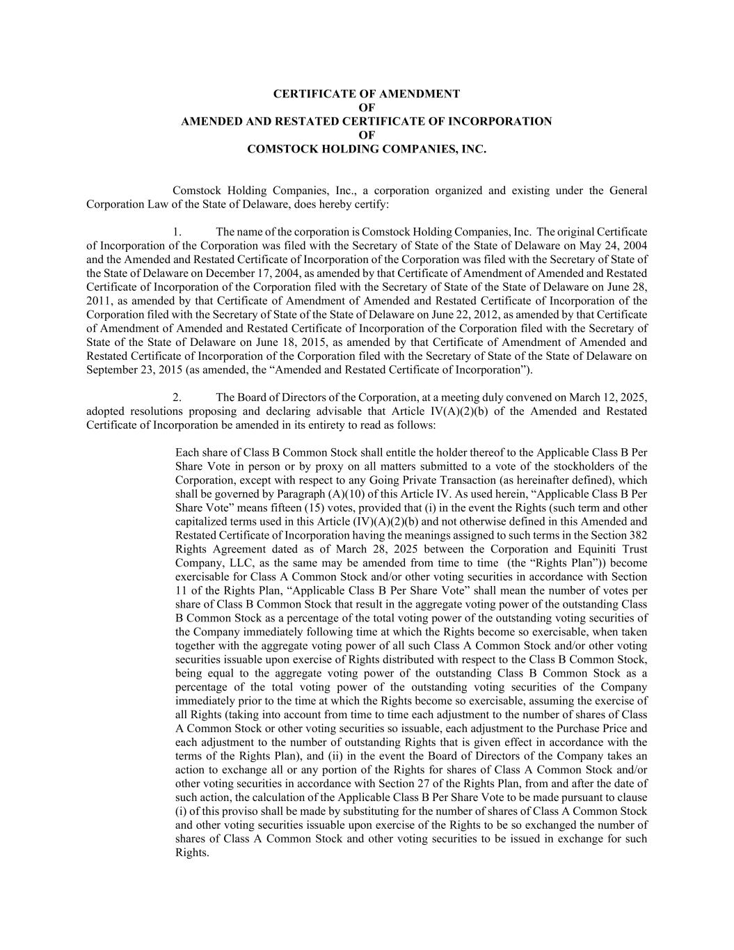 CERTIFICATE OF AMENDMENT OF AMENDED AND RESTATED CERTIFICATE OF INCORPORATION OF COMSTOCK HOLDING COMPANIES, INC. Comstock Holding Companies, Inc., a corporation organized and existing under the General Corporation Law of the State of Delaware, does hereby certify: 1. The name of the corporation is Comstock Holding Companies, Inc. The original Certificate of Incorporation of the Corporation was filed with the Secretary of State of the State of Delaware on May 24, 2004 and the Amended and Restated Certificate of Incorporation of the Corporation was filed with the Secretary of State of the State of Delaware on December 17, 2004, as amended by that Certificate of Amendment of Amended and Restated Certificate of Incorporation of the Corporation filed with the Secretary of State of the State of Delaware on June 28, 2011, as amended by that Certificate of Amendment of Amended and Restated Certificate of Incorporation of the Corporation filed with the Secretary of State of the State of Delaware on June 22, 2012, as amended by that Certificate of Amendment of Amended and Restated Certificate of Incorporation of the Corporation filed with the Secretary of State of the State of Delaware on June 18, 2015, as amended by that Certificate of Amendment of Amended and Restated Certificate of Incorporation of the Corporation filed with the Secretary of State of the State of Delaware on September 23, 2015 (as amended, the “Amended and Restated Certificate of Incorporation”). 2. The Board of Directors of the Corporation, at a meeting duly convened on March 12, 2025, adopted resolutions proposing and declaring advisable that Article IV(A)(2)(b) of the Amended and Restated Certificate of Incorporation be amended in its entirety to read as follows: Each share of Class B Common Stock shall entitle the holder thereof to the Applicable Class B Per Share Vote in person or by proxy on all matters submitted to a vote of the stockholders of the Corporation, except with respect to any Going Private Transaction (as hereinafter defined), which shall be governed by Paragraph (A)(10) of this Article IV. As used herein, “Applicable Class B Per Share Vote” means fifteen (15) votes, provided that (i) in the event the Rights (such term and other capitalized terms used in this Article (IV)(A)(2)(b) and not otherwise defined in this Amended and Restated Certificate of Incorporation having the meanings assigned to such terms in the Section 382 Rights Agreement dated as of March 28, 2025 between the Corporation and Equiniti Trust Company, LLC, as the same may be amended from time to time (the “Rights Plan”)) become exercisable for Class A Common Stock and/or other voting securities in accordance with Section 11 of the Rights Plan, “Applicable Class B Per Share Vote” shall mean the number of votes per share of Class B Common Stock that result in the aggregate voting power of the outstanding Class B Common Stock as a percentage of the total voting power of the outstanding voting securities of the Company immediately following time at which the Rights become so exercisable, when taken together with the aggregate voting power of all such Class A Common Stock and/or other voting securities issuable upon exercise of Rights distributed with respect to the Class B Common Stock, being equal to the aggregate voting power of the outstanding Class B Common Stock as a percentage of the total voting power of the outstanding voting securities of the Company immediately prior to the time at which the Rights become so exercisable, assuming the exercise of all Rights (taking into account from time to time each adjustment to the number of shares of Class A Common Stock or other voting securities so issuable, each adjustment to the Purchase Price and each adjustment to the number of outstanding Rights that is given effect in accordance with the terms of the Rights Plan), and (ii) in the event the Board of Directors of the Company takes an action to exchange all or any portion of the Rights for shares of Class A Common Stock and/or other voting securities in accordance with Section 27 of the Rights Plan, from and after the date of such action, the calculation of the Applicable Class B Per Share Vote to be made pursuant to clause (i) of this proviso shall be made by substituting for the number of shares of Class A Common Stock and other voting securities issuable upon exercise of the Rights to be so exchanged the number of shares of Class A Common Stock and other voting securities to be issued in exchange for such Rights.