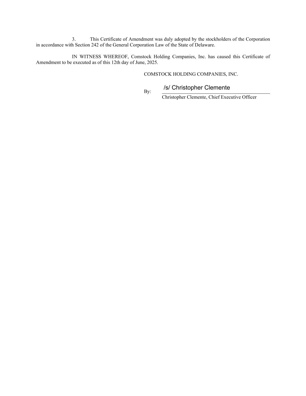 3. This Certificate of Amendment was duly adopted by the stockholders of the Corporation in accordance with Section 242 of the General Corporation Law of the State of Delaware. IN WITNESS WHEREOF, Comstock Holding Companies, Inc. has caused this Certificate of Amendment to be executed as of this 12th day of June, 2025. COMSTOCK HOLDING COMPANIES, INC. By: Christopher Clemente, Chief Executive Officer /s/ Christopher Clemente