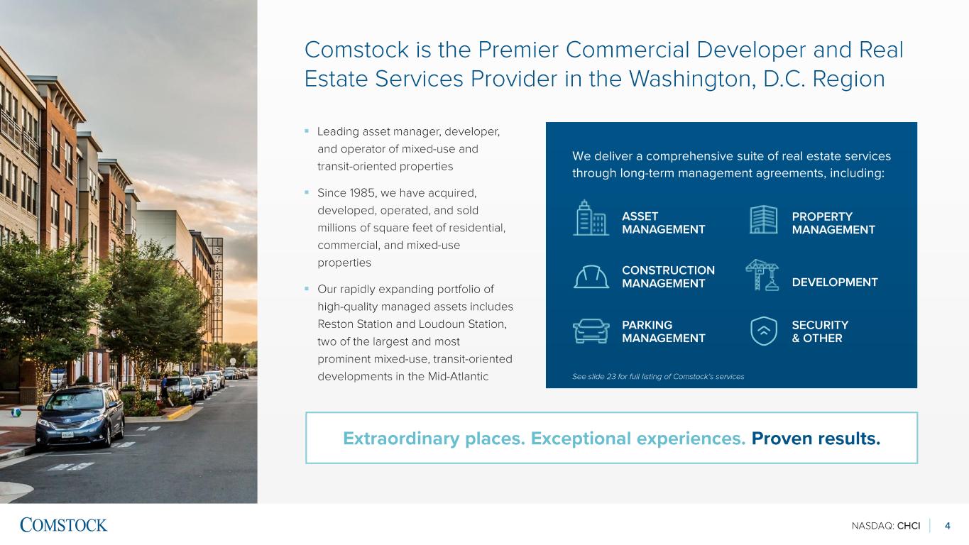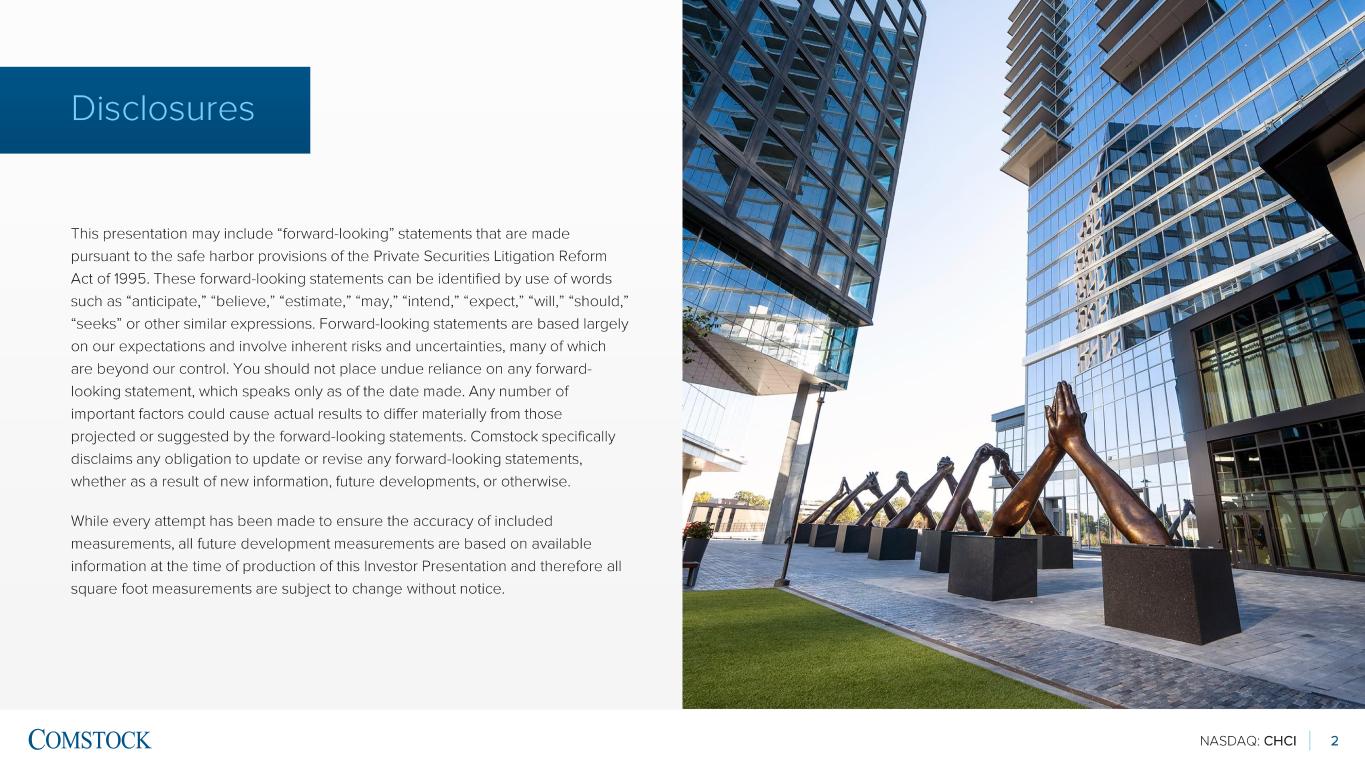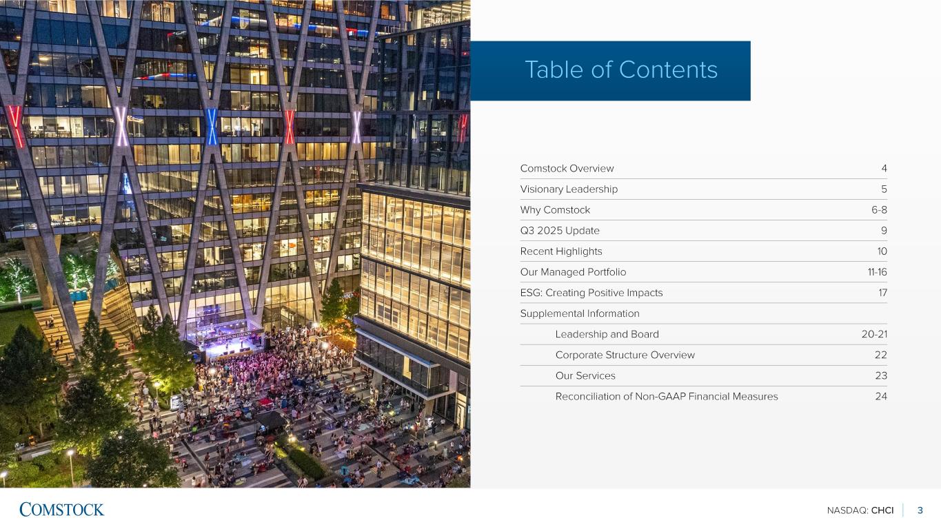 NASDAQ: CHCI 2 Disclosures This presentation may include “forward -looking” statements that are made pursuant to the safe harbor provisions of the Private Securities Litigation Reform Act of 1995. These forward -looking statements can be identified by use of words such as “anticipate,” “believe,” “estimate,” “may,” “intend,” “expect,” “will,” “should,” “seeks” or other similar expressions. Forward -looking statements are based largely on our expectations and involve inherent risks and uncertainties, many of which are beyond our control. You should not place undue reliance on any forward - looking statement, which speaks only as of the date made. Any number of important factors could cause actual results to differ materially from those projected or suggested by the forward -looking statements. Comstock specifically disclaims any obligation to update or revise any forward -looking statements, whether as a result of new information, future developments, or otherwise. While every attempt has been made to ensure the accuracy of included measurements, all future development measurements are based on available information at the time of production of this Investor Presentation and therefore all square foot measurements are subject to change without notice.