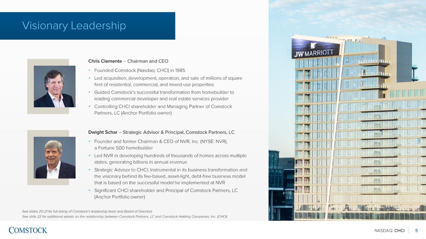 NASDAQ: CHCI 4 Comstock is the Premier Commercial Developer and Real Estate Services Provider in the Washington, D.C. Region ▪ Leading asset manager, developer, and operator of mixed -use and transit-oriented properties ▪ Since 1985, we have acquired, developed, operated, and sold millions of square feet of residential, commercial, and mixed -use properties ▪ Our rapidly expanding portfolio of high-quality managed assets includes Reston Station and Loudoun Station, two of the largest and most prominent mixed -use, transit -oriented developments in the Mid -Atlantic Extraordinary places. Exceptional experiences. Proven results. We deliver a comprehensive suite of real estate services through long -term management agreements, including: ASSET MANAGEMENT DEVELOPMENT CONSTRUCTION MANAGEMENT PROPERTY MANAGEMENT PARKING MANAGEMENT SECURITY & OTHER See slide 23 for full listing of Comstock’s services