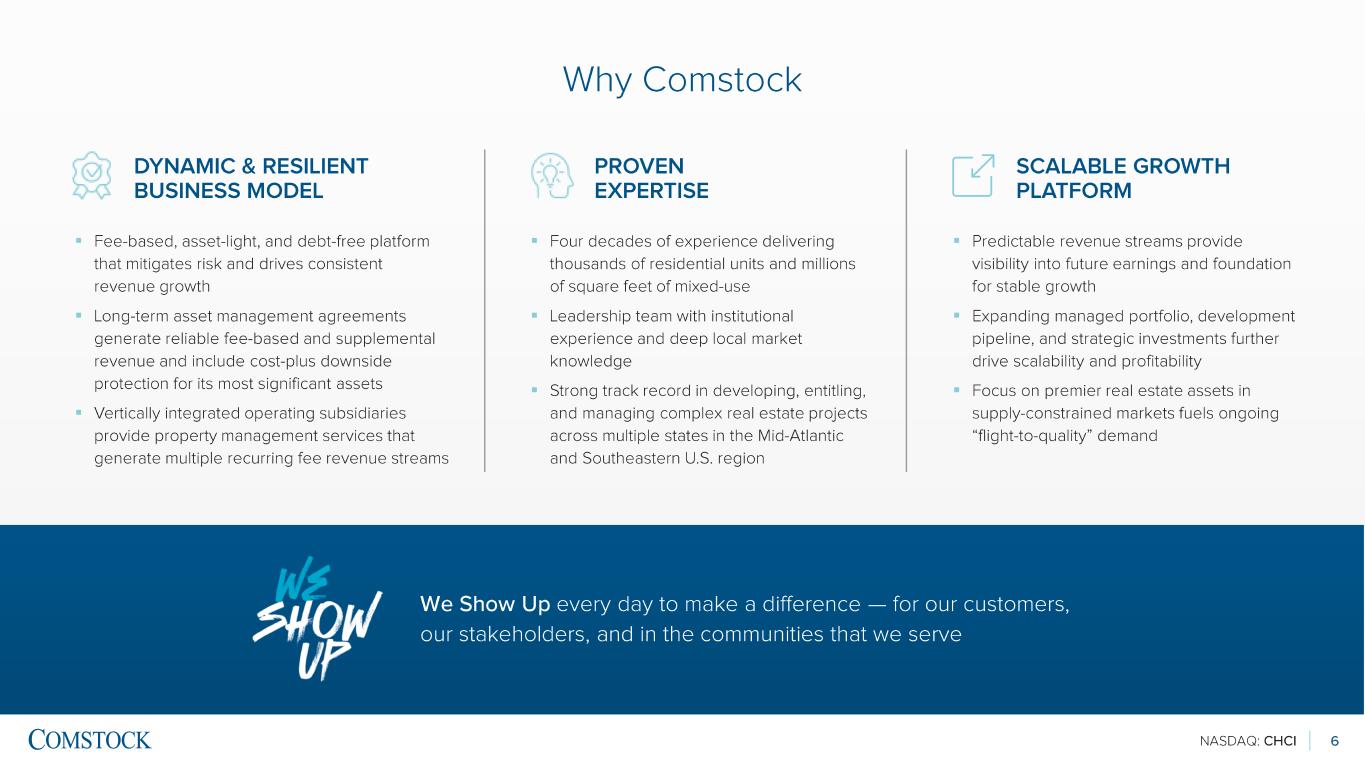 NASDAQ: CHCI 5 Visionary Leadership Chris Clemente – Chairman and CEO ▪ Founded Comstock (Nasdaq: CHCI) in 1985 ▪ Led acquisition, development, operation, and sale of millions of square feet of residential, commercial, and mixed -use properties ▪ Guided Comstock’s successful transformation from homebuilder to leading commercial developer and real estate services provider ▪ Controlling CHCI shareholder and Managing Partner of Comstock Partners, LC (Anchor Portfolio owner) See slides 20 -21 for full listing of Comstock’s leadership team and Board of Directors See slide 22 for additional details on the relationship between Comstock Partners, LC and Comstock Holding Companies, Inc. (C HCI ) Dwight Schar – Strategic Advisor & Principal, Comstock Partners, LC ▪ Founder and former Chairman & CEO of NVR, Inc. (NYSE: NVR), a Fortune 500 homebuilder ▪ Led NVR in developing hundreds of thousands of homes across multiple states, generating billions in annual revenue ▪ Strategic Advisor to CHCI; Instrumental in its business transformation and the visionary behind its fee -based, asset -light, debt -free business model that is based on the successful model he implemented at NVR ▪ Significant CHCI shareholder and Principal of Comstock Partners, LC (Anchor Portfolio owner)