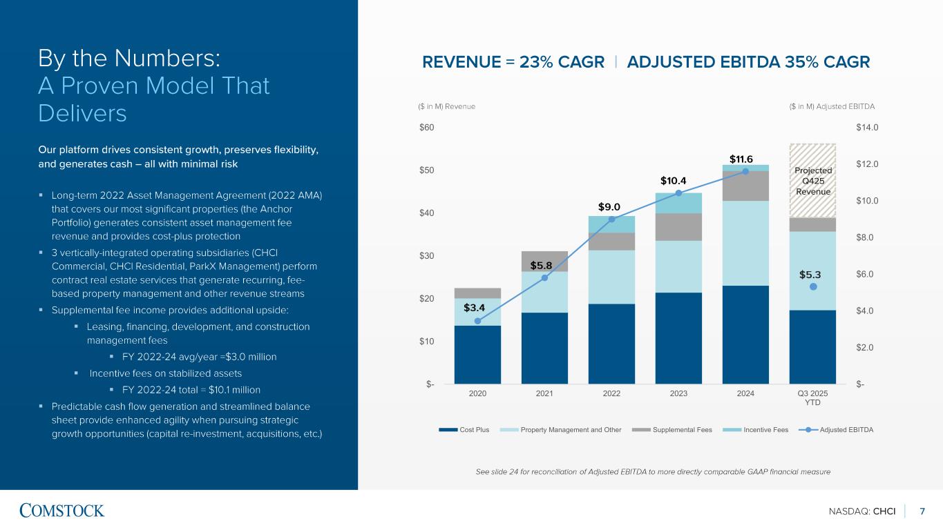NASDAQ: CHCI 6 Why Comstock DYNAMIC & RESILIENT BUSINESS MODEL PROVEN EXPERTISE ▪ Fee -based, asset -light, and debt -free platform that mitigates risk and drives consistent revenue growth ▪ Long -term asset management agreements generate reliable fee -based and supplemental revenue and include cost -plus downside protection for its most significant assets ▪ Vertically integrated operating subsidiaries provide property management services that generate multiple recurring fee revenue streams ▪ Four decades of experience delivering thousands of residential units and millions of square feet of mixed -use ▪ Leadership team with institutional experience and deep local market knowledge ▪ Strong track record in developing, entitling, and managing complex real estate projects across multiple states in the Mid -Atlantic and Southeastern U.S. region ▪ Predictable revenue streams provide visibility into future earnings and foundation for stable growth ▪ Expanding managed portfolio, development pipeline, and strategic investments further drive scalability and profitability ▪ Focus on premier real estate assets in supply -constrained markets fuels ongoing “flight-to-quality” demand SCALABLE GROWTH PLATFORM We Show Up every day to make a difference — for our customers, our stakeholders, and in the communities that we serve
