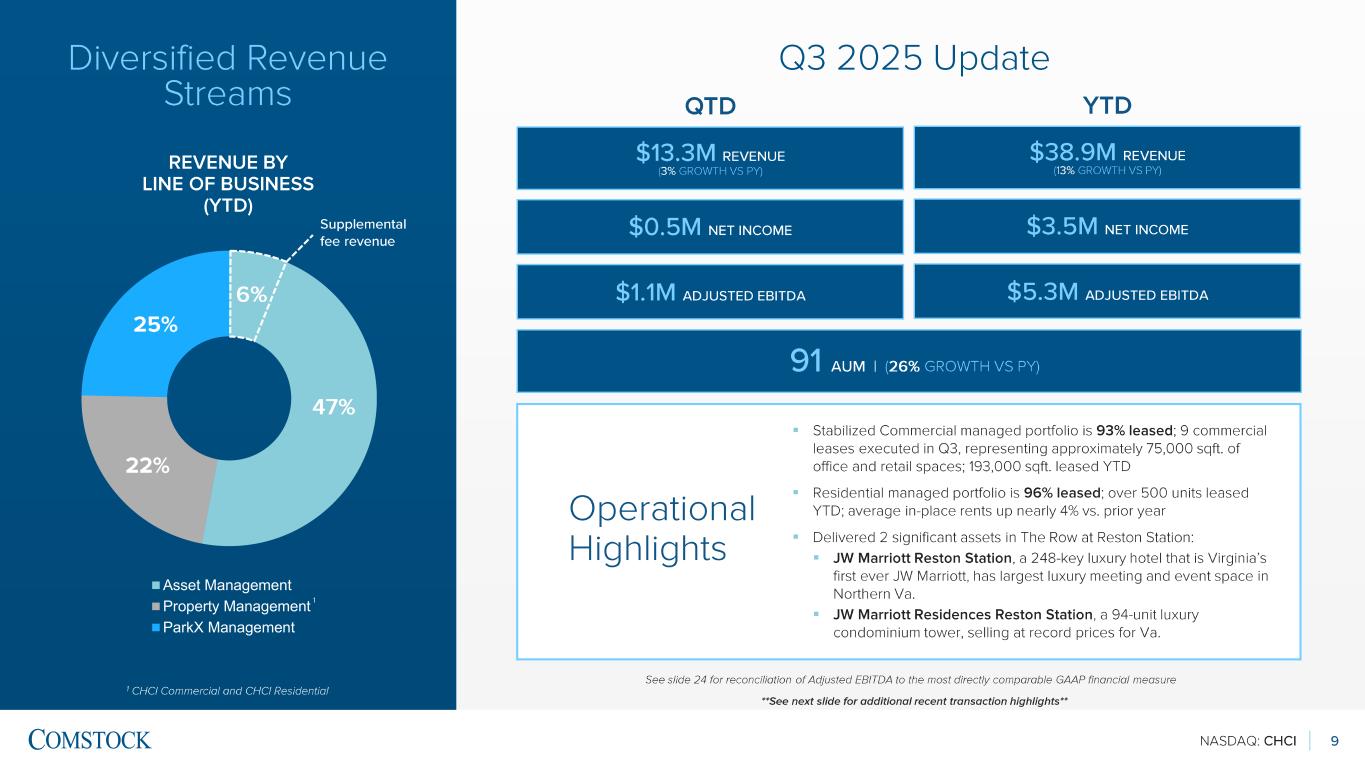 NASDAQ: CHCI 8 DELIVERING SUPERIOR VALUE Note: Peers include JBG Smith (JBGS), Boston Properties (BXP), Elme Communities (ELME) and Federal Realty (FRT). Peer metrics (including debt) represents straight average. Valuation date as of 9/30/2025. Peer multiples are averages. 10.7X LTM 9/30/2025 Adjusted EBITDA Multiple PEERS 17.8X 2.5X Ratio: Stock price/ Book Value PEERS 2.1X 615% 2020 -9/30/2025 % Stock Price Increase PEERS -38% VALUATION $0 As of 9/30/2025 Debt PEERS $6.8B FINANCIAL METRICS 26% LTM 9/30/2025 ROE PEERS -0.9% 35% 2020 -2024 CAGR Adjusted EBITDA Growth PEERS 2.3% By the Numbers: A Compelling Investment Opportunity