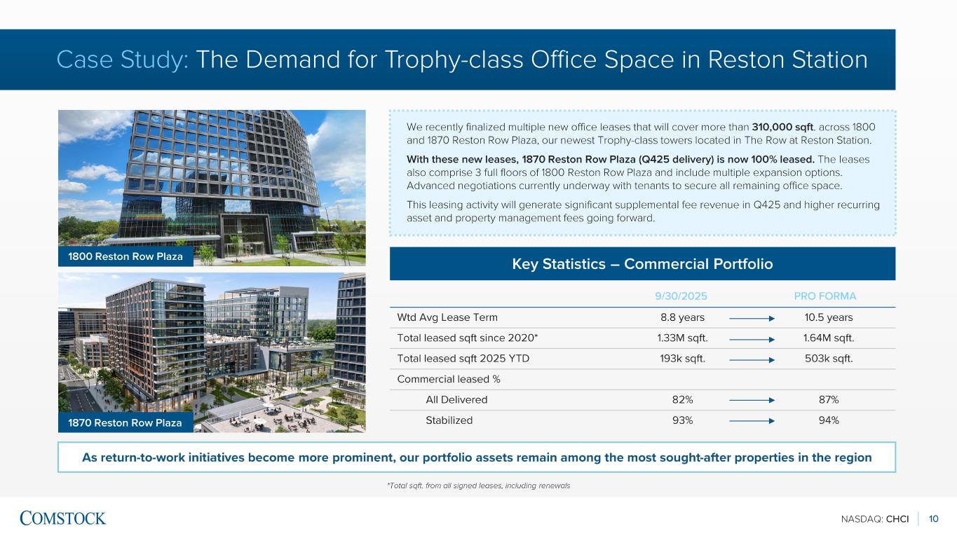 NASDAQ: CHCI 9 Diversified Revenue Streams 1 CHCI Commercial and CHCI Residential 22% 25% Asset Management Property Management ParkX Management REVENUE BY LINE OF BUSINESS (YTD) ▪ Stabilized Commercial managed portfolio is 93% leased ; 9 commercial leases executed in Q3, representing approximately 75,000 sqft. of office and retail spaces; 193,000 sqft. leased YTD ▪ Residential managed portfolio is 96% leased ; over 500 units leased YTD; average in -place rents up nearly 4% vs. prior year ▪ Delivered 2 significant assets in The Row at Reston Station: ▪ JW Marriott Reston Station , a 248 -key luxury hotel that is Virginia’s first ever JW Marriott, has largest luxury meeting and event space in Northern Va. ▪ JW Marriott Residences Reston Station , a 94 -unit luxury condominium tower, selling at record prices for Va. Operational Highlights See slide 24 for reconciliation of Adjusted EBITDA to the most directly comparable GAAP financial measure Q3 2025 Update 1 $13.3M REVENUE (3% GROWTH VS PY) $1.1M ADJUSTED EBITDA QTD $0.5M NET INCOME 91 AUM | (26% GROWTH VS PY) $38.9M REVENUE (13% GROWTH VS PY) $5.3M ADJUSTED EBITDA YTD $3.5M NET INCOME 6% Supplemental fee revenue 47% **See next slide for additional recent transaction highlights**