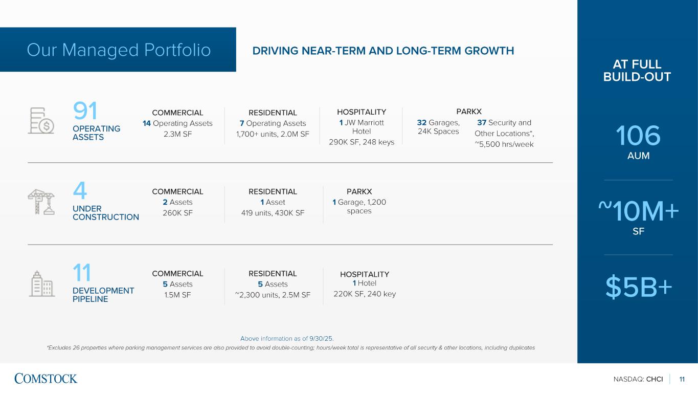 NASDAQ: CHCI 10 Case Study: The Demand for Trophy -class Office Space in Reston Station As return -to-work initiatives become more prominent, our portfolio assets remain among the most sought -after properties in the region We recently f inalized multiple new office leases that will cover more than 310,000 sqft. across 1800 and 1870 Reston Row Plaza, our newest Trophy -class towers located in The Row at Reston Station. With these new leases, 1870 Reston Row Plaza (Q425 delivery) is now 100% leased. The leases also comprise 3 full floors of 1800 Reston Row Plaza and include multiple expansion options. Advanced negotiations currently underway with tenants to secure all remaining office space. This leasing activity will generate significant supplemental fee revenue in Q425 and higher recurring asset and property management fees going forward. PRO FORMA9/30/2025 Wtd Avg Lease Term 8.8 years 10.5 years Total leased sqft since 2020* 1.33M sqft. 1.64M sqft. Total leased sqft 2025 YTD 193k sqft. 503k sqft. Commercial leased % All Delivered 82% 87% Stabilized 93% 94% Key Statistics – Commercial Portfolio *Total sqft. from all signed leases, including renewals 1800 Reston Row Plaza 1870 Reston Row Plaza