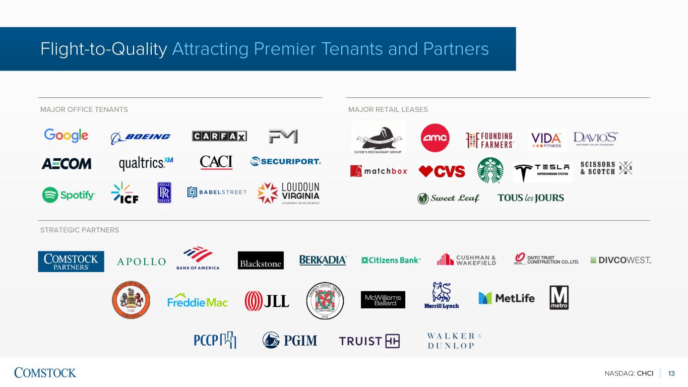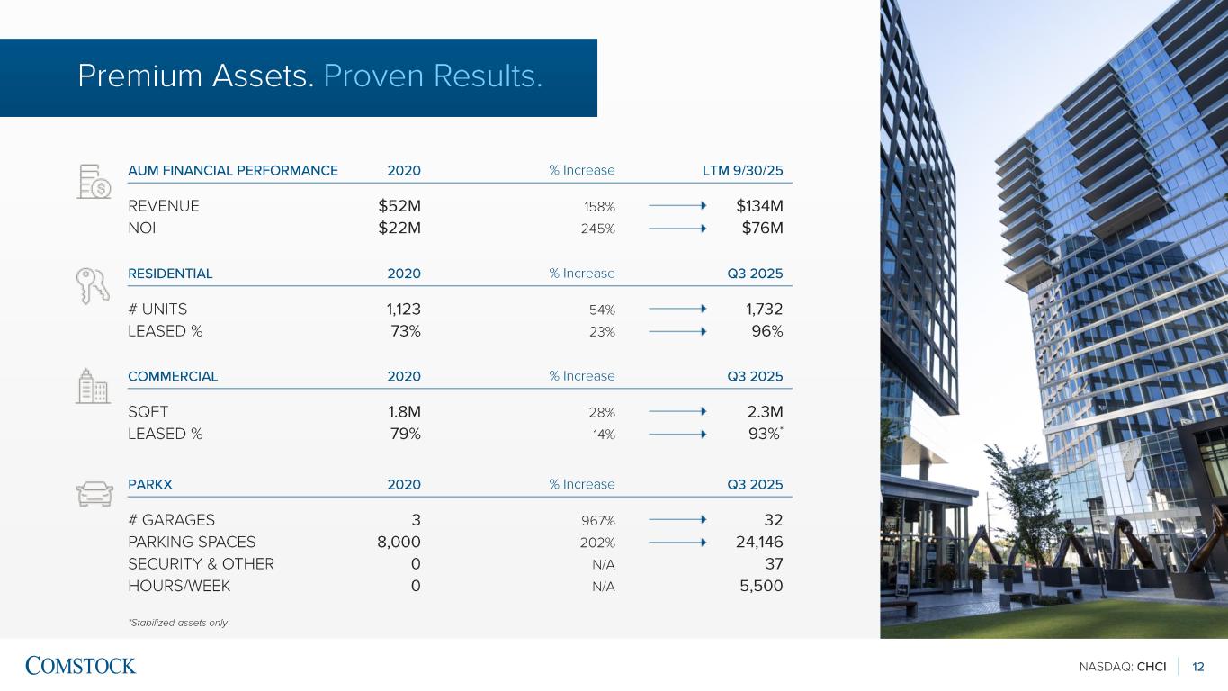 NASDAQ: CHCI 11 Above information as of 9/30/25. *Excludes 26 properties where parking management services are also provided to avoid double -counting ; hours/week total is representative of all security & other locations, including duplicates COMMERCIAL 14 Operating Assets 2.3M SF RESIDENTIAL 7 Operating Assets 1,700+ units, 2.0M SF 32 Garages, 24K Spaces 37 Security and Other Locations*, ~5,500 hrs/week COMMERCIAL 2 Assets 260K SF RESIDENTIAL 1 Asset 419 units, 430K SF PARKX 1 Garage, 1,200 spaces HOSPITALITY 1 JW Marriott Hotel 290K SF, 248 keys COMMERCIAL 5 Assets 1.5M SF RESIDENTIAL 5 Assets ~2,300 units, 2.5M SF HOSPITALITY 1 Hotel 220K SF, 240 key 91 OPERATING ASSETS 4 UNDER CONSTRUCTION 11 DEVELOPMENT PIPELINE Our Managed Portfolio DRIVING NEAR -TERM AND LONG -TERM GROWTH 106 AUM ~10M+ SF $5B+ AT FULL BUILD -OUT PARKX