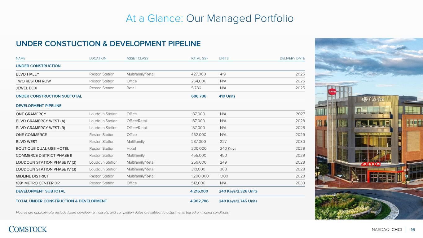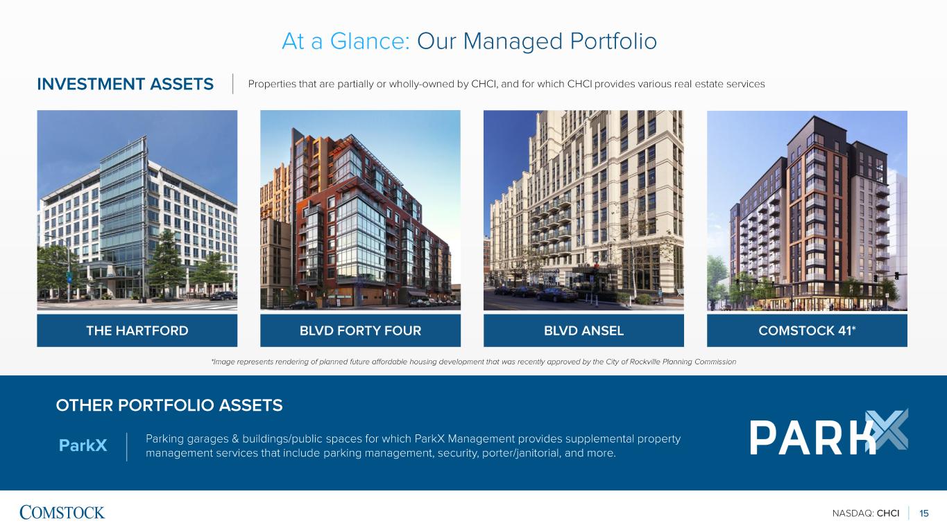NASDAQ: CHCI 14 ANCHOR PORTFOLIO Two of the largest and most prominent mixed -use, transit-oriented developments in the Mid -Atlantic region; include legacy assets owned by Comstock Partners that CHCI develops, manages, and operates RESTON STATION LOUDOUN STATION 90 acres Size 50 acres Metro Silver Line: Wiehle -Reston Location Metro Silver Line: Ashburn 3.1M sqft. Commercial ~700,000 sqft. 2,700+ units Residential 1,200+ units JW Marriott Reston Station Hospitality Future boutique hotel (TBD) Founding Farmers; VIDA Fitness, Ebbitt House, Matchbox, Davios, Tous les Jours, Starbucks, CVS, and more Restaurants/Retail AMC Theaters, Starbucks, Juleps Kentucky Tavern, Curry Pizza House, Famous Toastery , Senor Tequila's, and more All numbers are estimates at full build -out At a Glance : Our Managed Portfolio