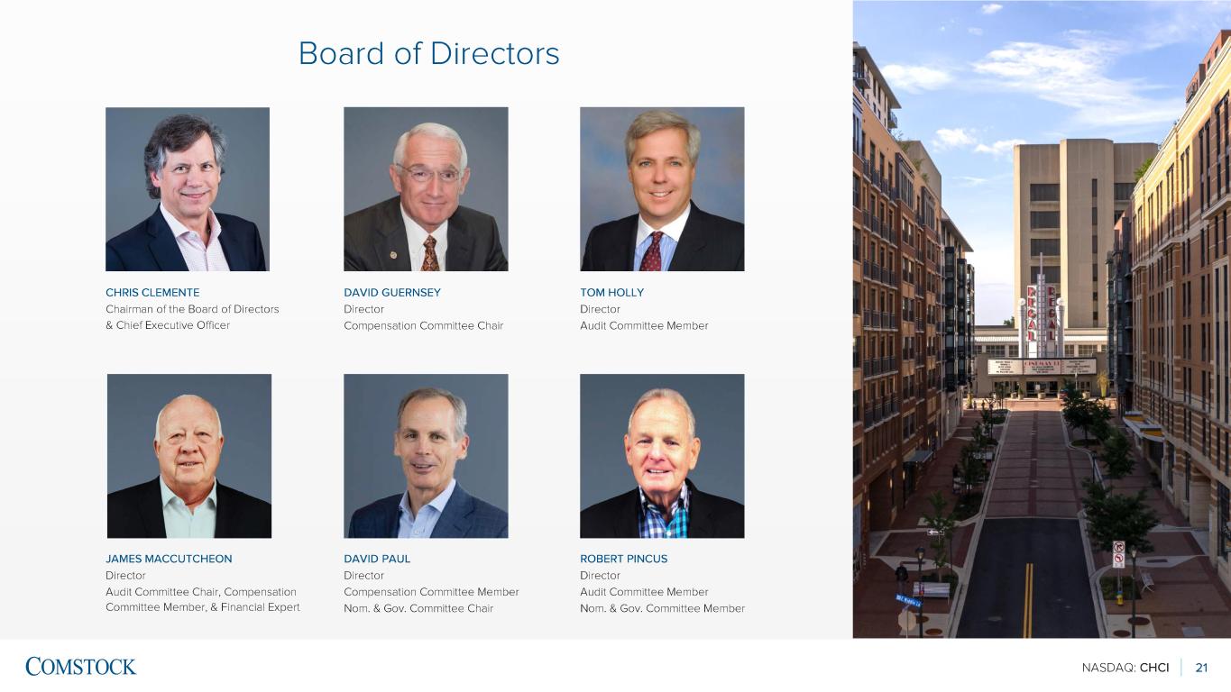 NASDAQ: CHCI 20 Leadership Team EX EC U TI V E C O M M IT TE E SE N IO R L EA D ER SH IP TIMOTHY STEFFAN Chief Operating Officer CHRISTOPHER GUTHRIE CFO & EVP ROBERT DEMCHAK General Counsel & Corporate Secretary TRACY SCHAR SVP of Marketing & Design Management JOHN HARRISON EVP of Development PAUL SCHWARTZ SVP of Human Resources MICHAEL GUALTIERI Chief Accounting Officer RUBEN MERCADO VP & Head of Information Technology JIMMY MANDICH VP & Controller KRIS GREEN SVP, Property & Asset Management CHRIS FACAS Senior Managing Director, Asset Management DYLAN CLEMENTE President, ParkX Management CHRIS CLEMENTE CEO & Chairman of CHCI Significant Shareholder of CHCI Managing Partner of Comstock Partners, LC (Owner of Anchor Portfolio) DWIGHT SCHAR Former CEO & Chairman of NVR (NYSE: NVR) Significant Shareholder of CHCI Principal of Comstock Partners, LC (Owner of Anchor Portfolio) COMBINING LOCAL EXPERTISE WITH INDUSTRY EXPERIENCE