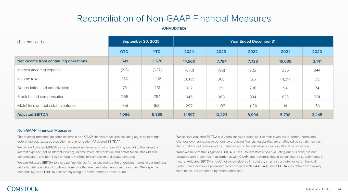 NASDAQ: CHCI 24 This investor presentation contains certain non -GAAP financial measures including adjusted earnings before interest, taxes, depreciation, and amortization (“Adjusted EBITDA”). We define Adjusted EBITDA as net income (loss) from continuing operations, excluding the impact of interest expense (net of interest income), income taxes, depreciation and amortization, stock -based compensation, and gain (loss) on equity method investments in real estate ventures. We use Adjusted EBITDA to evaluate financial performance, analyze the underlying trends in our business and establish operational goals and forecasts that are used when allocating resources. We expect to compute Adjusted EBITDA consistently using the same methods each period. We believe Adjusted EBITDA is a useful measure because it permits investors to better understand changes over comparative periods by providing financial results that are unaffected by certain non -cash items that are not considered by management to be indicative of our operational performance. While we believe that Adjusted EBITDA is useful to investors when evaluating our business, it is not prepared and presented in accordance with GAAP, and therefore should be considered supplemental in nature. Adjusted EBITDA should not be considered in isolation, or as a substitute, for other financial performance measures presented in accordance with GAAP. Adjusted EBITDA may differ from similarly titled measures presented by other companies. Reconciliation of Non -GAAP Financial Measures (UNAUDITED) Non -GAAP Financial Measures ($ in thousands) September 30, 2025 Year Ended December 31, QTD YTD 2024 2023 2022 2021 2020 Net income from continuing operations 541 3,576 14,560 7,784 7,728 16,039 2,141 Interest (income) expense (218) (622) (672) (96) 222 235 344 Income taxes 450 1,412 (3,835) 368 125 (11,217) 25 Depreciation and amortization 73 231 302 211 206 94 74 Stock -based compensation 255 794 945 968 834 633 701 (Gain) loss on real estate ventures (35) (53) 297 1,187 (121) 14 160 Adjusted EBITDA 1,066 5,338 11,597 10,423 8,994 5,798 3,445