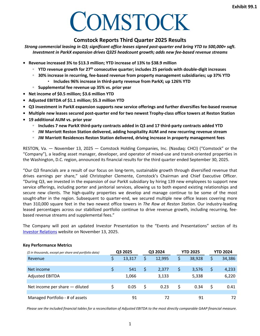 Comstock Reports Third Quarter 2025 Results Strong commercial leasing in Q3; significant office leases signed post-quarter end bring YTD to 500,000+ sqft. Investment in ParkX expansion drives Q325 headcount growth; adds new fee-based revenue streams • Revenue increased 3% to $13.3 million; YTD increase of 13% to $38.9 million ◦ YTD revenue growth for 27th consecutive quarter; includes 25 periods with double-digit increases ◦ 30% increase in recurring, fee-based revenue from property management subsidiaries; up 37% YTD ▪ Includes 96% increase in third-party revenue from ParkX; up 126% YTD ◦ Supplemental fee revenue up 35% vs. prior year • Net income of $0.5 million; $3.6 million YTD • Adjusted EBITDA of $1.1 million; $5.3 million YTD • Q3 investment in ParkX expansion supports new service offerings and further diversifies fee-based revenue • Multiple new leases secured post-quarter end for two newest Trophy-class office towers at Reston Station • 19 additional AUM vs. prior year ◦ Includes 7 new ParkX third-party contracts added in Q3 and 17 third-party contracts added YTD ◦ JW Marriott Reston Station delivered, adding hospitality AUM and new recurring revenue stream ◦ JW Marriott Residences Reston Station delivered, driving increase in property management fees RESTON, Va. — November 13, 2025 — Comstock Holding Companies, Inc. (Nasdaq: CHCI) (“Comstock” or the “Company”), a leading asset manager, developer, and operator of mixed-use and transit-oriented properties in the Washington, D.C. region, announced its financial results for the third quarter ended September 30, 2025. “Our Q3 financials are a result of our focus on long-term, sustainable growth through diversified revenue that drives earnings per share,” said Christopher Clemente, Comstock’s Chairman and Chief Executive Officer. “During Q3, we invested in the expansion of our ParkX subsidiary by hiring 139 new employees to support new service offerings, including porter and janitorial services, allowing us to both expand existing relationships and secure new clients. The high-quality properties we develop and manage continue to be some of the most sought-after in the region. Subsequent to quarter-end, we secured multiple new office leases covering more than 310,000 square feet in the two newest office towers in The Row at Reston Station. Our industry-leading leased percentages across our stabilized portfolio continue to drive revenue growth, including recurring, fee- based revenue streams and supplemental fees.” The Company will post an updated Investor Presentation to the “Events and Presentations” section of its Investor Relations website on November 13, 2025. Key Performance Metrics ($ in thousands, except per share and portfolio data) Q3 2025 Q3 2024 YTD 2025 YTD 2024 Revenue $ 13,317 $ 12,995 $ 38,928 $ 34,386 Net income $ 541 $ 2,377 $ 3,576 $ 4,233 Adjusted EBITDA 1,066 3,133 5,338 6,220 Net income per share — diluted $ 0.05 $ 0.23 $ 0.34 $ 0.41 Managed Portfolio - # of assets 91 72 91 72 Please see the included financial tables for a reconciliation of Adjusted EBITDA to the most directly comparable GAAP financial measure. 1 Exhibit 99.1
