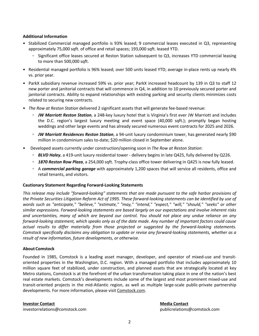 Additional Information • Stabilized Commercial managed portfolio is 93% leased; 9 commercial leases executed in Q3, representing approximately 75,000 sqft. of office and retail spaces; 193,000 sqft. leased YTD. ◦ Significant office leases secured at Reston Station subsequent to Q3, increases YTD commercial leasing to more than 500,000 sqft. • Residential managed portfolio is 96% leased; over 500 units leased YTD; average in-place rents up nearly 4% vs. prior year. • ParkX subsidiary revenue increased 59% vs. prior year; ParkX increased headcount by 139 in Q3 to staff 12 new porter and janitorial contracts that will commence in Q4, in addition to 10 previously secured porter and janitorial contracts. Ability to expand relationships with existing parking and security clients minimizes costs related to securing new contracts. • The Row at Reston Station delivered 2 significant assets that will generate fee-based revenue: ◦ JW Marriott Reston Station, a 248-key luxury hotel that is Virginia’s first ever JW Marriott and includes the D.C. region’s largest luxury meeting and event space (40,000 sqft.); promptly began hosting weddings and other large events and has already secured numerous event contracts for 2025 and 2026. ◦ JW Marriott Residences Reston Station, a 94-unit luxury condominium tower, has generated nearly $90 million in condominium sales to-date; $20 million closed in September alone. • Developed assets currently under construction/opening soon in The Row at Reston Station: ◦ BLVD Haley, a 419-unit luxury residential tower - delivery begins in late Q425, fully delivered by Q226. ◦ 1870 Reston Row Plaza, a 254,000 sqft. Trophy-class office tower delivering in Q425 is now fully leased. ◦ A commercial parking garage with approximately 1,200 spaces that will service all residents, office and retail tenants, and visitors. Cautionary Statement Regarding Forward-Looking Statements This release may include "forward-looking" statements that are made pursuant to the safe harbor provisions of the Private Securities Litigation Reform Act of 1995. These forward-looking statements can be identified by use of words such as "anticipate," "believe," "estimate," "may," "intend," "expect," "will," "should," "seeks" or other similar expressions. Forward-looking statements are based largely on our expectations and involve inherent risks and uncertainties, many of which are beyond our control. You should not place any undue reliance on any forward-looking statement, which speaks only as of the date made. Any number of important factors could cause actual results to differ materially from those projected or suggested by the forward-looking statements. Comstock specifically disclaims any obligation to update or revise any forward-looking statements, whether as a result of new information, future developments, or otherwise. About Comstock Founded in 1985, Comstock is a leading asset manager, developer, and operator of mixed-use and transit- oriented properties in the Washington, D.C. region. With a managed portfolio that includes approximately 10 million square feet of stabilized, under construction, and planned assets that are strategically located at key Metro stations, Comstock is at the forefront of the urban transformation taking place in one of the nation’s best real estate markets. Comstock’s developments include some of the largest and most prominent mixed-use and transit-oriented projects in the mid-Atlantic region, as well as multiple large-scale public-private partnership developments. For more information, please visit Comstock.com. Investor Contact Media Contact investorrelations@comstock.com publicrelations@comstock.com 2