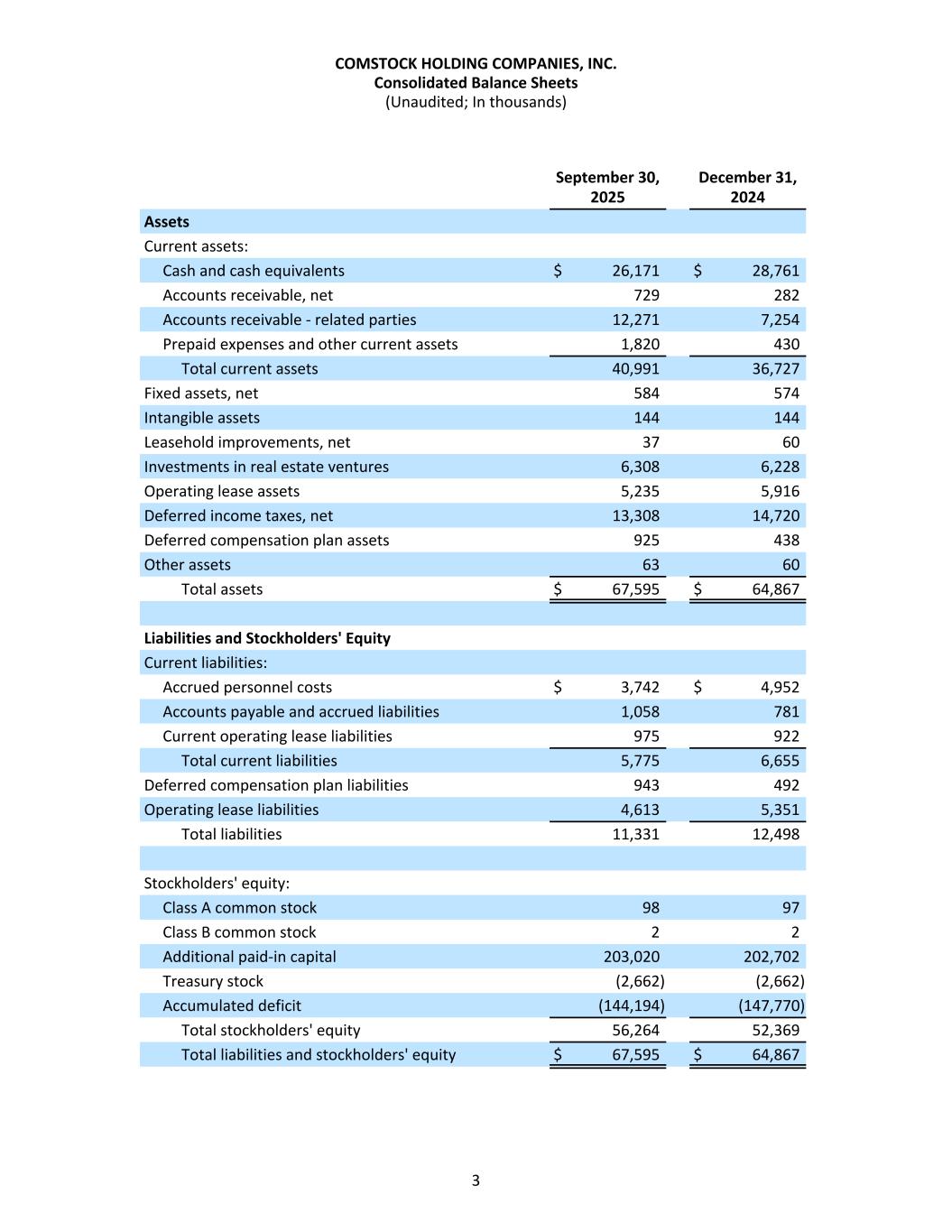 September 30, December 31, 2025 2024 Assets Current assets: Cash and cash equivalents $ 26,171 $ 28,761 Accounts receivable, net 729 282 Accounts receivable - related parties 12,271 7,254 Prepaid expenses and other current assets 1,820 430 Total current assets 40,991 36,727 Fixed assets, net 584 574 Intangible assets 144 144 Leasehold improvements, net 37 60 Investments in real estate ventures 6,308 6,228 Operating lease assets 5,235 5,916 Deferred income taxes, net 13,308 14,720 Deferred compensation plan assets 925 438 Other assets 63 60 Total assets $ 67,595 $ 64,867 Liabilities and Stockholders' Equity Current liabilities: Accrued personnel costs $ 3,742 $ 4,952 Accounts payable and accrued liabilities 1,058 781 Current operating lease liabilities 975 922 Total current liabilities 5,775 6,655 Deferred compensation plan liabilities 943 492 Operating lease liabilities 4,613 5,351 Total liabilities 11,331 12,498 Stockholders' equity: Class A common stock 98 97 Class B common stock 2 2 Additional paid-in capital 203,020 202,702 Treasury stock (2,662) (2,662) Accumulated deficit (144,194) (147,770) Total stockholders' equity 56,264 52,369 Total liabilities and stockholders' equity $ 67,595 $ 64,867 COMSTOCK HOLDING COMPANIES, INC. Consolidated Balance Sheets (Unaudited; In thousands) 3