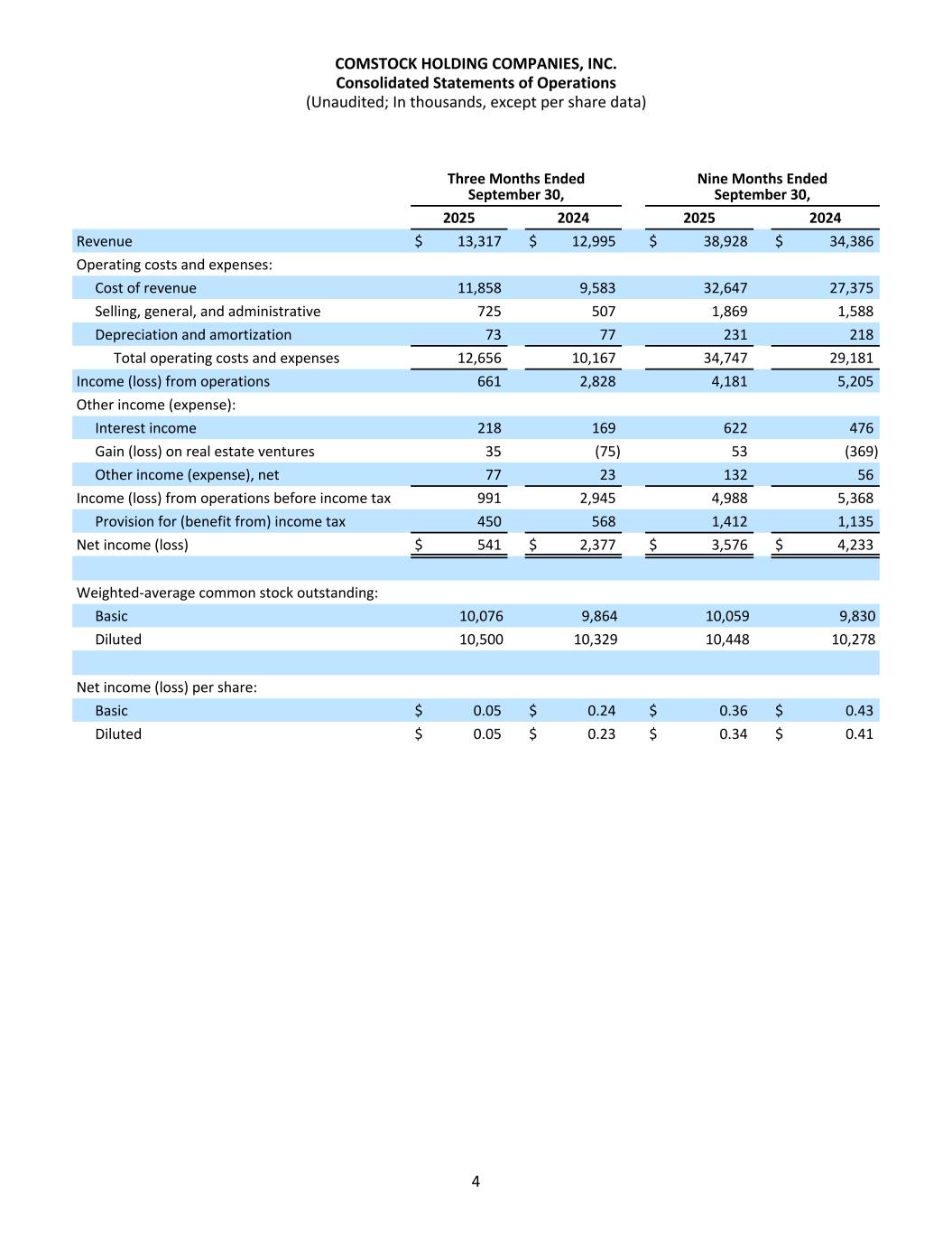 Three Months Ended September 30, Nine Months Ended September 30, 2025 2024 2025 2024 Revenue $ 13,317 $ 12,995 $ 38,928 $ 34,386 Operating costs and expenses: Cost of revenue 11,858 9,583 32,647 27,375 Selling, general, and administrative 725 507 1,869 1,588 Depreciation and amortization 73 77 231 218 Total operating costs and expenses 12,656 10,167 34,747 29,181 Income (loss) from operations 661 2,828 4,181 5,205 Other income (expense): Interest income 218 169 622 476 Gain (loss) on real estate ventures 35 (75) 53 (369) Other income (expense), net 77 23 132 56 Income (loss) from operations before income tax 991 2,945 4,988 5,368 Provision for (benefit from) income tax 450 568 1,412 1,135 Net income (loss) $ 541 $ 2,377 $ 3,576 $ 4,233 Weighted-average common stock outstanding: Basic 10,076 9,864 10,059 9,830 Diluted 10,500 10,329 10,448 10,278 Net income (loss) per share: Basic $ 0.05 $ 0.24 $ 0.36 $ 0.43 Diluted $ 0.05 $ 0.23 $ 0.34 $ 0.41 COMSTOCK HOLDING COMPANIES, INC. Consolidated Statements of Operations (Unaudited; In thousands, except per share data) 4