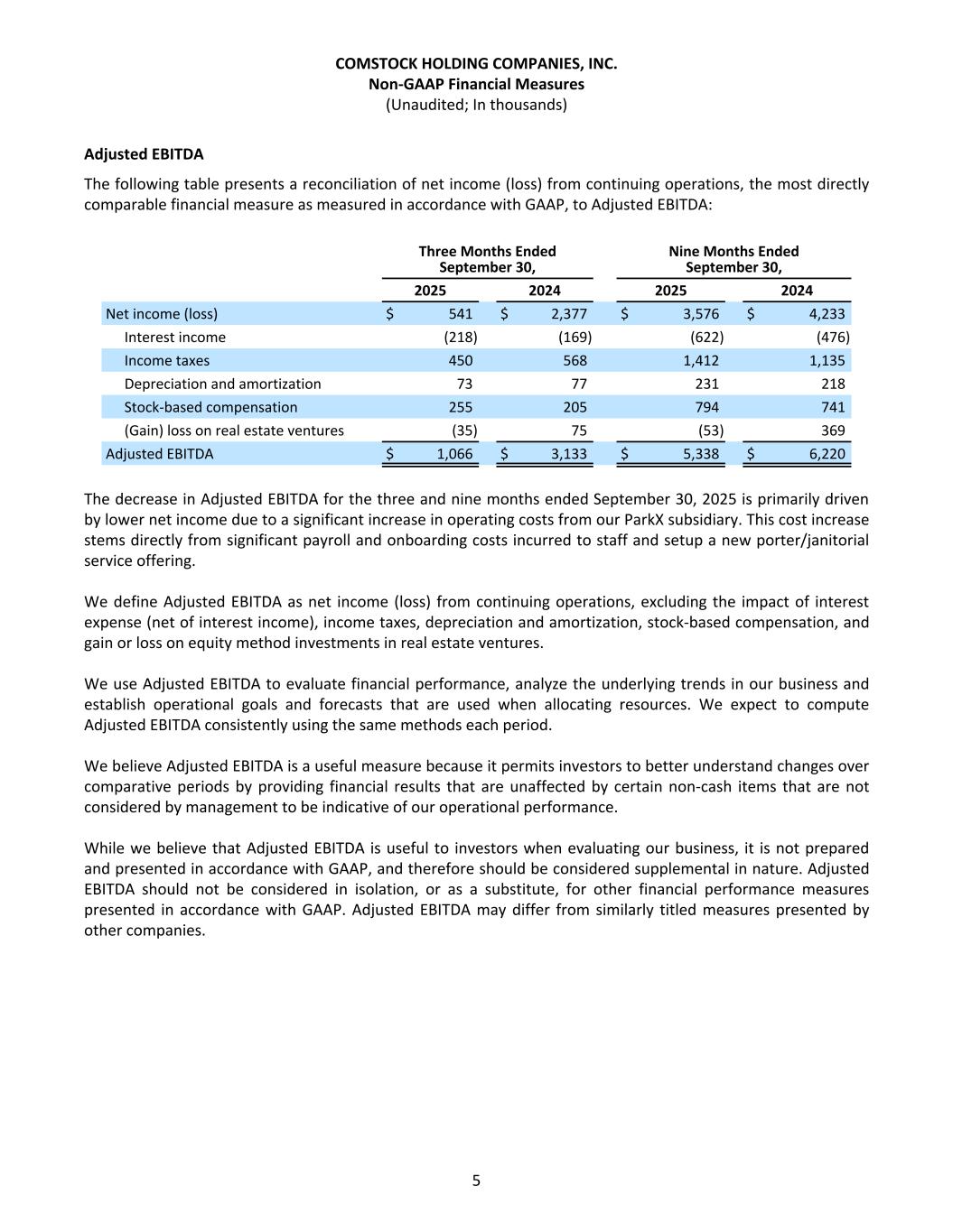 Adjusted EBITDA The following table presents a reconciliation of net income (loss) from continuing operations, the most directly comparable financial measure as measured in accordance with GAAP, to Adjusted EBITDA: Three Months Ended September 30, Nine Months Ended September 30, 2025 2024 2025 2024 Net income (loss) $ 541 $ 2,377 $ 3,576 $ 4,233 Interest income (218) (169) (622) (476) Income taxes 450 568 1,412 1,135 Depreciation and amortization 73 77 231 218 Stock-based compensation 255 205 794 741 (Gain) loss on real estate ventures (35) 75 (53) 369 Adjusted EBITDA $ 1,066 $ 3,133 $ 5,338 $ 6,220 The decrease in Adjusted EBITDA for the three and nine months ended September 30, 2025 is primarily driven by lower net income due to a significant increase in operating costs from our ParkX subsidiary. This cost increase stems directly from significant payroll and onboarding costs incurred to staff and setup a new porter/janitorial service offering. We define Adjusted EBITDA as net income (loss) from continuing operations, excluding the impact of interest expense (net of interest income), income taxes, depreciation and amortization, stock-based compensation, and gain or loss on equity method investments in real estate ventures. We use Adjusted EBITDA to evaluate financial performance, analyze the underlying trends in our business and establish operational goals and forecasts that are used when allocating resources. We expect to compute Adjusted EBITDA consistently using the same methods each period. We believe Adjusted EBITDA is a useful measure because it permits investors to better understand changes over comparative periods by providing financial results that are unaffected by certain non-cash items that are not considered by management to be indicative of our operational performance. While we believe that Adjusted EBITDA is useful to investors when evaluating our business, it is not prepared and presented in accordance with GAAP, and therefore should be considered supplemental in nature. Adjusted EBITDA should not be considered in isolation, or as a substitute, for other financial performance measures presented in accordance with GAAP. Adjusted EBITDA may differ from similarly titled measures presented by other companies. COMSTOCK HOLDING COMPANIES, INC. Non-GAAP Financial Measures (Unaudited; In thousands) 5
