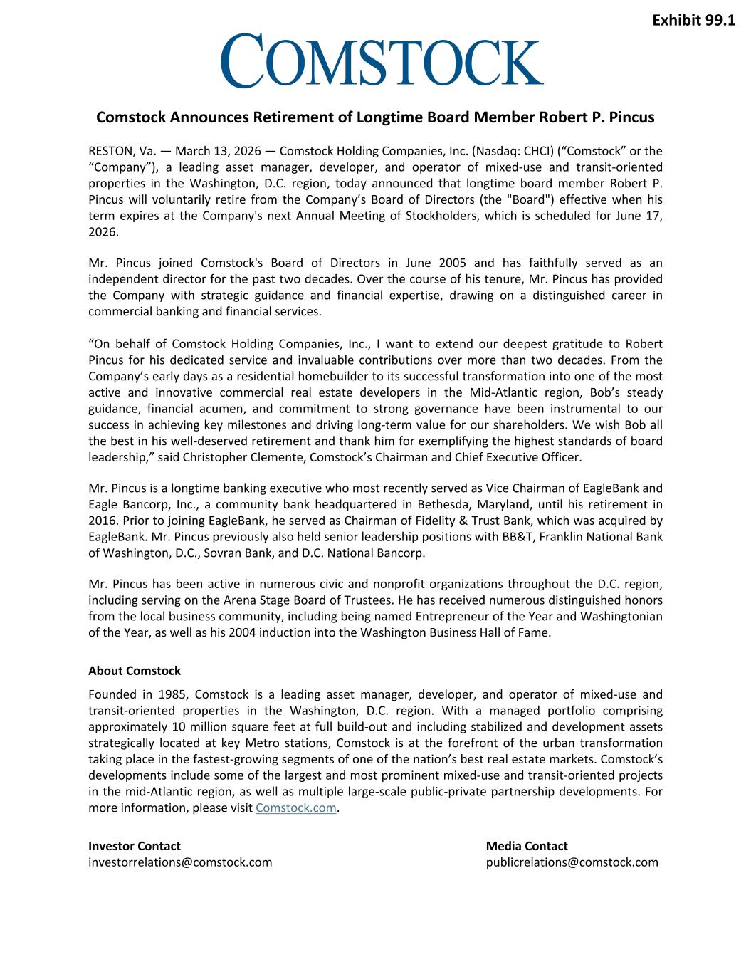 Comstock Announces Retirement of Longtime Board Member Robert P. Pincus RESTON, Va. — March 13, 2026 — Comstock Holding Companies, Inc. (Nasdaq: CHCI) (“Comstock” or the “Company”), a leading asset manager, developer, and operator of mixed-use and transit-oriented properties in the Washington, D.C. region, today announced that longtime board member Robert P. Pincus will voluntarily retire from the Company’s Board of Directors (the "Board") effective when his term expires at the Company's next Annual Meeting of Stockholders, which is scheduled for June 17, 2026. Mr. Pincus joined Comstock's Board of Directors in June 2005 and has faithfully served as an independent director for the past two decades. Over the course of his tenure, Mr. Pincus has provided the Company with strategic guidance and financial expertise, drawing on a distinguished career in commercial banking and financial services. “On behalf of Comstock Holding Companies, Inc., I want to extend our deepest gratitude to Robert Pincus for his dedicated service and invaluable contributions over more than two decades. From the Company’s early days as a residential homebuilder to its successful transformation into one of the most active and innovative commercial real estate developers in the Mid-Atlantic region, Bob’s steady guidance, financial acumen, and commitment to strong governance have been instrumental to our success in achieving key milestones and driving long-term value for our shareholders. We wish Bob all the best in his well-deserved retirement and thank him for exemplifying the highest standards of board leadership,” said Christopher Clemente, Comstock’s Chairman and Chief Executive Officer. Mr. Pincus is a longtime banking executive who most recently served as Vice Chairman of EagleBank and Eagle Bancorp, Inc., a community bank headquartered in Bethesda, Maryland, until his retirement in 2016. Prior to joining EagleBank, he served as Chairman of Fidelity & Trust Bank, which was acquired by EagleBank. Mr. Pincus previously also held senior leadership positions with BB&T, Franklin National Bank of Washington, D.C., Sovran Bank, and D.C. National Bancorp. Mr. Pincus has been active in numerous civic and nonprofit organizations throughout the D.C. region, including serving on the Arena Stage Board of Trustees. He has received numerous distinguished honors from the local business community, including being named Entrepreneur of the Year and Washingtonian of the Year, as well as his 2004 induction into the Washington Business Hall of Fame. About Comstock Founded in 1985, Comstock is a leading asset manager, developer, and operator of mixed-use and transit-oriented properties in the Washington, D.C. region. With a managed portfolio comprising approximately 10 million square feet at full build-out and including stabilized and development assets strategically located at key Metro stations, Comstock is at the forefront of the urban transformation taking place in the fastest-growing segments of one of the nation’s best real estate markets. Comstock’s developments include some of the largest and most prominent mixed-use and transit-oriented projects in the mid-Atlantic region, as well as multiple large-scale public-private partnership developments. For more information, please visit Comstock.com. Investor Contact Media Contact investorrelations@comstock.com publicrelations@comstock.com Exhibit 99.1