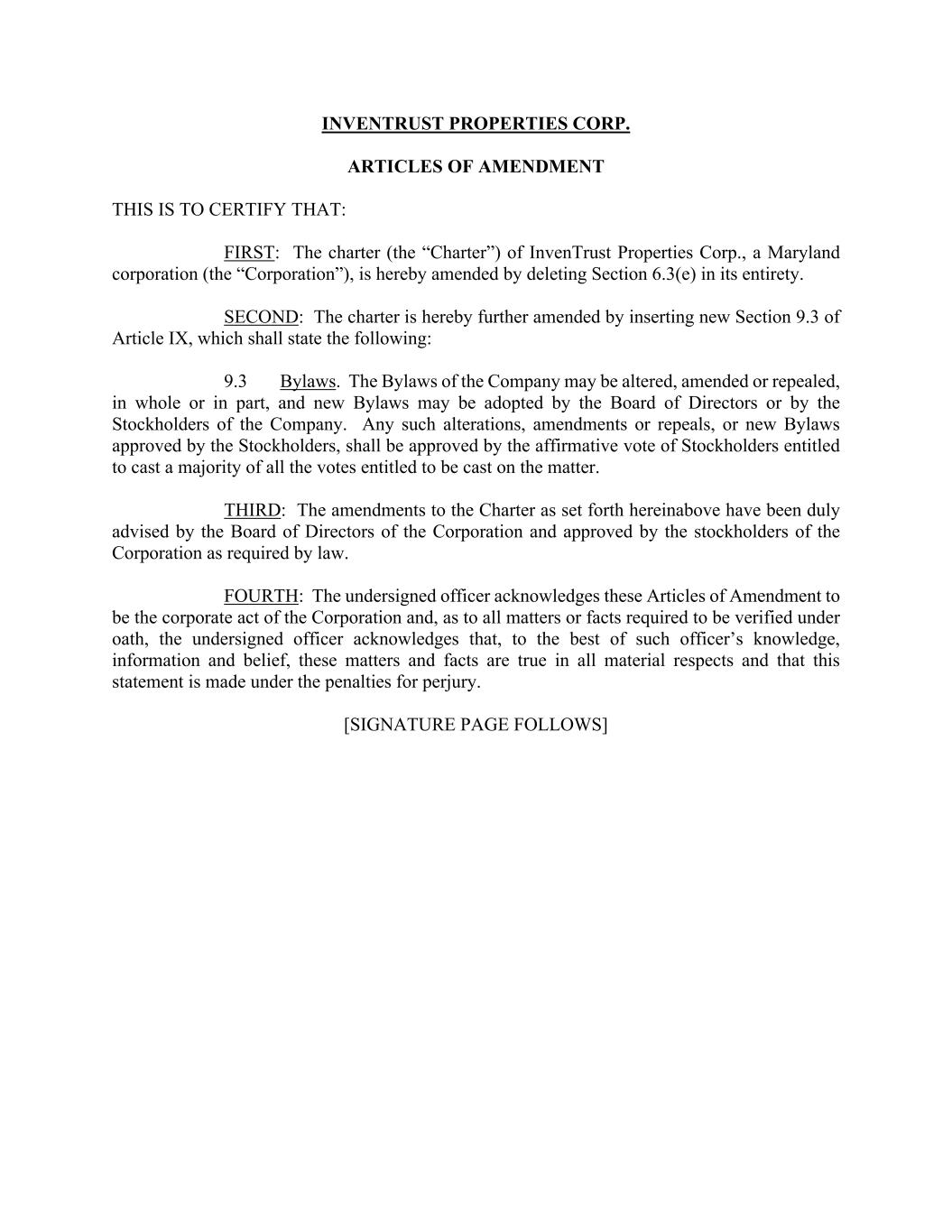 INVENTRUST PROPERTIES CORP. ARTICLES OF AMENDMENT THIS IS TO CERTIFY THAT: FIRST: The charter (the “Charter”) of InvenTrust Properties Corp., a Maryland corporation (the “Corporation”), is hereby amended by deleting Section 6.3(e) in its entirety. SECOND: The charter is hereby further amended by inserting new Section 9.3 of Article IX, which shall state the following: 9.3 Bylaws. The Bylaws of the Company may be altered, amended or repealed, in whole or in part, and new Bylaws may be adopted by the Board of Directors or by the Stockholders of the Company. Any such alterations, amendments or repeals, or new Bylaws approved by the Stockholders, shall be approved by the affirmative vote of Stockholders entitled to cast a majority of all the votes entitled to be cast on the matter. THIRD: The amendments to the Charter as set forth hereinabove have been duly advised by the Board of Directors of the Corporation and approved by the stockholders of the Corporation as required by law. FOURTH: The undersigned officer acknowledges these Articles of Amendment to be the corporate act of the Corporation and, as to all matters or facts required to be verified under oath, the undersigned officer acknowledges that, to the best of such officer’s knowledge, information and belief, these matters and facts are true in all material respects and that this statement is made under the penalties for perjury. [SIGNATURE PAGE FOLLOWS]