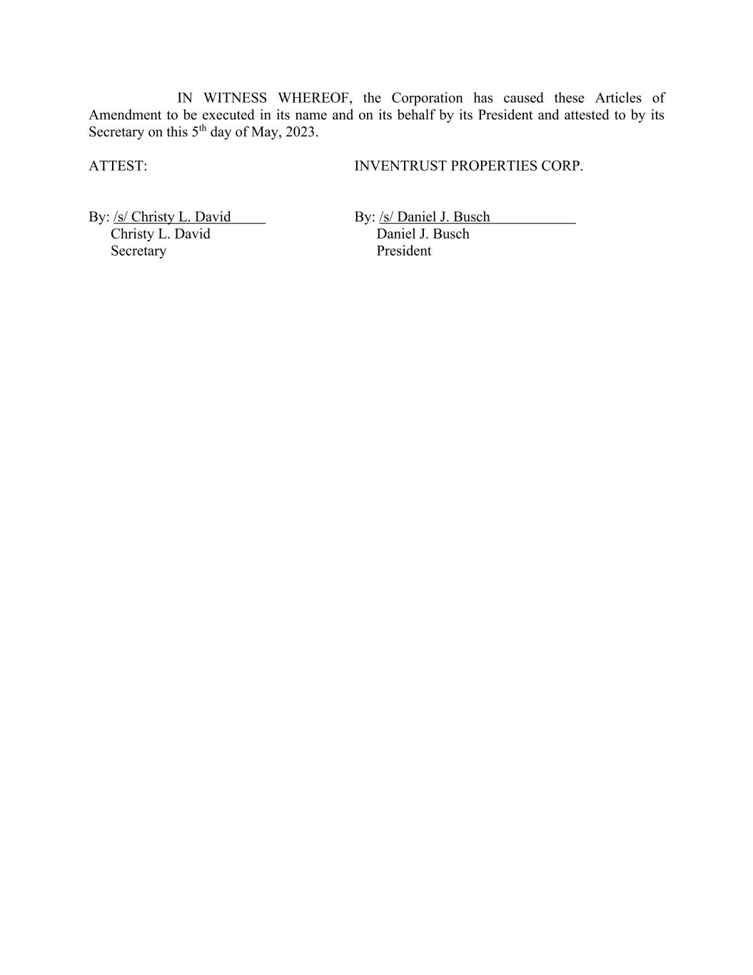 IN WITNESS WHEREOF, the Corporation has caused these Articles of Amendment to be executed in its name and on its behalf by its President and attested to by its Secretary on this 5th day of May, 2023. ATTEST: INVENTRUST PROPERTIES CORP. By: /s/ Christy L. David By: /s/ Daniel J. Busch Christy L. David Daniel J. Busch Secretary President