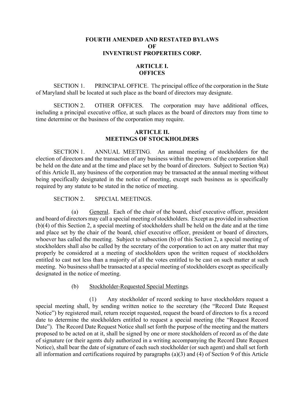 FOURTH AMENDED AND RESTATED BYLAWS OF INVENTRUST PROPERTIES CORP. ARTICLE I. OFFICES SECTION 1. PRINCIPAL OFFICE. The principal office of the corporation in the State of Maryland shall be located at such place as the board of directors may designate. SECTION 2. OTHER OFFICES. The corporation may have additional offices, including a principal executive office, at such places as the board of directors may from time to time determine or the business of the corporation may require. ARTICLE II. MEETINGS OF STOCKHOLDERS SECTION 1. ANNUAL MEETING. An annual meeting of stockholders for the election of directors and the transaction of any business within the powers of the corporation shall be held on the date and at the time and place set by the board of directors. Subject to Section 9(a) of this Article II, any business of the corporation may be transacted at the annual meeting without being specifically designated in the notice of meeting, except such business as is specifically required by any statute to be stated in the notice of meeting. SECTION 2. SPECIAL MEETINGS. (a) General. Each of the chair of the board, chief executive officer, president and board of directors may call a special meeting of stockholders. Except as provided in subsection (b)(4) of this Section 2, a special meeting of stockholders shall be held on the date and at the time and place set by the chair of the board, chief executive officer, president or board of directors, whoever has called the meeting. Subject to subsection (b) of this Section 2, a special meeting of stockholders shall also be called by the secretary of the corporation to act on any matter that may properly be considered at a meeting of stockholders upon the written request of stockholders entitled to cast not less than a majority of all the votes entitled to be cast on such matter at such meeting. No business shall be transacted at a special meeting of stockholders except as specifically designated in the notice of meeting. (b) Stockholder-Requested Special Meetings. (1) Any stockholder of record seeking to have stockholders request a special meeting shall, by sending written notice to the secretary (the “Record Date Request Notice”) by registered mail, return receipt requested, request the board of directors to fix a record date to determine the stockholders entitled to request a special meeting (the “Request Record Date”). The Record Date Request Notice shall set forth the purpose of the meeting and the matters proposed to be acted on at it, shall be signed by one or more stockholders of record as of the date of signature (or their agents duly authorized in a writing accompanying the Record Date Request Notice), shall bear the date of signature of each such stockholder (or such agent) and shall set forth all information and certifications required by paragraphs (a)(3) and (4) of Section 9 of this Article