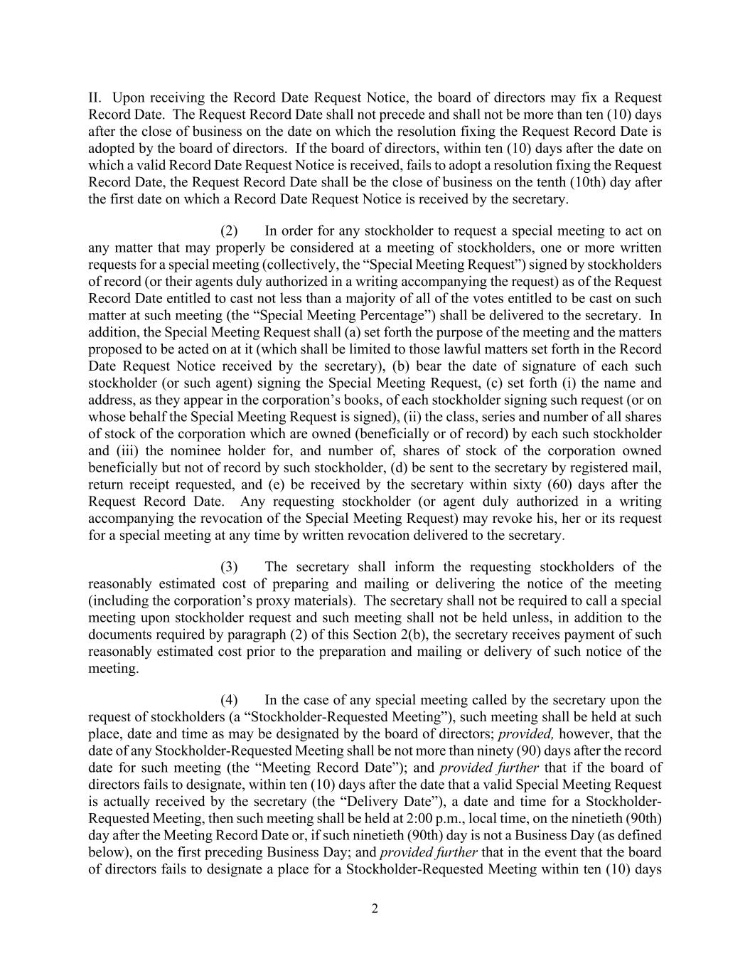2 II. Upon receiving the Record Date Request Notice, the board of directors may fix a Request Record Date. The Request Record Date shall not precede and shall not be more than ten (10) days after the close of business on the date on which the resolution fixing the Request Record Date is adopted by the board of directors. If the board of directors, within ten (10) days after the date on which a valid Record Date Request Notice is received, fails to adopt a resolution fixing the Request Record Date, the Request Record Date shall be the close of business on the tenth (10th) day after the first date on which a Record Date Request Notice is received by the secretary. (2) In order for any stockholder to request a special meeting to act on any matter that may properly be considered at a meeting of stockholders, one or more written requests for a special meeting (collectively, the “Special Meeting Request”) signed by stockholders of record (or their agents duly authorized in a writing accompanying the request) as of the Request Record Date entitled to cast not less than a majority of all of the votes entitled to be cast on such matter at such meeting (the “Special Meeting Percentage”) shall be delivered to the secretary. In addition, the Special Meeting Request shall (a) set forth the purpose of the meeting and the matters proposed to be acted on at it (which shall be limited to those lawful matters set forth in the Record Date Request Notice received by the secretary), (b) bear the date of signature of each such stockholder (or such agent) signing the Special Meeting Request, (c) set forth (i) the name and address, as they appear in the corporation’s books, of each stockholder signing such request (or on whose behalf the Special Meeting Request is signed), (ii) the class, series and number of all shares of stock of the corporation which are owned (beneficially or of record) by each such stockholder and (iii) the nominee holder for, and number of, shares of stock of the corporation owned beneficially but not of record by such stockholder, (d) be sent to the secretary by registered mail, return receipt requested, and (e) be received by the secretary within sixty (60) days after the Request Record Date. Any requesting stockholder (or agent duly authorized in a writing accompanying the revocation of the Special Meeting Request) may revoke his, her or its request for a special meeting at any time by written revocation delivered to the secretary. (3) The secretary shall inform the requesting stockholders of the reasonably estimated cost of preparing and mailing or delivering the notice of the meeting (including the corporation’s proxy materials). The secretary shall not be required to call a special meeting upon stockholder request and such meeting shall not be held unless, in addition to the documents required by paragraph (2) of this Section 2(b), the secretary receives payment of such reasonably estimated cost prior to the preparation and mailing or delivery of such notice of the meeting. (4) In the case of any special meeting called by the secretary upon the request of stockholders (a “Stockholder-Requested Meeting”), such meeting shall be held at such place, date and time as may be designated by the board of directors; provided, however, that the date of any Stockholder-Requested Meeting shall be not more than ninety (90) days after the record date for such meeting (the “Meeting Record Date”); and provided further that if the board of directors fails to designate, within ten (10) days after the date that a valid Special Meeting Request is actually received by the secretary (the “Delivery Date”), a date and time for a Stockholder- Requested Meeting, then such meeting shall be held at 2:00 p.m., local time, on the ninetieth (90th) day after the Meeting Record Date or, if such ninetieth (90th) day is not a Business Day (as defined below), on the first preceding Business Day; and provided further that in the event that the board of directors fails to designate a place for a Stockholder-Requested Meeting within ten (10) days