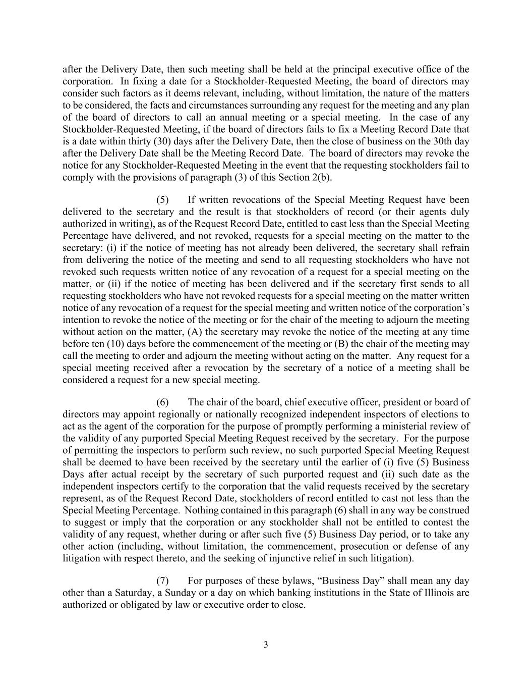 3 after the Delivery Date, then such meeting shall be held at the principal executive office of the corporation. In fixing a date for a Stockholder-Requested Meeting, the board of directors may consider such factors as it deems relevant, including, without limitation, the nature of the matters to be considered, the facts and circumstances surrounding any request for the meeting and any plan of the board of directors to call an annual meeting or a special meeting. In the case of any Stockholder-Requested Meeting, if the board of directors fails to fix a Meeting Record Date that is a date within thirty (30) days after the Delivery Date, then the close of business on the 30th day after the Delivery Date shall be the Meeting Record Date. The board of directors may revoke the notice for any Stockholder-Requested Meeting in the event that the requesting stockholders fail to comply with the provisions of paragraph (3) of this Section 2(b). (5) If written revocations of the Special Meeting Request have been delivered to the secretary and the result is that stockholders of record (or their agents duly authorized in writing), as of the Request Record Date, entitled to cast less than the Special Meeting Percentage have delivered, and not revoked, requests for a special meeting on the matter to the secretary: (i) if the notice of meeting has not already been delivered, the secretary shall refrain from delivering the notice of the meeting and send to all requesting stockholders who have not revoked such requests written notice of any revocation of a request for a special meeting on the matter, or (ii) if the notice of meeting has been delivered and if the secretary first sends to all requesting stockholders who have not revoked requests for a special meeting on the matter written notice of any revocation of a request for the special meeting and written notice of the corporation’s intention to revoke the notice of the meeting or for the chair of the meeting to adjourn the meeting without action on the matter, (A) the secretary may revoke the notice of the meeting at any time before ten (10) days before the commencement of the meeting or (B) the chair of the meeting may call the meeting to order and adjourn the meeting without acting on the matter. Any request for a special meeting received after a revocation by the secretary of a notice of a meeting shall be considered a request for a new special meeting. (6) The chair of the board, chief executive officer, president or board of directors may appoint regionally or nationally recognized independent inspectors of elections to act as the agent of the corporation for the purpose of promptly performing a ministerial review of the validity of any purported Special Meeting Request received by the secretary. For the purpose of permitting the inspectors to perform such review, no such purported Special Meeting Request shall be deemed to have been received by the secretary until the earlier of (i) five (5) Business Days after actual receipt by the secretary of such purported request and (ii) such date as the independent inspectors certify to the corporation that the valid requests received by the secretary represent, as of the Request Record Date, stockholders of record entitled to cast not less than the Special Meeting Percentage. Nothing contained in this paragraph (6) shall in any way be construed to suggest or imply that the corporation or any stockholder shall not be entitled to contest the validity of any request, whether during or after such five (5) Business Day period, or to take any other action (including, without limitation, the commencement, prosecution or defense of any litigation with respect thereto, and the seeking of injunctive relief in such litigation). (7) For purposes of these bylaws, “Business Day” shall mean any day other than a Saturday, a Sunday or a day on which banking institutions in the State of Illinois are authorized or obligated by law or executive order to close.