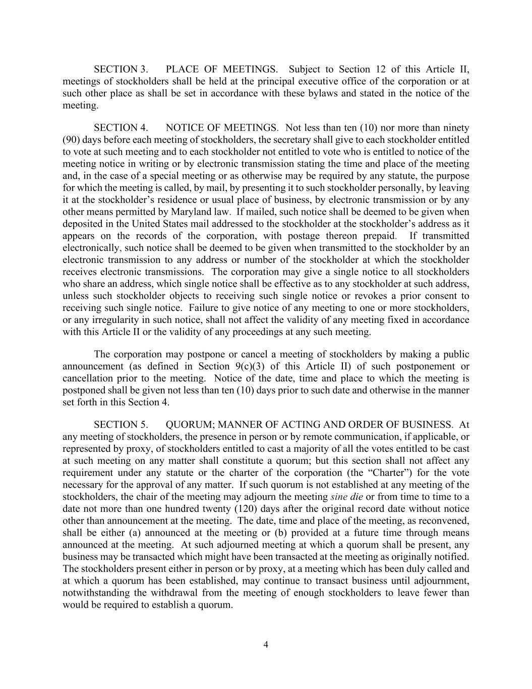 4 SECTION 3. PLACE OF MEETINGS. Subject to Section 12 of this Article II, meetings of stockholders shall be held at the principal executive office of the corporation or at such other place as shall be set in accordance with these bylaws and stated in the notice of the meeting. SECTION 4. NOTICE OF MEETINGS. Not less than ten (10) nor more than ninety (90) days before each meeting of stockholders, the secretary shall give to each stockholder entitled to vote at such meeting and to each stockholder not entitled to vote who is entitled to notice of the meeting notice in writing or by electronic transmission stating the time and place of the meeting and, in the case of a special meeting or as otherwise may be required by any statute, the purpose for which the meeting is called, by mail, by presenting it to such stockholder personally, by leaving it at the stockholder’s residence or usual place of business, by electronic transmission or by any other means permitted by Maryland law. If mailed, such notice shall be deemed to be given when deposited in the United States mail addressed to the stockholder at the stockholder’s address as it appears on the records of the corporation, with postage thereon prepaid. If transmitted electronically, such notice shall be deemed to be given when transmitted to the stockholder by an electronic transmission to any address or number of the stockholder at which the stockholder receives electronic transmissions. The corporation may give a single notice to all stockholders who share an address, which single notice shall be effective as to any stockholder at such address, unless such stockholder objects to receiving such single notice or revokes a prior consent to receiving such single notice. Failure to give notice of any meeting to one or more stockholders, or any irregularity in such notice, shall not affect the validity of any meeting fixed in accordance with this Article II or the validity of any proceedings at any such meeting. The corporation may postpone or cancel a meeting of stockholders by making a public announcement (as defined in Section 9(c)(3) of this Article II) of such postponement or cancellation prior to the meeting. Notice of the date, time and place to which the meeting is postponed shall be given not less than ten (10) days prior to such date and otherwise in the manner set forth in this Section 4. SECTION 5. QUORUM; MANNER OF ACTING AND ORDER OF BUSINESS. At any meeting of stockholders, the presence in person or by remote communication, if applicable, or represented by proxy, of stockholders entitled to cast a majority of all the votes entitled to be cast at such meeting on any matter shall constitute a quorum; but this section shall not affect any requirement under any statute or the charter of the corporation (the “Charter”) for the vote necessary for the approval of any matter. If such quorum is not established at any meeting of the stockholders, the chair of the meeting may adjourn the meeting sine die or from time to time to a date not more than one hundred twenty (120) days after the original record date without notice other than announcement at the meeting. The date, time and place of the meeting, as reconvened, shall be either (a) announced at the meeting or (b) provided at a future time through means announced at the meeting. At such adjourned meeting at which a quorum shall be present, any business may be transacted which might have been transacted at the meeting as originally notified. The stockholders present either in person or by proxy, at a meeting which has been duly called and at which a quorum has been established, may continue to transact business until adjournment, notwithstanding the withdrawal from the meeting of enough stockholders to leave fewer than would be required to establish a quorum.