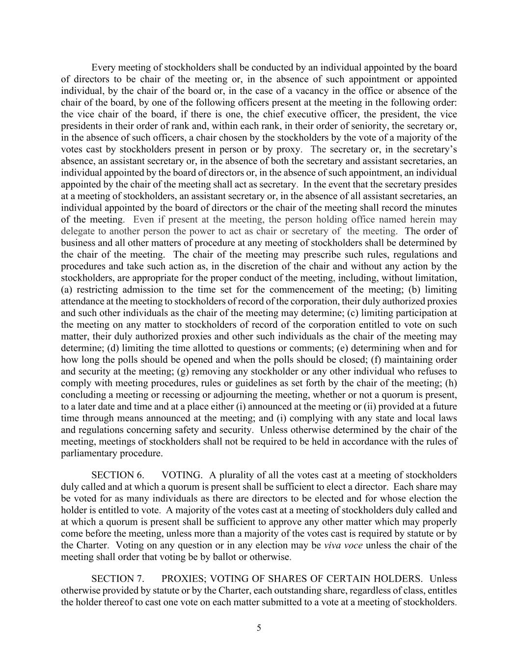 5 Every meeting of stockholders shall be conducted by an individual appointed by the board of directors to be chair of the meeting or, in the absence of such appointment or appointed individual, by the chair of the board or, in the case of a vacancy in the office or absence of the chair of the board, by one of the following officers present at the meeting in the following order: the vice chair of the board, if there is one, the chief executive officer, the president, the vice presidents in their order of rank and, within each rank, in their order of seniority, the secretary or, in the absence of such officers, a chair chosen by the stockholders by the vote of a majority of the votes cast by stockholders present in person or by proxy. The secretary or, in the secretary’s absence, an assistant secretary or, in the absence of both the secretary and assistant secretaries, an individual appointed by the board of directors or, in the absence of such appointment, an individual appointed by the chair of the meeting shall act as secretary. In the event that the secretary presides at a meeting of stockholders, an assistant secretary or, in the absence of all assistant secretaries, an individual appointed by the board of directors or the chair of the meeting shall record the minutes of the meeting. Even if present at the meeting, the person holding office named herein may delegate to another person the power to act as chair or secretary of the meeting. The order of business and all other matters of procedure at any meeting of stockholders shall be determined by the chair of the meeting. The chair of the meeting may prescribe such rules, regulations and procedures and take such action as, in the discretion of the chair and without any action by the stockholders, are appropriate for the proper conduct of the meeting, including, without limitation, (a) restricting admission to the time set for the commencement of the meeting; (b) limiting attendance at the meeting to stockholders of record of the corporation, their duly authorized proxies and such other individuals as the chair of the meeting may determine; (c) limiting participation at the meeting on any matter to stockholders of record of the corporation entitled to vote on such matter, their duly authorized proxies and other such individuals as the chair of the meeting may determine; (d) limiting the time allotted to questions or comments; (e) determining when and for how long the polls should be opened and when the polls should be closed; (f) maintaining order and security at the meeting; (g) removing any stockholder or any other individual who refuses to comply with meeting procedures, rules or guidelines as set forth by the chair of the meeting; (h) concluding a meeting or recessing or adjourning the meeting, whether or not a quorum is present, to a later date and time and at a place either (i) announced at the meeting or (ii) provided at a future time through means announced at the meeting; and (i) complying with any state and local laws and regulations concerning safety and security. Unless otherwise determined by the chair of the meeting, meetings of stockholders shall not be required to be held in accordance with the rules of parliamentary procedure. SECTION 6. VOTING. A plurality of all the votes cast at a meeting of stockholders duly called and at which a quorum is present shall be sufficient to elect a director. Each share may be voted for as many individuals as there are directors to be elected and for whose election the holder is entitled to vote. A majority of the votes cast at a meeting of stockholders duly called and at which a quorum is present shall be sufficient to approve any other matter which may properly come before the meeting, unless more than a majority of the votes cast is required by statute or by the Charter. Voting on any question or in any election may be viva voce unless the chair of the meeting shall order that voting be by ballot or otherwise. SECTION 7. PROXIES; VOTING OF SHARES OF CERTAIN HOLDERS. Unless otherwise provided by statute or by the Charter, each outstanding share, regardless of class, entitles the holder thereof to cast one vote on each matter submitted to a vote at a meeting of stockholders.