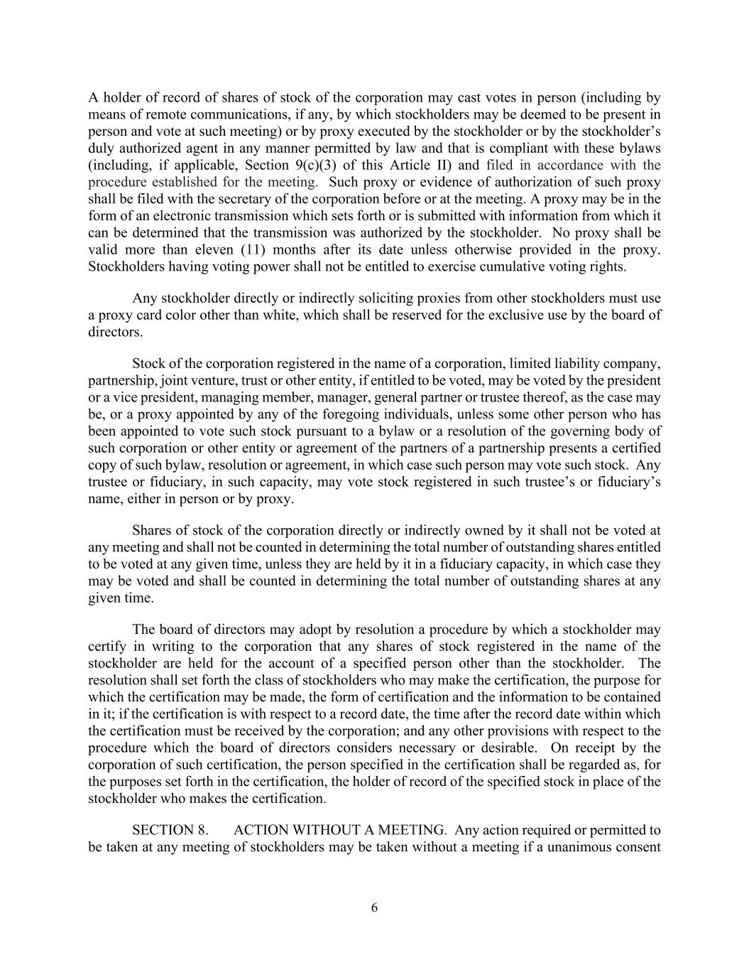 6 A holder of record of shares of stock of the corporation may cast votes in person (including by means of remote communications, if any, by which stockholders may be deemed to be present in person and vote at such meeting) or by proxy executed by the stockholder or by the stockholder’s duly authorized agent in any manner permitted by law and that is compliant with these bylaws (including, if applicable, Section 9(c)(3) of this Article II) and filed in accordance with the procedure established for the meeting. Such proxy or evidence of authorization of such proxy shall be filed with the secretary of the corporation before or at the meeting. A proxy may be in the form of an electronic transmission which sets forth or is submitted with information from which it can be determined that the transmission was authorized by the stockholder. No proxy shall be valid more than eleven (11) months after its date unless otherwise provided in the proxy. Stockholders having voting power shall not be entitled to exercise cumulative voting rights. Any stockholder directly or indirectly soliciting proxies from other stockholders must use a proxy card color other than white, which shall be reserved for the exclusive use by the board of directors. Stock of the corporation registered in the name of a corporation, limited liability company, partnership, joint venture, trust or other entity, if entitled to be voted, may be voted by the president or a vice president, managing member, manager, general partner or trustee thereof, as the case may be, or a proxy appointed by any of the foregoing individuals, unless some other person who has been appointed to vote such stock pursuant to a bylaw or a resolution of the governing body of such corporation or other entity or agreement of the partners of a partnership presents a certified copy of such bylaw, resolution or agreement, in which case such person may vote such stock. Any trustee or fiduciary, in such capacity, may vote stock registered in such trustee’s or fiduciary’s name, either in person or by proxy. Shares of stock of the corporation directly or indirectly owned by it shall not be voted at any meeting and shall not be counted in determining the total number of outstanding shares entitled to be voted at any given time, unless they are held by it in a fiduciary capacity, in which case they may be voted and shall be counted in determining the total number of outstanding shares at any given time. The board of directors may adopt by resolution a procedure by which a stockholder may certify in writing to the corporation that any shares of stock registered in the name of the stockholder are held for the account of a specified person other than the stockholder. The resolution shall set forth the class of stockholders who may make the certification, the purpose for which the certification may be made, the form of certification and the information to be contained in it; if the certification is with respect to a record date, the time after the record date within which the certification must be received by the corporation; and any other provisions with respect to the procedure which the board of directors considers necessary or desirable. On receipt by the corporation of such certification, the person specified in the certification shall be regarded as, for the purposes set forth in the certification, the holder of record of the specified stock in place of the stockholder who makes the certification. SECTION 8. ACTION WITHOUT A MEETING. Any action required or permitted to be taken at any meeting of stockholders may be taken without a meeting if a unanimous consent