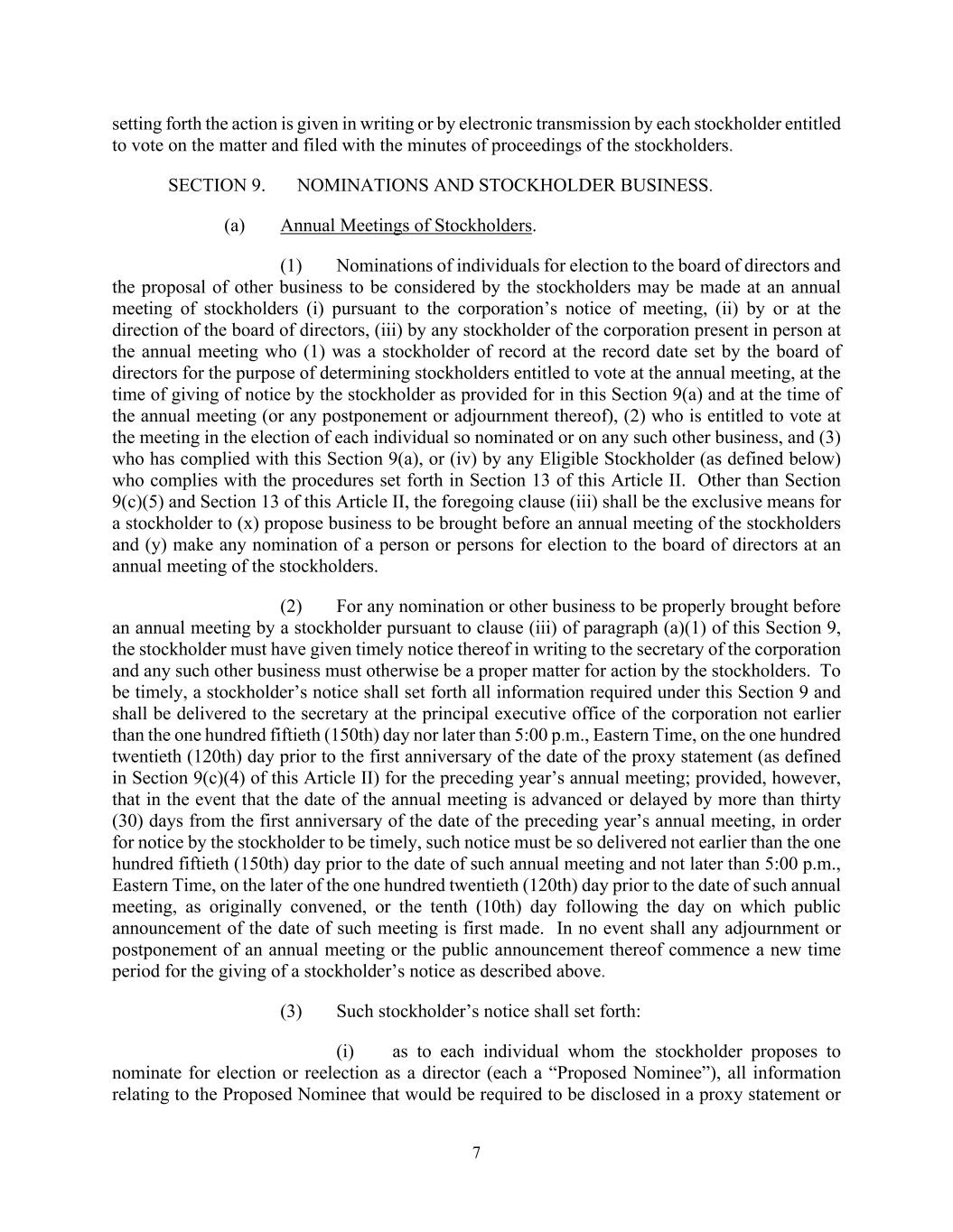 7 setting forth the action is given in writing or by electronic transmission by each stockholder entitled to vote on the matter and filed with the minutes of proceedings of the stockholders. SECTION 9. NOMINATIONS AND STOCKHOLDER BUSINESS. (a) Annual Meetings of Stockholders. (1) Nominations of individuals for election to the board of directors and the proposal of other business to be considered by the stockholders may be made at an annual meeting of stockholders (i) pursuant to the corporation’s notice of meeting, (ii) by or at the direction of the board of directors, (iii) by any stockholder of the corporation present in person at the annual meeting who (1) was a stockholder of record at the record date set by the board of directors for the purpose of determining stockholders entitled to vote at the annual meeting, at the time of giving of notice by the stockholder as provided for in this Section 9(a) and at the time of the annual meeting (or any postponement or adjournment thereof), (2) who is entitled to vote at the meeting in the election of each individual so nominated or on any such other business, and (3) who has complied with this Section 9(a), or (iv) by any Eligible Stockholder (as defined below) who complies with the procedures set forth in Section 13 of this Article II. Other than Section 9(c)(5) and Section 13 of this Article II, the foregoing clause (iii) shall be the exclusive means for a stockholder to (x) propose business to be brought before an annual meeting of the stockholders and (y) make any nomination of a person or persons for election to the board of directors at an annual meeting of the stockholders. (2) For any nomination or other business to be properly brought before an annual meeting by a stockholder pursuant to clause (iii) of paragraph (a)(1) of this Section 9, the stockholder must have given timely notice thereof in writing to the secretary of the corporation and any such other business must otherwise be a proper matter for action by the stockholders. To be timely, a stockholder’s notice shall set forth all information required under this Section 9 and shall be delivered to the secretary at the principal executive office of the corporation not earlier than the one hundred fiftieth (150th) day nor later than 5:00 p.m., Eastern Time, on the one hundred twentieth (120th) day prior to the first anniversary of the date of the proxy statement (as defined in Section 9(c)(4) of this Article II) for the preceding year’s annual meeting; provided, however, that in the event that the date of the annual meeting is advanced or delayed by more than thirty (30) days from the first anniversary of the date of the preceding year’s annual meeting, in order for notice by the stockholder to be timely, such notice must be so delivered not earlier than the one hundred fiftieth (150th) day prior to the date of such annual meeting and not later than 5:00 p.m., Eastern Time, on the later of the one hundred twentieth (120th) day prior to the date of such annual meeting, as originally convened, or the tenth (10th) day following the day on which public announcement of the date of such meeting is first made. In no event shall any adjournment or postponement of an annual meeting or the public announcement thereof commence a new time period for the giving of a stockholder’s notice as described above. (3) Such stockholder’s notice shall set forth: (i) as to each individual whom the stockholder proposes to nominate for election or reelection as a director (each a “Proposed Nominee”), all information relating to the Proposed Nominee that would be required to be disclosed in a proxy statement or