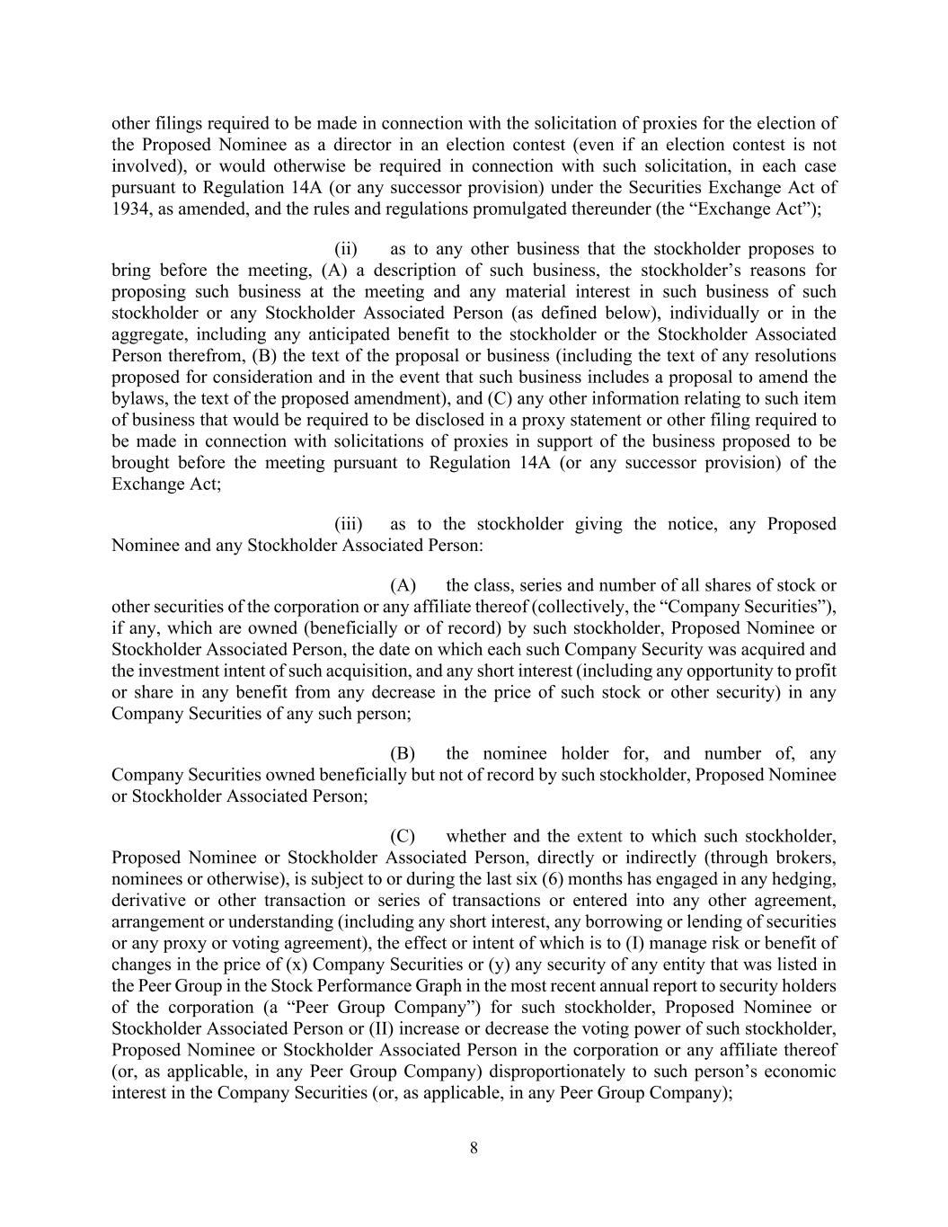 8 other filings required to be made in connection with the solicitation of proxies for the election of the Proposed Nominee as a director in an election contest (even if an election contest is not involved), or would otherwise be required in connection with such solicitation, in each case pursuant to Regulation 14A (or any successor provision) under the Securities Exchange Act of 1934, as amended, and the rules and regulations promulgated thereunder (the “Exchange Act”); (ii) as to any other business that the stockholder proposes to bring before the meeting, (A) a description of such business, the stockholder’s reasons for proposing such business at the meeting and any material interest in such business of such stockholder or any Stockholder Associated Person (as defined below), individually or in the aggregate, including any anticipated benefit to the stockholder or the Stockholder Associated Person therefrom, (B) the text of the proposal or business (including the text of any resolutions proposed for consideration and in the event that such business includes a proposal to amend the bylaws, the text of the proposed amendment), and (C) any other information relating to such item of business that would be required to be disclosed in a proxy statement or other filing required to be made in connection with solicitations of proxies in support of the business proposed to be brought before the meeting pursuant to Regulation 14A (or any successor provision) of the Exchange Act; (iii) as to the stockholder giving the notice, any Proposed Nominee and any Stockholder Associated Person: (A) the class, series and number of all shares of stock or other securities of the corporation or any affiliate thereof (collectively, the “Company Securities”), if any, which are owned (beneficially or of record) by such stockholder, Proposed Nominee or Stockholder Associated Person, the date on which each such Company Security was acquired and the investment intent of such acquisition, and any short interest (including any opportunity to profit or share in any benefit from any decrease in the price of such stock or other security) in any Company Securities of any such person; (B) the nominee holder for, and number of, any Company Securities owned beneficially but not of record by such stockholder, Proposed Nominee or Stockholder Associated Person; (C) whether and the extent to which such stockholder, Proposed Nominee or Stockholder Associated Person, directly or indirectly (through brokers, nominees or otherwise), is subject to or during the last six (6) months has engaged in any hedging, derivative or other transaction or series of transactions or entered into any other agreement, arrangement or understanding (including any short interest, any borrowing or lending of securities or any proxy or voting agreement), the effect or intent of which is to (I) manage risk or benefit of changes in the price of (x) Company Securities or (y) any security of any entity that was listed in the Peer Group in the Stock Performance Graph in the most recent annual report to security holders of the corporation (a “Peer Group Company”) for such stockholder, Proposed Nominee or Stockholder Associated Person or (II) increase or decrease the voting power of such stockholder, Proposed Nominee or Stockholder Associated Person in the corporation or any affiliate thereof (or, as applicable, in any Peer Group Company) disproportionately to such person’s economic interest in the Company Securities (or, as applicable, in any Peer Group Company);