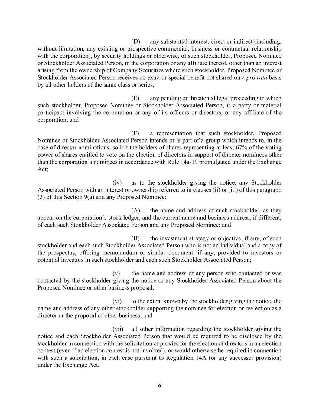 9 (D) any substantial interest, direct or indirect (including, without limitation, any existing or prospective commercial, business or contractual relationship with the corporation), by security holdings or otherwise, of such stockholder, Proposed Nominee or Stockholder Associated Person, in the corporation or any affiliate thereof, other than an interest arising from the ownership of Company Securities where such stockholder, Proposed Nominee or Stockholder Associated Person receives no extra or special benefit not shared on a pro rata basis by all other holders of the same class or series; (E) any pending or threatened legal proceeding in which such stockholder, Proposed Nominee or Stockholder Associated Person, is a party or material participant involving the corporation or any of its officers or directors, or any affiliate of the corporation; and (F) a representation that such stockholder, Proposed Nominee or Stockholder Associated Person intends or is part of a group which intends to, in the case of director nominations, solicit the holders of shares representing at least 67% of the voting power of shares entitled to vote on the election of directors in support of director nominees other than the corporation’s nominees in accordance with Rule 14a-19 promulgated under the Exchange Act; (iv) as to the stockholder giving the notice, any Stockholder Associated Person with an interest or ownership referred to in clauses (ii) or (iii) of this paragraph (3) of this Section 9(a) and any Proposed Nominee: (A) the name and address of such stockholder, as they appear on the corporation’s stock ledger, and the current name and business address, if different, of each such Stockholder Associated Person and any Proposed Nominee; and (B) the investment strategy or objective, if any, of such stockholder and each such Stockholder Associated Person who is not an individual and a copy of the prospectus, offering memorandum or similar document, if any, provided to investors or potential investors in such stockholder and each such Stockholder Associated Person; (v) the name and address of any person who contacted or was contacted by the stockholder giving the notice or any Stockholder Associated Person about the Proposed Nominee or other business proposal; (vi) to the extent known by the stockholder giving the notice, the name and address of any other stockholder supporting the nominee for election or reelection as a director or the proposal of other business; and (vii) all other information regarding the stockholder giving the notice and each Stockholder Associated Person that would be required to be disclosed by the stockholder in connection with the solicitation of proxies for the election of directors in an election contest (even if an election contest is not involved), or would otherwise be required in connection with such a solicitation, in each case pursuant to Regulation 14A (or any successor provision) under the Exchange Act.