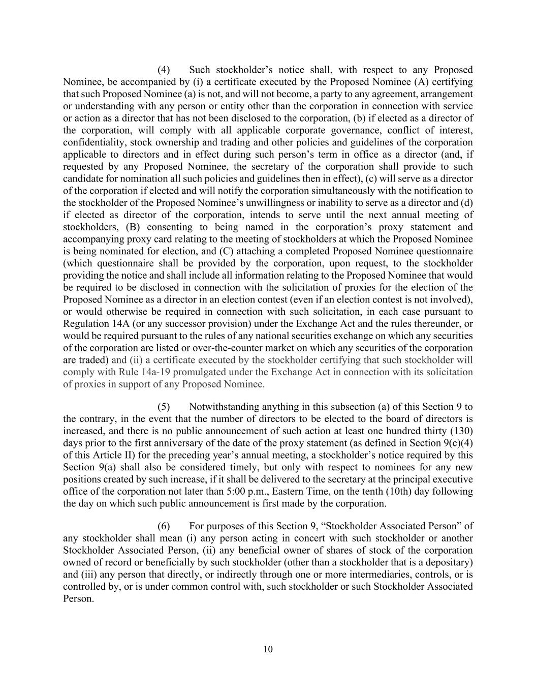 10 (4) Such stockholder’s notice shall, with respect to any Proposed Nominee, be accompanied by (i) a certificate executed by the Proposed Nominee (A) certifying that such Proposed Nominee (a) is not, and will not become, a party to any agreement, arrangement or understanding with any person or entity other than the corporation in connection with service or action as a director that has not been disclosed to the corporation, (b) if elected as a director of the corporation, will comply with all applicable corporate governance, conflict of interest, confidentiality, stock ownership and trading and other policies and guidelines of the corporation applicable to directors and in effect during such person’s term in office as a director (and, if requested by any Proposed Nominee, the secretary of the corporation shall provide to such candidate for nomination all such policies and guidelines then in effect), (c) will serve as a director of the corporation if elected and will notify the corporation simultaneously with the notification to the stockholder of the Proposed Nominee’s unwillingness or inability to serve as a director and (d) if elected as director of the corporation, intends to serve until the next annual meeting of stockholders, (B) consenting to being named in the corporation’s proxy statement and accompanying proxy card relating to the meeting of stockholders at which the Proposed Nominee is being nominated for election, and (C) attaching a completed Proposed Nominee questionnaire (which questionnaire shall be provided by the corporation, upon request, to the stockholder providing the notice and shall include all information relating to the Proposed Nominee that would be required to be disclosed in connection with the solicitation of proxies for the election of the Proposed Nominee as a director in an election contest (even if an election contest is not involved), or would otherwise be required in connection with such solicitation, in each case pursuant to Regulation 14A (or any successor provision) under the Exchange Act and the rules thereunder, or would be required pursuant to the rules of any national securities exchange on which any securities of the corporation are listed or over-the-counter market on which any securities of the corporation are traded) and (ii) a certificate executed by the stockholder certifying that such stockholder will comply with Rule 14a-19 promulgated under the Exchange Act in connection with its solicitation of proxies in support of any Proposed Nominee. (5) Notwithstanding anything in this subsection (a) of this Section 9 to the contrary, in the event that the number of directors to be elected to the board of directors is increased, and there is no public announcement of such action at least one hundred thirty (130) days prior to the first anniversary of the date of the proxy statement (as defined in Section 9(c)(4) of this Article II) for the preceding year’s annual meeting, a stockholder’s notice required by this Section 9(a) shall also be considered timely, but only with respect to nominees for any new positions created by such increase, if it shall be delivered to the secretary at the principal executive office of the corporation not later than 5:00 p.m., Eastern Time, on the tenth (10th) day following the day on which such public announcement is first made by the corporation. (6) For purposes of this Section 9, “Stockholder Associated Person” of any stockholder shall mean (i) any person acting in concert with such stockholder or another Stockholder Associated Person, (ii) any beneficial owner of shares of stock of the corporation owned of record or beneficially by such stockholder (other than a stockholder that is a depositary) and (iii) any person that directly, or indirectly through one or more intermediaries, controls, or is controlled by, or is under common control with, such stockholder or such Stockholder Associated Person.