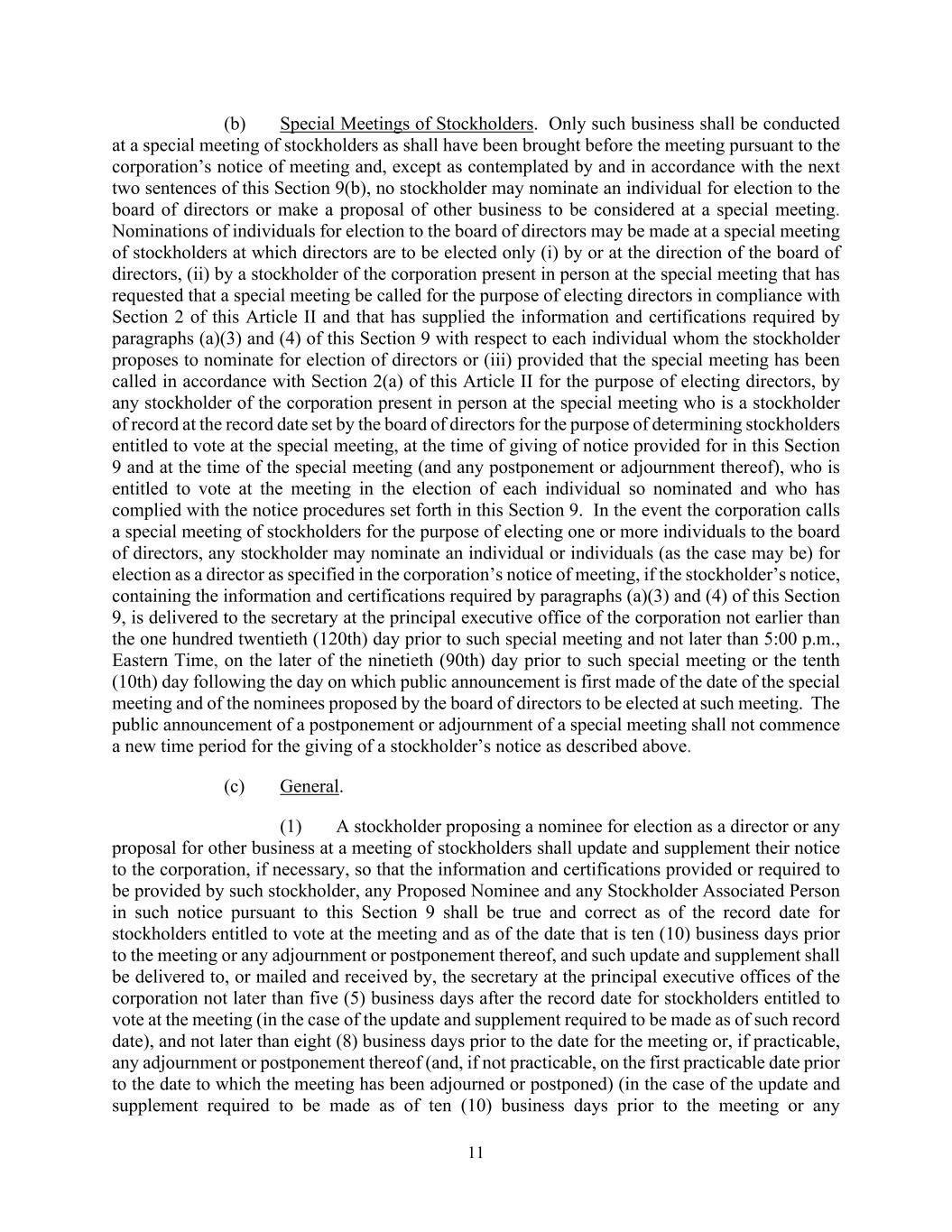 11 (b) Special Meetings of Stockholders. Only such business shall be conducted at a special meeting of stockholders as shall have been brought before the meeting pursuant to the corporation’s notice of meeting and, except as contemplated by and in accordance with the next two sentences of this Section 9(b), no stockholder may nominate an individual for election to the board of directors or make a proposal of other business to be considered at a special meeting. Nominations of individuals for election to the board of directors may be made at a special meeting of stockholders at which directors are to be elected only (i) by or at the direction of the board of directors, (ii) by a stockholder of the corporation present in person at the special meeting that has requested that a special meeting be called for the purpose of electing directors in compliance with Section 2 of this Article II and that has supplied the information and certifications required by paragraphs (a)(3) and (4) of this Section 9 with respect to each individual whom the stockholder proposes to nominate for election of directors or (iii) provided that the special meeting has been called in accordance with Section 2(a) of this Article II for the purpose of electing directors, by any stockholder of the corporation present in person at the special meeting who is a stockholder of record at the record date set by the board of directors for the purpose of determining stockholders entitled to vote at the special meeting, at the time of giving of notice provided for in this Section 9 and at the time of the special meeting (and any postponement or adjournment thereof), who is entitled to vote at the meeting in the election of each individual so nominated and who has complied with the notice procedures set forth in this Section 9. In the event the corporation calls a special meeting of stockholders for the purpose of electing one or more individuals to the board of directors, any stockholder may nominate an individual or individuals (as the case may be) for election as a director as specified in the corporation’s notice of meeting, if the stockholder’s notice, containing the information and certifications required by paragraphs (a)(3) and (4) of this Section 9, is delivered to the secretary at the principal executive office of the corporation not earlier than the one hundred twentieth (120th) day prior to such special meeting and not later than 5:00 p.m., Eastern Time, on the later of the ninetieth (90th) day prior to such special meeting or the tenth (10th) day following the day on which public announcement is first made of the date of the special meeting and of the nominees proposed by the board of directors to be elected at such meeting. The public announcement of a postponement or adjournment of a special meeting shall not commence a new time period for the giving of a stockholder’s notice as described above. (c) General. (1) A stockholder proposing a nominee for election as a director or any proposal for other business at a meeting of stockholders shall update and supplement their notice to the corporation, if necessary, so that the information and certifications provided or required to be provided by such stockholder, any Proposed Nominee and any Stockholder Associated Person in such notice pursuant to this Section 9 shall be true and correct as of the record date for stockholders entitled to vote at the meeting and as of the date that is ten (10) business days prior to the meeting or any adjournment or postponement thereof, and such update and supplement shall be delivered to, or mailed and received by, the secretary at the principal executive offices of the corporation not later than five (5) business days after the record date for stockholders entitled to vote at the meeting (in the case of the update and supplement required to be made as of such record date), and not later than eight (8) business days prior to the date for the meeting or, if practicable, any adjournment or postponement thereof (and, if not practicable, on the first practicable date prior to the date to which the meeting has been adjourned or postponed) (in the case of the update and supplement required to be made as of ten (10) business days prior to the meeting or any