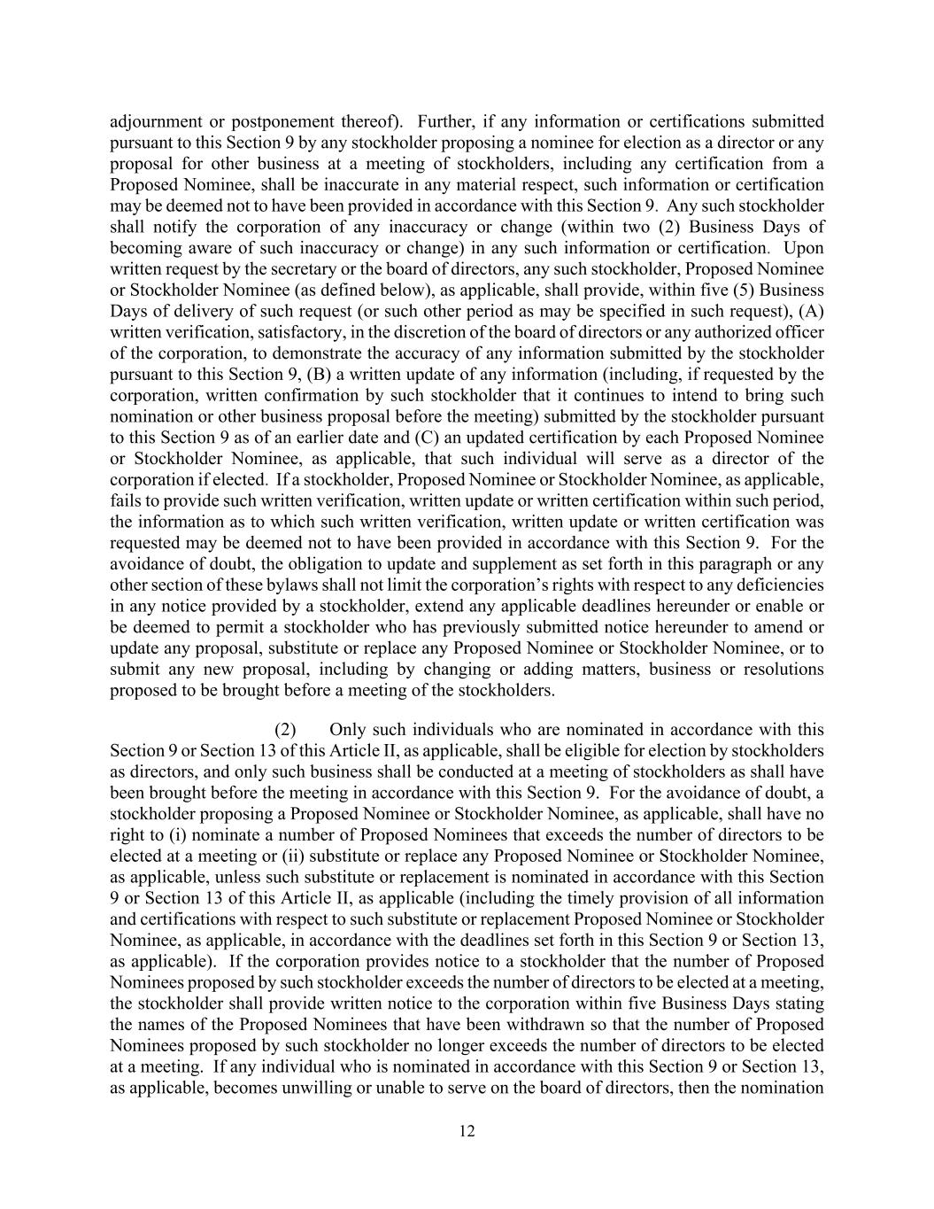 12 adjournment or postponement thereof). Further, if any information or certifications submitted pursuant to this Section 9 by any stockholder proposing a nominee for election as a director or any proposal for other business at a meeting of stockholders, including any certification from a Proposed Nominee, shall be inaccurate in any material respect, such information or certification may be deemed not to have been provided in accordance with this Section 9. Any such stockholder shall notify the corporation of any inaccuracy or change (within two (2) Business Days of becoming aware of such inaccuracy or change) in any such information or certification. Upon written request by the secretary or the board of directors, any such stockholder, Proposed Nominee or Stockholder Nominee (as defined below), as applicable, shall provide, within five (5) Business Days of delivery of such request (or such other period as may be specified in such request), (A) written verification, satisfactory, in the discretion of the board of directors or any authorized officer of the corporation, to demonstrate the accuracy of any information submitted by the stockholder pursuant to this Section 9, (B) a written update of any information (including, if requested by the corporation, written confirmation by such stockholder that it continues to intend to bring such nomination or other business proposal before the meeting) submitted by the stockholder pursuant to this Section 9 as of an earlier date and (C) an updated certification by each Proposed Nominee or Stockholder Nominee, as applicable, that such individual will serve as a director of the corporation if elected. If a stockholder, Proposed Nominee or Stockholder Nominee, as applicable, fails to provide such written verification, written update or written certification within such period, the information as to which such written verification, written update or written certification was requested may be deemed not to have been provided in accordance with this Section 9. For the avoidance of doubt, the obligation to update and supplement as set forth in this paragraph or any other section of these bylaws shall not limit the corporation’s rights with respect to any deficiencies in any notice provided by a stockholder, extend any applicable deadlines hereunder or enable or be deemed to permit a stockholder who has previously submitted notice hereunder to amend or update any proposal, substitute or replace any Proposed Nominee or Stockholder Nominee, or to submit any new proposal, including by changing or adding matters, business or resolutions proposed to be brought before a meeting of the stockholders. (2) Only such individuals who are nominated in accordance with this Section 9 or Section 13 of this Article II, as applicable, shall be eligible for election by stockholders as directors, and only such business shall be conducted at a meeting of stockholders as shall have been brought before the meeting in accordance with this Section 9. For the avoidance of doubt, a stockholder proposing a Proposed Nominee or Stockholder Nominee, as applicable, shall have no right to (i) nominate a number of Proposed Nominees that exceeds the number of directors to be elected at a meeting or (ii) substitute or replace any Proposed Nominee or Stockholder Nominee, as applicable, unless such substitute or replacement is nominated in accordance with this Section 9 or Section 13 of this Article II, as applicable (including the timely provision of all information and certifications with respect to such substitute or replacement Proposed Nominee or Stockholder Nominee, as applicable, in accordance with the deadlines set forth in this Section 9 or Section 13, as applicable). If the corporation provides notice to a stockholder that the number of Proposed Nominees proposed by such stockholder exceeds the number of directors to be elected at a meeting, the stockholder shall provide written notice to the corporation within five Business Days stating the names of the Proposed Nominees that have been withdrawn so that the number of Proposed Nominees proposed by such stockholder no longer exceeds the number of directors to be elected at a meeting. If any individual who is nominated in accordance with this Section 9 or Section 13, as applicable, becomes unwilling or unable to serve on the board of directors, then the nomination
