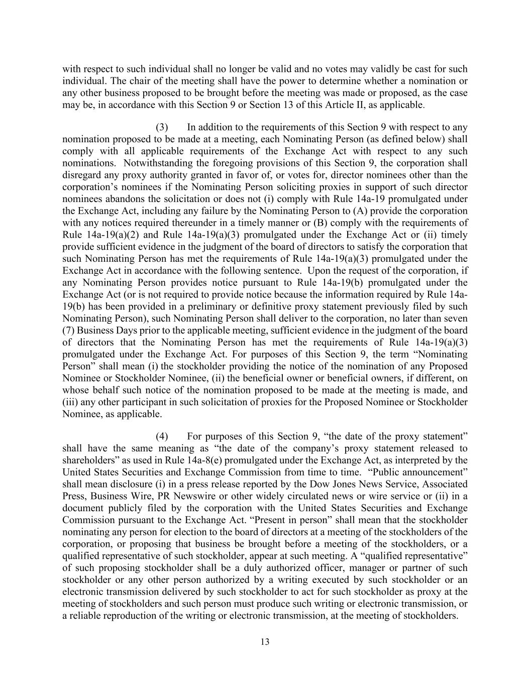 13 with respect to such individual shall no longer be valid and no votes may validly be cast for such individual. The chair of the meeting shall have the power to determine whether a nomination or any other business proposed to be brought before the meeting was made or proposed, as the case may be, in accordance with this Section 9 or Section 13 of this Article II, as applicable. (3) In addition to the requirements of this Section 9 with respect to any nomination proposed to be made at a meeting, each Nominating Person (as defined below) shall comply with all applicable requirements of the Exchange Act with respect to any such nominations. Notwithstanding the foregoing provisions of this Section 9, the corporation shall disregard any proxy authority granted in favor of, or votes for, director nominees other than the corporation’s nominees if the Nominating Person soliciting proxies in support of such director nominees abandons the solicitation or does not (i) comply with Rule 14a-19 promulgated under the Exchange Act, including any failure by the Nominating Person to (A) provide the corporation with any notices required thereunder in a timely manner or (B) comply with the requirements of Rule 14a-19(a)(2) and Rule 14a-19(a)(3) promulgated under the Exchange Act or (ii) timely provide sufficient evidence in the judgment of the board of directors to satisfy the corporation that such Nominating Person has met the requirements of Rule 14a-19(a)(3) promulgated under the Exchange Act in accordance with the following sentence. Upon the request of the corporation, if any Nominating Person provides notice pursuant to Rule 14a-19(b) promulgated under the Exchange Act (or is not required to provide notice because the information required by Rule 14a- 19(b) has been provided in a preliminary or definitive proxy statement previously filed by such Nominating Person), such Nominating Person shall deliver to the corporation, no later than seven (7) Business Days prior to the applicable meeting, sufficient evidence in the judgment of the board of directors that the Nominating Person has met the requirements of Rule 14a-19(a)(3) promulgated under the Exchange Act. For purposes of this Section 9, the term “Nominating Person” shall mean (i) the stockholder providing the notice of the nomination of any Proposed Nominee or Stockholder Nominee, (ii) the beneficial owner or beneficial owners, if different, on whose behalf such notice of the nomination proposed to be made at the meeting is made, and (iii) any other participant in such solicitation of proxies for the Proposed Nominee or Stockholder Nominee, as applicable. (4) For purposes of this Section 9, “the date of the proxy statement” shall have the same meaning as “the date of the company’s proxy statement released to shareholders” as used in Rule 14a-8(e) promulgated under the Exchange Act, as interpreted by the United States Securities and Exchange Commission from time to time. “Public announcement” shall mean disclosure (i) in a press release reported by the Dow Jones News Service, Associated Press, Business Wire, PR Newswire or other widely circulated news or wire service or (ii) in a document publicly filed by the corporation with the United States Securities and Exchange Commission pursuant to the Exchange Act. “Present in person” shall mean that the stockholder nominating any person for election to the board of directors at a meeting of the stockholders of the corporation, or proposing that business be brought before a meeting of the stockholders, or a qualified representative of such stockholder, appear at such meeting. A “qualified representative” of such proposing stockholder shall be a duly authorized officer, manager or partner of such stockholder or any other person authorized by a writing executed by such stockholder or an electronic transmission delivered by such stockholder to act for such stockholder as proxy at the meeting of stockholders and such person must produce such writing or electronic transmission, or a reliable reproduction of the writing or electronic transmission, at the meeting of stockholders.