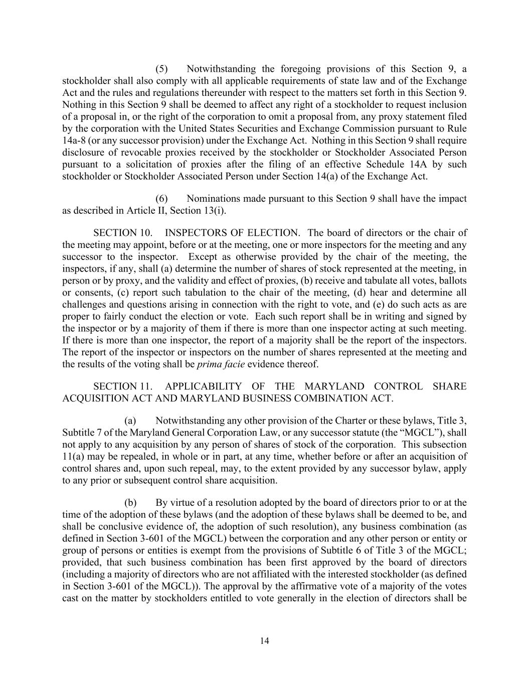 14 (5) Notwithstanding the foregoing provisions of this Section 9, a stockholder shall also comply with all applicable requirements of state law and of the Exchange Act and the rules and regulations thereunder with respect to the matters set forth in this Section 9. Nothing in this Section 9 shall be deemed to affect any right of a stockholder to request inclusion of a proposal in, or the right of the corporation to omit a proposal from, any proxy statement filed by the corporation with the United States Securities and Exchange Commission pursuant to Rule 14a-8 (or any successor provision) under the Exchange Act. Nothing in this Section 9 shall require disclosure of revocable proxies received by the stockholder or Stockholder Associated Person pursuant to a solicitation of proxies after the filing of an effective Schedule 14A by such stockholder or Stockholder Associated Person under Section 14(a) of the Exchange Act. (6) Nominations made pursuant to this Section 9 shall have the impact as described in Article II, Section 13(i). SECTION 10. INSPECTORS OF ELECTION. The board of directors or the chair of the meeting may appoint, before or at the meeting, one or more inspectors for the meeting and any successor to the inspector. Except as otherwise provided by the chair of the meeting, the inspectors, if any, shall (a) determine the number of shares of stock represented at the meeting, in person or by proxy, and the validity and effect of proxies, (b) receive and tabulate all votes, ballots or consents, (c) report such tabulation to the chair of the meeting, (d) hear and determine all challenges and questions arising in connection with the right to vote, and (e) do such acts as are proper to fairly conduct the election or vote. Each such report shall be in writing and signed by the inspector or by a majority of them if there is more than one inspector acting at such meeting. If there is more than one inspector, the report of a majority shall be the report of the inspectors. The report of the inspector or inspectors on the number of shares represented at the meeting and the results of the voting shall be prima facie evidence thereof. SECTION 11. APPLICABILITY OF THE MARYLAND CONTROL SHARE ACQUISITION ACT AND MARYLAND BUSINESS COMBINATION ACT. (a) Notwithstanding any other provision of the Charter or these bylaws, Title 3, Subtitle 7 of the Maryland General Corporation Law, or any successor statute (the “MGCL”), shall not apply to any acquisition by any person of shares of stock of the corporation. This subsection 11(a) may be repealed, in whole or in part, at any time, whether before or after an acquisition of control shares and, upon such repeal, may, to the extent provided by any successor bylaw, apply to any prior or subsequent control share acquisition. (b) By virtue of a resolution adopted by the board of directors prior to or at the time of the adoption of these bylaws (and the adoption of these bylaws shall be deemed to be, and shall be conclusive evidence of, the adoption of such resolution), any business combination (as defined in Section 3-601 of the MGCL) between the corporation and any other person or entity or group of persons or entities is exempt from the provisions of Subtitle 6 of Title 3 of the MGCL; provided, that such business combination has been first approved by the board of directors (including a majority of directors who are not affiliated with the interested stockholder (as defined in Section 3-601 of the MGCL)). The approval by the affirmative vote of a majority of the votes cast on the matter by stockholders entitled to vote generally in the election of directors shall be