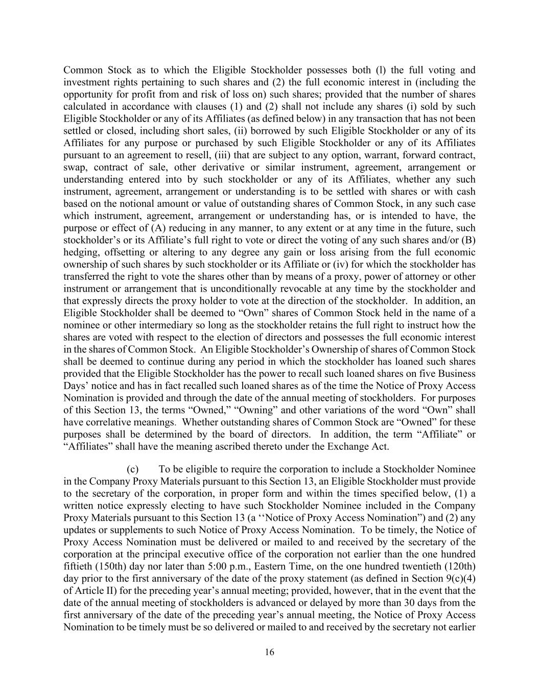 16 Common Stock as to which the Eligible Stockholder possesses both (l) the full voting and investment rights pertaining to such shares and (2) the full economic interest in (including the opportunity for profit from and risk of loss on) such shares; provided that the number of shares calculated in accordance with clauses (1) and (2) shall not include any shares (i) sold by such Eligible Stockholder or any of its Affiliates (as defined below) in any transaction that has not been settled or closed, including short sales, (ii) borrowed by such Eligible Stockholder or any of its Affiliates for any purpose or purchased by such Eligible Stockholder or any of its Affiliates pursuant to an agreement to resell, (iii) that are subject to any option, warrant, forward contract, swap, contract of sale, other derivative or similar instrument, agreement, arrangement or understanding entered into by such stockholder or any of its Affiliates, whether any such instrument, agreement, arrangement or understanding is to be settled with shares or with cash based on the notional amount or value of outstanding shares of Common Stock, in any such case which instrument, agreement, arrangement or understanding has, or is intended to have, the purpose or effect of (A) reducing in any manner, to any extent or at any time in the future, such stockholder’s or its Affiliate’s full right to vote or direct the voting of any such shares and/or (B) hedging, offsetting or altering to any degree any gain or loss arising from the full economic ownership of such shares by such stockholder or its Affiliate or (iv) for which the stockholder has transferred the right to vote the shares other than by means of a proxy, power of attorney or other instrument or arrangement that is unconditionally revocable at any time by the stockholder and that expressly directs the proxy holder to vote at the direction of the stockholder. In addition, an Eligible Stockholder shall be deemed to “Own” shares of Common Stock held in the name of a nominee or other intermediary so long as the stockholder retains the full right to instruct how the shares are voted with respect to the election of directors and possesses the full economic interest in the shares of Common Stock. An Eligible Stockholder’s Ownership of shares of Common Stock shall be deemed to continue during any period in which the stockholder has loaned such shares provided that the Eligible Stockholder has the power to recall such loaned shares on five Business Days’ notice and has in fact recalled such loaned shares as of the time the Notice of Proxy Access Nomination is provided and through the date of the annual meeting of stockholders. For purposes of this Section 13, the terms “Owned,” “Owning” and other variations of the word “Own” shall have correlative meanings. Whether outstanding shares of Common Stock are “Owned” for these purposes shall be determined by the board of directors. In addition, the term “Affiliate” or “Affiliates” shall have the meaning ascribed thereto under the Exchange Act. (c) To be eligible to require the corporation to include a Stockholder Nominee in the Company Proxy Materials pursuant to this Section 13, an Eligible Stockholder must provide to the secretary of the corporation, in proper form and within the times specified below, (1) a written notice expressly electing to have such Stockholder Nominee included in the Company Proxy Materials pursuant to this Section 13 (a ‘‘Notice of Proxy Access Nomination”) and (2) any updates or supplements to such Notice of Proxy Access Nomination. To be timely, the Notice of Proxy Access Nomination must be delivered or mailed to and received by the secretary of the corporation at the principal executive office of the corporation not earlier than the one hundred fiftieth (150th) day nor later than 5:00 p.m., Eastern Time, on the one hundred twentieth (120th) day prior to the first anniversary of the date of the proxy statement (as defined in Section 9(c)(4) of Article II) for the preceding year’s annual meeting; provided, however, that in the event that the date of the annual meeting of stockholders is advanced or delayed by more than 30 days from the first anniversary of the date of the preceding year’s annual meeting, the Notice of Proxy Access Nomination to be timely must be so delivered or mailed to and received by the secretary not earlier