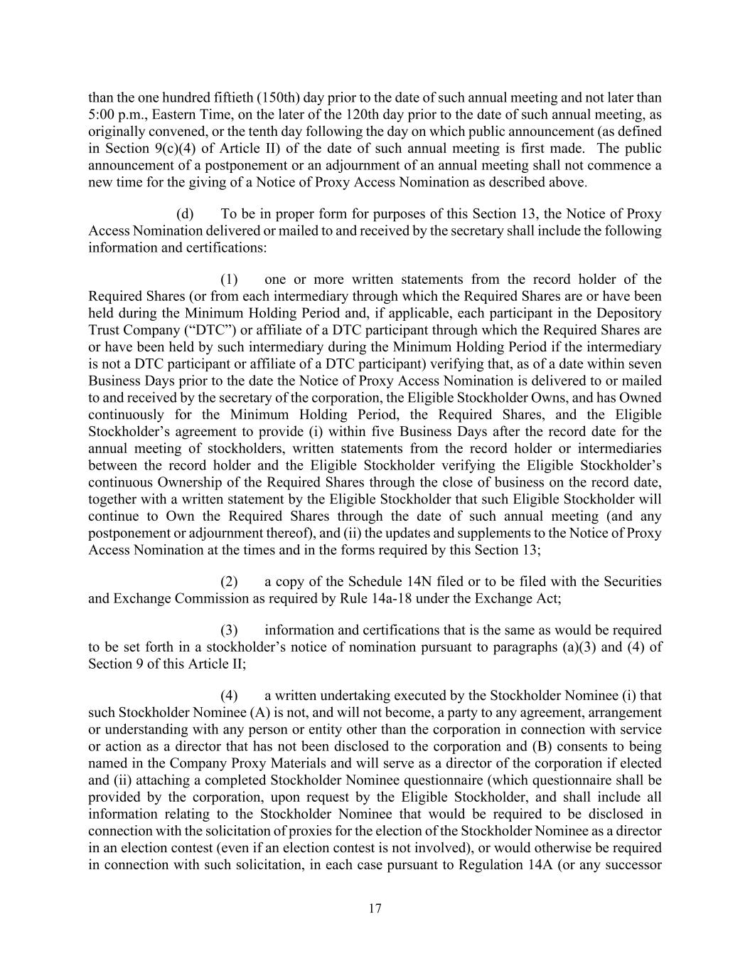 17 than the one hundred fiftieth (150th) day prior to the date of such annual meeting and not later than 5:00 p.m., Eastern Time, on the later of the 120th day prior to the date of such annual meeting, as originally convened, or the tenth day following the day on which public announcement (as defined in Section 9(c)(4) of Article II) of the date of such annual meeting is first made. The public announcement of a postponement or an adjournment of an annual meeting shall not commence a new time for the giving of a Notice of Proxy Access Nomination as described above. (d) To be in proper form for purposes of this Section 13, the Notice of Proxy Access Nomination delivered or mailed to and received by the secretary shall include the following information and certifications: (1) one or more written statements from the record holder of the Required Shares (or from each intermediary through which the Required Shares are or have been held during the Minimum Holding Period and, if applicable, each participant in the Depository Trust Company (“DTC”) or affiliate of a DTC participant through which the Required Shares are or have been held by such intermediary during the Minimum Holding Period if the intermediary is not a DTC participant or affiliate of a DTC participant) verifying that, as of a date within seven Business Days prior to the date the Notice of Proxy Access Nomination is delivered to or mailed to and received by the secretary of the corporation, the Eligible Stockholder Owns, and has Owned continuously for the Minimum Holding Period, the Required Shares, and the Eligible Stockholder’s agreement to provide (i) within five Business Days after the record date for the annual meeting of stockholders, written statements from the record holder or intermediaries between the record holder and the Eligible Stockholder verifying the Eligible Stockholder’s continuous Ownership of the Required Shares through the close of business on the record date, together with a written statement by the Eligible Stockholder that such Eligible Stockholder will continue to Own the Required Shares through the date of such annual meeting (and any postponement or adjournment thereof), and (ii) the updates and supplements to the Notice of Proxy Access Nomination at the times and in the forms required by this Section 13; (2) a copy of the Schedule 14N filed or to be filed with the Securities and Exchange Commission as required by Rule 14a-18 under the Exchange Act; (3) information and certifications that is the same as would be required to be set forth in a stockholder’s notice of nomination pursuant to paragraphs (a)(3) and (4) of Section 9 of this Article II; (4) a written undertaking executed by the Stockholder Nominee (i) that such Stockholder Nominee (A) is not, and will not become, a party to any agreement, arrangement or understanding with any person or entity other than the corporation in connection with service or action as a director that has not been disclosed to the corporation and (B) consents to being named in the Company Proxy Materials and will serve as a director of the corporation if elected and (ii) attaching a completed Stockholder Nominee questionnaire (which questionnaire shall be provided by the corporation, upon request by the Eligible Stockholder, and shall include all information relating to the Stockholder Nominee that would be required to be disclosed in connection with the solicitation of proxies for the election of the Stockholder Nominee as a director in an election contest (even if an election contest is not involved), or would otherwise be required in connection with such solicitation, in each case pursuant to Regulation 14A (or any successor