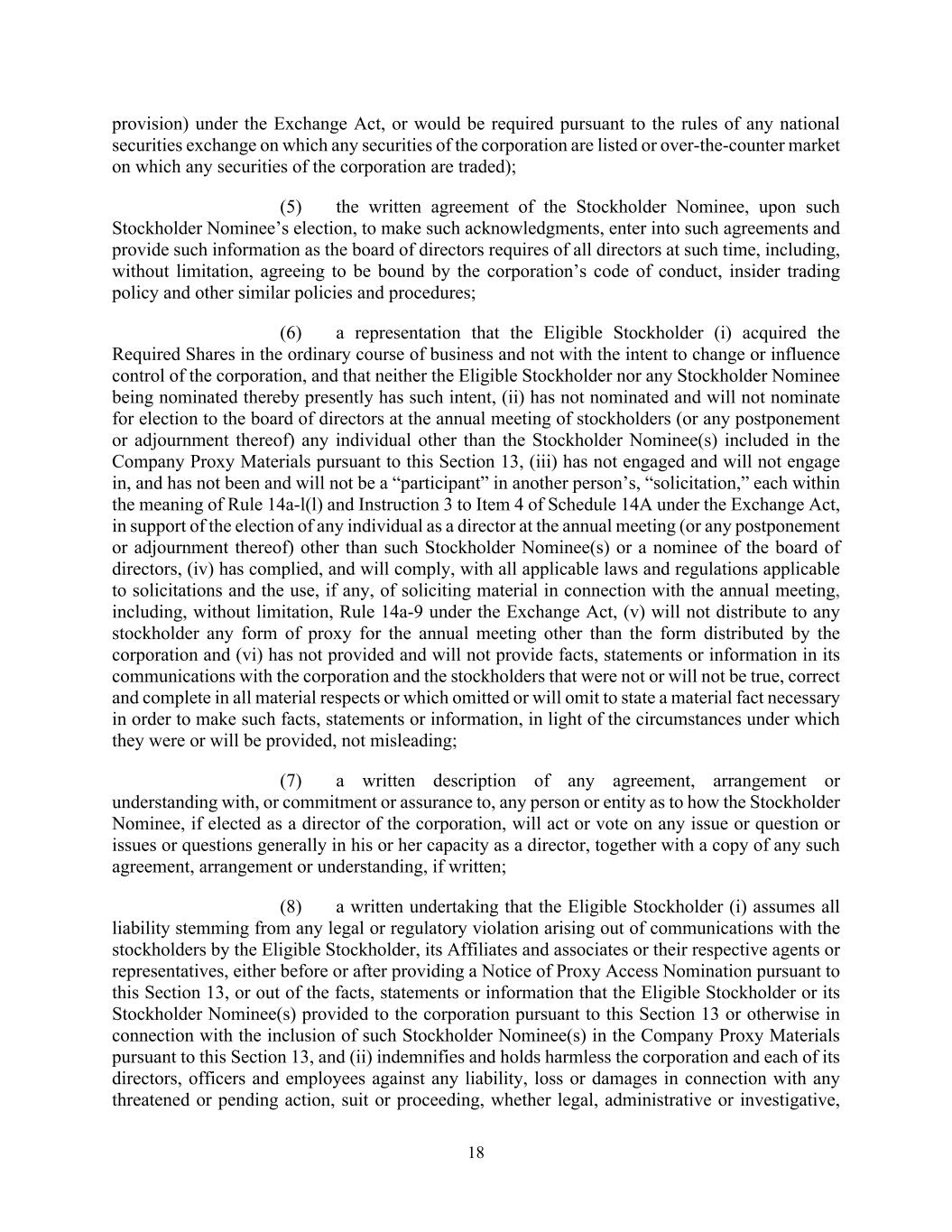 18 provision) under the Exchange Act, or would be required pursuant to the rules of any national securities exchange on which any securities of the corporation are listed or over-the-counter market on which any securities of the corporation are traded); (5) the written agreement of the Stockholder Nominee, upon such Stockholder Nominee’s election, to make such acknowledgments, enter into such agreements and provide such information as the board of directors requires of all directors at such time, including, without limitation, agreeing to be bound by the corporation’s code of conduct, insider trading policy and other similar policies and procedures; (6) a representation that the Eligible Stockholder (i) acquired the Required Shares in the ordinary course of business and not with the intent to change or influence control of the corporation, and that neither the Eligible Stockholder nor any Stockholder Nominee being nominated thereby presently has such intent, (ii) has not nominated and will not nominate for election to the board of directors at the annual meeting of stockholders (or any postponement or adjournment thereof) any individual other than the Stockholder Nominee(s) included in the Company Proxy Materials pursuant to this Section 13, (iii) has not engaged and will not engage in, and has not been and will not be a “participant” in another person’s, “solicitation,” each within the meaning of Rule 14a-l(l) and Instruction 3 to Item 4 of Schedule 14A under the Exchange Act, in support of the election of any individual as a director at the annual meeting (or any postponement or adjournment thereof) other than such Stockholder Nominee(s) or a nominee of the board of directors, (iv) has complied, and will comply, with all applicable laws and regulations applicable to solicitations and the use, if any, of soliciting material in connection with the annual meeting, including, without limitation, Rule 14a-9 under the Exchange Act, (v) will not distribute to any stockholder any form of proxy for the annual meeting other than the form distributed by the corporation and (vi) has not provided and will not provide facts, statements or information in its communications with the corporation and the stockholders that were not or will not be true, correct and complete in all material respects or which omitted or will omit to state a material fact necessary in order to make such facts, statements or information, in light of the circumstances under which they were or will be provided, not misleading; (7) a written description of any agreement, arrangement or understanding with, or commitment or assurance to, any person or entity as to how the Stockholder Nominee, if elected as a director of the corporation, will act or vote on any issue or question or issues or questions generally in his or her capacity as a director, together with a copy of any such agreement, arrangement or understanding, if written; (8) a written undertaking that the Eligible Stockholder (i) assumes all liability stemming from any legal or regulatory violation arising out of communications with the stockholders by the Eligible Stockholder, its Affiliates and associates or their respective agents or representatives, either before or after providing a Notice of Proxy Access Nomination pursuant to this Section 13, or out of the facts, statements or information that the Eligible Stockholder or its Stockholder Nominee(s) provided to the corporation pursuant to this Section 13 or otherwise in connection with the inclusion of such Stockholder Nominee(s) in the Company Proxy Materials pursuant to this Section 13, and (ii) indemnifies and holds harmless the corporation and each of its directors, officers and employees against any liability, loss or damages in connection with any threatened or pending action, suit or proceeding, whether legal, administrative or investigative,