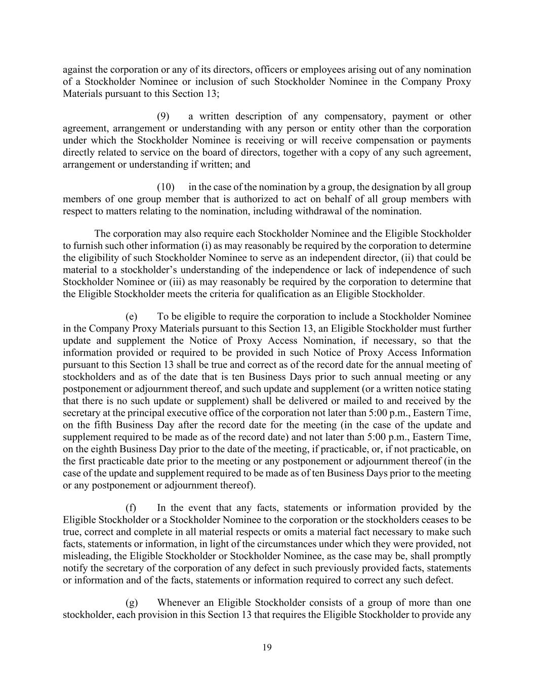 19 against the corporation or any of its directors, officers or employees arising out of any nomination of a Stockholder Nominee or inclusion of such Stockholder Nominee in the Company Proxy Materials pursuant to this Section 13; (9) a written description of any compensatory, payment or other agreement, arrangement or understanding with any person or entity other than the corporation under which the Stockholder Nominee is receiving or will receive compensation or payments directly related to service on the board of directors, together with a copy of any such agreement, arrangement or understanding if written; and (10) in the case of the nomination by a group, the designation by all group members of one group member that is authorized to act on behalf of all group members with respect to matters relating to the nomination, including withdrawal of the nomination. The corporation may also require each Stockholder Nominee and the Eligible Stockholder to furnish such other information (i) as may reasonably be required by the corporation to determine the eligibility of such Stockholder Nominee to serve as an independent director, (ii) that could be material to a stockholder’s understanding of the independence or lack of independence of such Stockholder Nominee or (iii) as may reasonably be required by the corporation to determine that the Eligible Stockholder meets the criteria for qualification as an Eligible Stockholder. (e) To be eligible to require the corporation to include a Stockholder Nominee in the Company Proxy Materials pursuant to this Section 13, an Eligible Stockholder must further update and supplement the Notice of Proxy Access Nomination, if necessary, so that the information provided or required to be provided in such Notice of Proxy Access Information pursuant to this Section 13 shall be true and correct as of the record date for the annual meeting of stockholders and as of the date that is ten Business Days prior to such annual meeting or any postponement or adjournment thereof, and such update and supplement (or a written notice stating that there is no such update or supplement) shall be delivered or mailed to and received by the secretary at the principal executive office of the corporation not later than 5:00 p.m., Eastern Time, on the fifth Business Day after the record date for the meeting (in the case of the update and supplement required to be made as of the record date) and not later than 5:00 p.m., Eastern Time, on the eighth Business Day prior to the date of the meeting, if practicable, or, if not practicable, on the first practicable date prior to the meeting or any postponement or adjournment thereof (in the case of the update and supplement required to be made as of ten Business Days prior to the meeting or any postponement or adjournment thereof). (f) In the event that any facts, statements or information provided by the Eligible Stockholder or a Stockholder Nominee to the corporation or the stockholders ceases to be true, correct and complete in all material respects or omits a material fact necessary to make such facts, statements or information, in light of the circumstances under which they were provided, not misleading, the Eligible Stockholder or Stockholder Nominee, as the case may be, shall promptly notify the secretary of the corporation of any defect in such previously provided facts, statements or information and of the facts, statements or information required to correct any such defect. (g) Whenever an Eligible Stockholder consists of a group of more than one stockholder, each provision in this Section 13 that requires the Eligible Stockholder to provide any