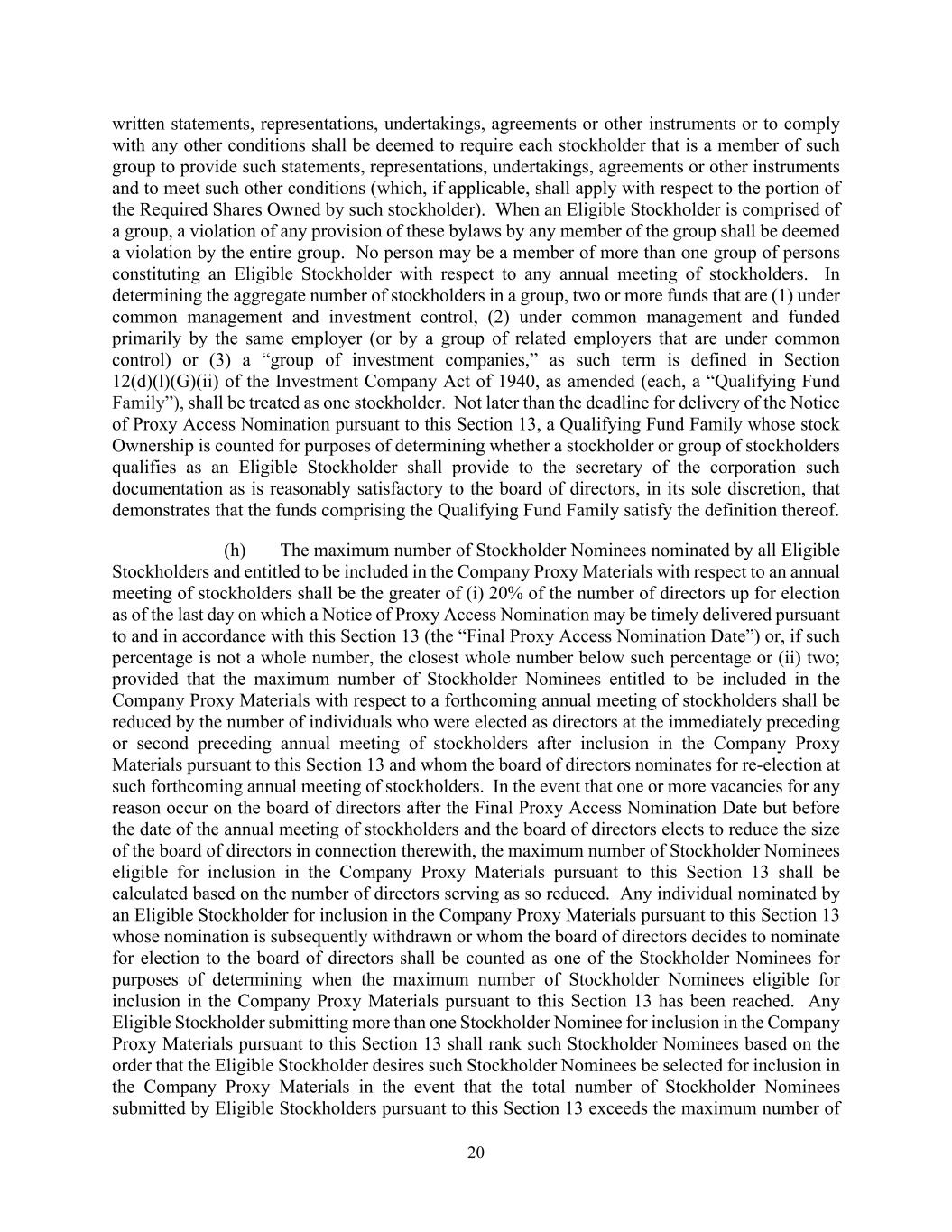 20 written statements, representations, undertakings, agreements or other instruments or to comply with any other conditions shall be deemed to require each stockholder that is a member of such group to provide such statements, representations, undertakings, agreements or other instruments and to meet such other conditions (which, if applicable, shall apply with respect to the portion of the Required Shares Owned by such stockholder). When an Eligible Stockholder is comprised of a group, a violation of any provision of these bylaws by any member of the group shall be deemed a violation by the entire group. No person may be a member of more than one group of persons constituting an Eligible Stockholder with respect to any annual meeting of stockholders. In determining the aggregate number of stockholders in a group, two or more funds that are (1) under common management and investment control, (2) under common management and funded primarily by the same employer (or by a group of related employers that are under common control) or (3) a “group of investment companies,” as such term is defined in Section 12(d)(l)(G)(ii) of the Investment Company Act of 1940, as amended (each, a “Qualifying Fund Family”), shall be treated as one stockholder. Not later than the deadline for delivery of the Notice of Proxy Access Nomination pursuant to this Section 13, a Qualifying Fund Family whose stock Ownership is counted for purposes of determining whether a stockholder or group of stockholders qualifies as an Eligible Stockholder shall provide to the secretary of the corporation such documentation as is reasonably satisfactory to the board of directors, in its sole discretion, that demonstrates that the funds comprising the Qualifying Fund Family satisfy the definition thereof. (h) The maximum number of Stockholder Nominees nominated by all Eligible Stockholders and entitled to be included in the Company Proxy Materials with respect to an annual meeting of stockholders shall be the greater of (i) 20% of the number of directors up for election as of the last day on which a Notice of Proxy Access Nomination may be timely delivered pursuant to and in accordance with this Section 13 (the “Final Proxy Access Nomination Date”) or, if such percentage is not a whole number, the closest whole number below such percentage or (ii) two; provided that the maximum number of Stockholder Nominees entitled to be included in the Company Proxy Materials with respect to a forthcoming annual meeting of stockholders shall be reduced by the number of individuals who were elected as directors at the immediately preceding or second preceding annual meeting of stockholders after inclusion in the Company Proxy Materials pursuant to this Section 13 and whom the board of directors nominates for re-election at such forthcoming annual meeting of stockholders. In the event that one or more vacancies for any reason occur on the board of directors after the Final Proxy Access Nomination Date but before the date of the annual meeting of stockholders and the board of directors elects to reduce the size of the board of directors in connection therewith, the maximum number of Stockholder Nominees eligible for inclusion in the Company Proxy Materials pursuant to this Section 13 shall be calculated based on the number of directors serving as so reduced. Any individual nominated by an Eligible Stockholder for inclusion in the Company Proxy Materials pursuant to this Section 13 whose nomination is subsequently withdrawn or whom the board of directors decides to nominate for election to the board of directors shall be counted as one of the Stockholder Nominees for purposes of determining when the maximum number of Stockholder Nominees eligible for inclusion in the Company Proxy Materials pursuant to this Section 13 has been reached. Any Eligible Stockholder submitting more than one Stockholder Nominee for inclusion in the Company Proxy Materials pursuant to this Section 13 shall rank such Stockholder Nominees based on the order that the Eligible Stockholder desires such Stockholder Nominees be selected for inclusion in the Company Proxy Materials in the event that the total number of Stockholder Nominees submitted by Eligible Stockholders pursuant to this Section 13 exceeds the maximum number of