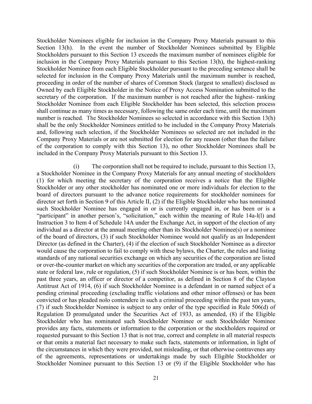 21 Stockholder Nominees eligible for inclusion in the Company Proxy Materials pursuant to this Section 13(h). In the event the number of Stockholder Nominees submitted by Eligible Stockholders pursuant to this Section 13 exceeds the maximum number of nominees eligible for inclusion in the Company Proxy Materials pursuant to this Section 13(h), the highest-ranking Stockholder Nominee from each Eligible Stockholder pursuant to the preceding sentence shall be selected for inclusion in the Company Proxy Materials until the maximum number is reached, proceeding in order of the number of shares of Common Stock (largest to smallest) disclosed as Owned by each Eligible Stockholder in the Notice of Proxy Access Nomination submitted to the secretary of the corporation. If the maximum number is not reached after the highest- ranking Stockholder Nominee from each Eligible Stockholder has been selected, this selection process shall continue as many times as necessary, following the same order each time, until the maximum number is reached. The Stockholder Nominees so selected in accordance with this Section 13(h) shall be the only Stockholder Nominees entitled to be included in the Company Proxy Materials and, following such selection, if the Stockholder Nominees so selected are not included in the Company Proxy Materials or are not submitted for election for any reason (other than the failure of the corporation to comply with this Section 13), no other Stockholder Nominees shall be included in the Company Proxy Materials pursuant to this Section 13. (i) The corporation shall not be required to include, pursuant to this Section 13, a Stockholder Nominee in the Company Proxy Materials for any annual meeting of stockholders (1) for which meeting the secretary of the corporation receives a notice that the Eligible Stockholder or any other stockholder has nominated one or more individuals for election to the board of directors pursuant to the advance notice requirements for stockholder nominees for director set forth in Section 9 of this Article II, (2) if the Eligible Stockholder who has nominated such Stockholder Nominee has engaged in or is currently engaged in, or has been or is a “participant” in another person’s, “solicitation,” each within the meaning of Rule 14a-l(l) and Instruction 3 to Item 4 of Schedule 14A under the Exchange Act, in support of the election of any individual as a director at the annual meeting other than its Stockholder Nominee(s) or a nominee of the board of directors, (3) if such Stockholder Nominee would not qualify as an Independent Director (as defined in the Charter), (4) if the election of such Stockholder Nominee as a director would cause the corporation to fail to comply with these bylaws, the Charter, the rules and listing standards of any national securities exchange on which any securities of the corporation are listed or over-the-counter market on which any securities of the corporation are traded, or any applicable state or federal law, rule or regulation, (5) if such Stockholder Nominee is or has been, within the past three years, an officer or director of a competitor, as defined in Section 8 of the Clayton Antitrust Act of 1914, (6) if such Stockholder Nominee is a defendant in or named subject of a pending criminal proceeding (excluding traffic violations and other minor offenses) or has been convicted or has pleaded nolo contendere in such a criminal proceeding within the past ten years, (7) if such Stockholder Nominee is subject to any order of the type specified in Rule 506(d) of Regulation D promulgated under the Securities Act of 1933, as amended, (8) if the Eligible Stockholder who has nominated such Stockholder Nominee or such Stockholder Nominee provides any facts, statements or information to the corporation or the stockholders required or requested pursuant to this Section 13 that is not true, correct and complete in all material respects or that omits a material fact necessary to make such facts, statements or information, in light of the circumstances in which they were provided, not misleading, or that otherwise contravenes any of the agreements, representations or undertakings made by such Eligible Stockholder or Stockholder Nominee pursuant to this Section 13 or (9) if the Eligible Stockholder who has
