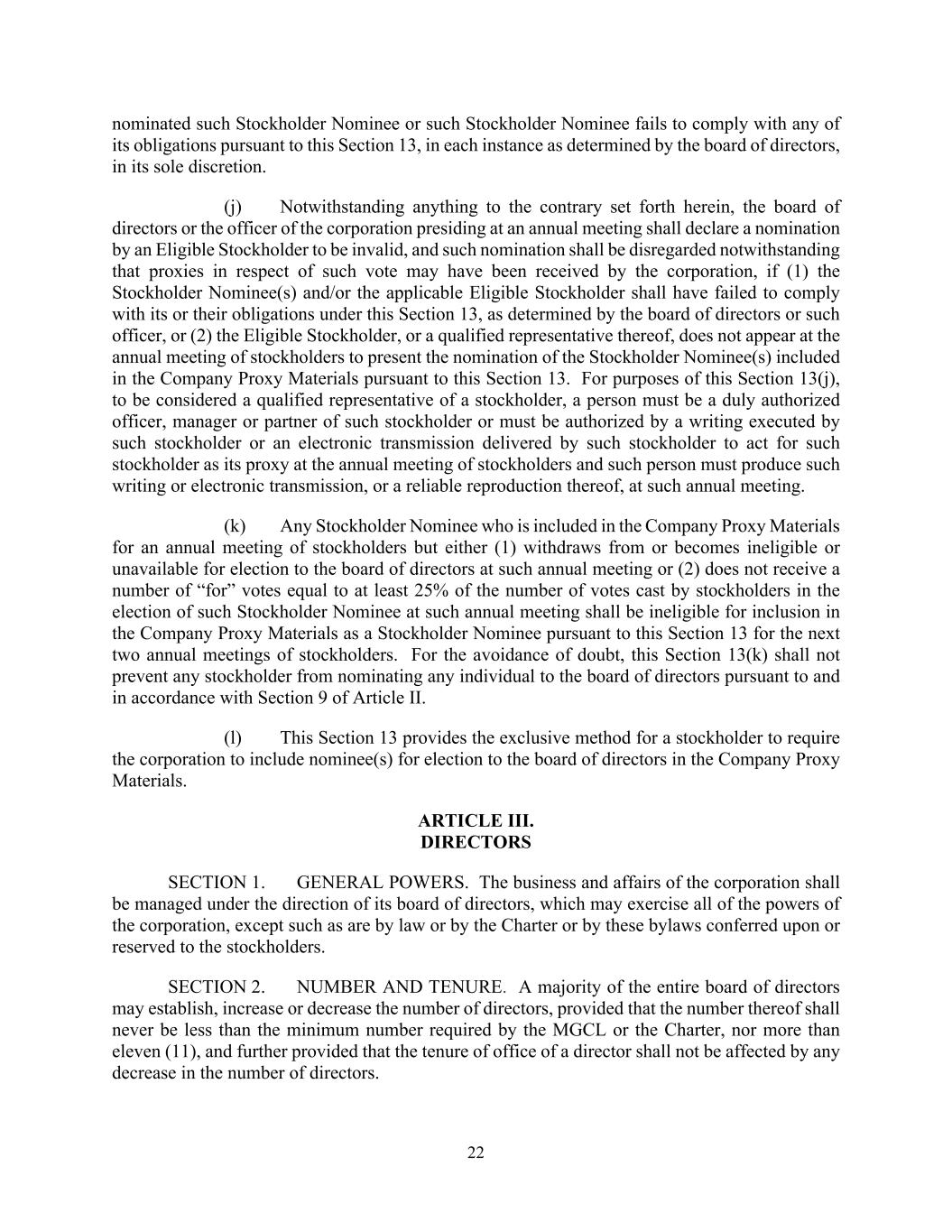 22 nominated such Stockholder Nominee or such Stockholder Nominee fails to comply with any of its obligations pursuant to this Section 13, in each instance as determined by the board of directors, in its sole discretion. (j) Notwithstanding anything to the contrary set forth herein, the board of directors or the officer of the corporation presiding at an annual meeting shall declare a nomination by an Eligible Stockholder to be invalid, and such nomination shall be disregarded notwithstanding that proxies in respect of such vote may have been received by the corporation, if (1) the Stockholder Nominee(s) and/or the applicable Eligible Stockholder shall have failed to comply with its or their obligations under this Section 13, as determined by the board of directors or such officer, or (2) the Eligible Stockholder, or a qualified representative thereof, does not appear at the annual meeting of stockholders to present the nomination of the Stockholder Nominee(s) included in the Company Proxy Materials pursuant to this Section 13. For purposes of this Section 13(j), to be considered a qualified representative of a stockholder, a person must be a duly authorized officer, manager or partner of such stockholder or must be authorized by a writing executed by such stockholder or an electronic transmission delivered by such stockholder to act for such stockholder as its proxy at the annual meeting of stockholders and such person must produce such writing or electronic transmission, or a reliable reproduction thereof, at such annual meeting. (k) Any Stockholder Nominee who is included in the Company Proxy Materials for an annual meeting of stockholders but either (1) withdraws from or becomes ineligible or unavailable for election to the board of directors at such annual meeting or (2) does not receive a number of “for” votes equal to at least 25% of the number of votes cast by stockholders in the election of such Stockholder Nominee at such annual meeting shall be ineligible for inclusion in the Company Proxy Materials as a Stockholder Nominee pursuant to this Section 13 for the next two annual meetings of stockholders. For the avoidance of doubt, this Section 13(k) shall not prevent any stockholder from nominating any individual to the board of directors pursuant to and in accordance with Section 9 of Article II. (l) This Section 13 provides the exclusive method for a stockholder to require the corporation to include nominee(s) for election to the board of directors in the Company Proxy Materials. ARTICLE III. DIRECTORS SECTION 1. GENERAL POWERS. The business and affairs of the corporation shall be managed under the direction of its board of directors, which may exercise all of the powers of the corporation, except such as are by law or by the Charter or by these bylaws conferred upon or reserved to the stockholders. SECTION 2. NUMBER AND TENURE. A majority of the entire board of directors may establish, increase or decrease the number of directors, provided that the number thereof shall never be less than the minimum number required by the MGCL or the Charter, nor more than eleven (11), and further provided that the tenure of office of a director shall not be affected by any decrease in the number of directors.