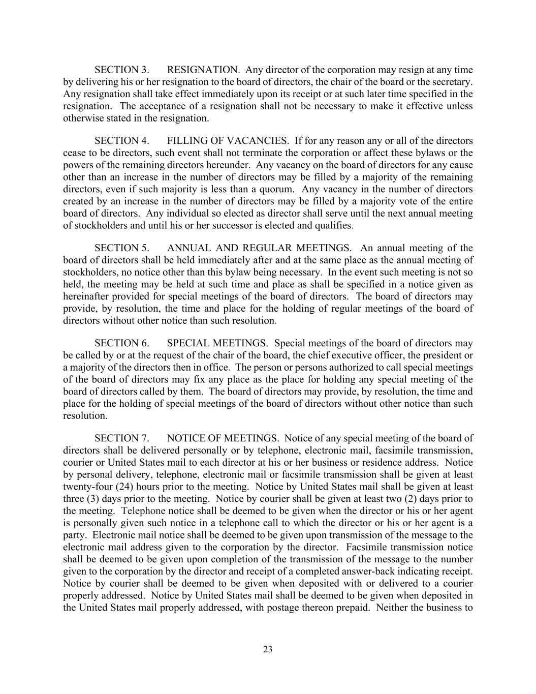 23 SECTION 3. RESIGNATION. Any director of the corporation may resign at any time by delivering his or her resignation to the board of directors, the chair of the board or the secretary. Any resignation shall take effect immediately upon its receipt or at such later time specified in the resignation. The acceptance of a resignation shall not be necessary to make it effective unless otherwise stated in the resignation. SECTION 4. FILLING OF VACANCIES. If for any reason any or all of the directors cease to be directors, such event shall not terminate the corporation or affect these bylaws or the powers of the remaining directors hereunder. Any vacancy on the board of directors for any cause other than an increase in the number of directors may be filled by a majority of the remaining directors, even if such majority is less than a quorum. Any vacancy in the number of directors created by an increase in the number of directors may be filled by a majority vote of the entire board of directors. Any individual so elected as director shall serve until the next annual meeting of stockholders and until his or her successor is elected and qualifies. SECTION 5. ANNUAL AND REGULAR MEETINGS. An annual meeting of the board of directors shall be held immediately after and at the same place as the annual meeting of stockholders, no notice other than this bylaw being necessary. In the event such meeting is not so held, the meeting may be held at such time and place as shall be specified in a notice given as hereinafter provided for special meetings of the board of directors. The board of directors may provide, by resolution, the time and place for the holding of regular meetings of the board of directors without other notice than such resolution. SECTION 6. SPECIAL MEETINGS. Special meetings of the board of directors may be called by or at the request of the chair of the board, the chief executive officer, the president or a majority of the directors then in office. The person or persons authorized to call special meetings of the board of directors may fix any place as the place for holding any special meeting of the board of directors called by them. The board of directors may provide, by resolution, the time and place for the holding of special meetings of the board of directors without other notice than such resolution. SECTION 7. NOTICE OF MEETINGS. Notice of any special meeting of the board of directors shall be delivered personally or by telephone, electronic mail, facsimile transmission, courier or United States mail to each director at his or her business or residence address. Notice by personal delivery, telephone, electronic mail or facsimile transmission shall be given at least twenty-four (24) hours prior to the meeting. Notice by United States mail shall be given at least three (3) days prior to the meeting. Notice by courier shall be given at least two (2) days prior to the meeting. Telephone notice shall be deemed to be given when the director or his or her agent is personally given such notice in a telephone call to which the director or his or her agent is a party. Electronic mail notice shall be deemed to be given upon transmission of the message to the electronic mail address given to the corporation by the director. Facsimile transmission notice shall be deemed to be given upon completion of the transmission of the message to the number given to the corporation by the director and receipt of a completed answer-back indicating receipt. Notice by courier shall be deemed to be given when deposited with or delivered to a courier properly addressed. Notice by United States mail shall be deemed to be given when deposited in the United States mail properly addressed, with postage thereon prepaid. Neither the business to