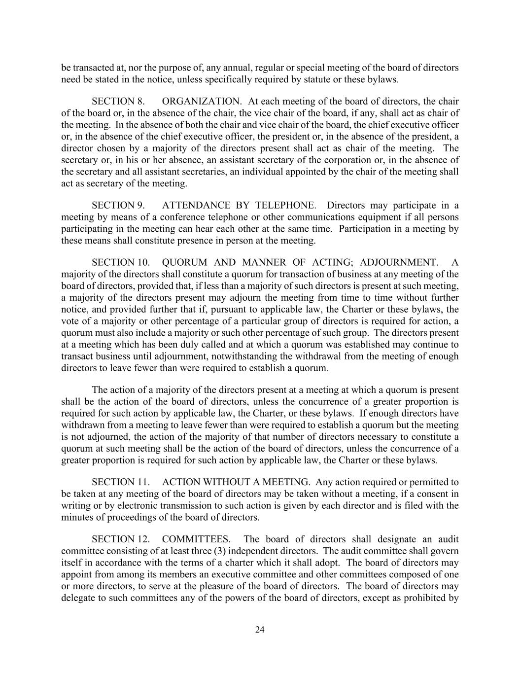 24 be transacted at, nor the purpose of, any annual, regular or special meeting of the board of directors need be stated in the notice, unless specifically required by statute or these bylaws. SECTION 8. ORGANIZATION. At each meeting of the board of directors, the chair of the board or, in the absence of the chair, the vice chair of the board, if any, shall act as chair of the meeting. In the absence of both the chair and vice chair of the board, the chief executive officer or, in the absence of the chief executive officer, the president or, in the absence of the president, a director chosen by a majority of the directors present shall act as chair of the meeting. The secretary or, in his or her absence, an assistant secretary of the corporation or, in the absence of the secretary and all assistant secretaries, an individual appointed by the chair of the meeting shall act as secretary of the meeting. SECTION 9. ATTENDANCE BY TELEPHONE. Directors may participate in a meeting by means of a conference telephone or other communications equipment if all persons participating in the meeting can hear each other at the same time. Participation in a meeting by these means shall constitute presence in person at the meeting. SECTION 10. QUORUM AND MANNER OF ACTING; ADJOURNMENT. A majority of the directors shall constitute a quorum for transaction of business at any meeting of the board of directors, provided that, if less than a majority of such directors is present at such meeting, a majority of the directors present may adjourn the meeting from time to time without further notice, and provided further that if, pursuant to applicable law, the Charter or these bylaws, the vote of a majority or other percentage of a particular group of directors is required for action, a quorum must also include a majority or such other percentage of such group. The directors present at a meeting which has been duly called and at which a quorum was established may continue to transact business until adjournment, notwithstanding the withdrawal from the meeting of enough directors to leave fewer than were required to establish a quorum. The action of a majority of the directors present at a meeting at which a quorum is present shall be the action of the board of directors, unless the concurrence of a greater proportion is required for such action by applicable law, the Charter, or these bylaws. If enough directors have withdrawn from a meeting to leave fewer than were required to establish a quorum but the meeting is not adjourned, the action of the majority of that number of directors necessary to constitute a quorum at such meeting shall be the action of the board of directors, unless the concurrence of a greater proportion is required for such action by applicable law, the Charter or these bylaws. SECTION 11. ACTION WITHOUT A MEETING. Any action required or permitted to be taken at any meeting of the board of directors may be taken without a meeting, if a consent in writing or by electronic transmission to such action is given by each director and is filed with the minutes of proceedings of the board of directors. SECTION 12. COMMITTEES. The board of directors shall designate an audit committee consisting of at least three (3) independent directors. The audit committee shall govern itself in accordance with the terms of a charter which it shall adopt. The board of directors may appoint from among its members an executive committee and other committees composed of one or more directors, to serve at the pleasure of the board of directors. The board of directors may delegate to such committees any of the powers of the board of directors, except as prohibited by