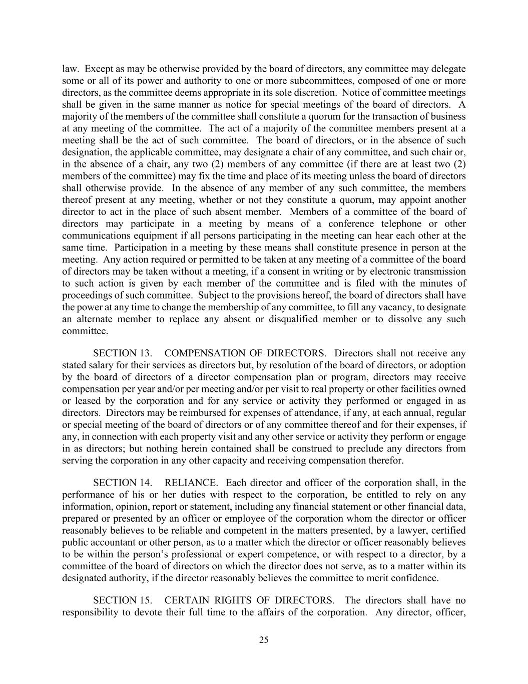 25 law. Except as may be otherwise provided by the board of directors, any committee may delegate some or all of its power and authority to one or more subcommittees, composed of one or more directors, as the committee deems appropriate in its sole discretion. Notice of committee meetings shall be given in the same manner as notice for special meetings of the board of directors. A majority of the members of the committee shall constitute a quorum for the transaction of business at any meeting of the committee. The act of a majority of the committee members present at a meeting shall be the act of such committee. The board of directors, or in the absence of such designation, the applicable committee, may designate a chair of any committee, and such chair or, in the absence of a chair, any two (2) members of any committee (if there are at least two (2) members of the committee) may fix the time and place of its meeting unless the board of directors shall otherwise provide. In the absence of any member of any such committee, the members thereof present at any meeting, whether or not they constitute a quorum, may appoint another director to act in the place of such absent member. Members of a committee of the board of directors may participate in a meeting by means of a conference telephone or other communications equipment if all persons participating in the meeting can hear each other at the same time. Participation in a meeting by these means shall constitute presence in person at the meeting. Any action required or permitted to be taken at any meeting of a committee of the board of directors may be taken without a meeting, if a consent in writing or by electronic transmission to such action is given by each member of the committee and is filed with the minutes of proceedings of such committee. Subject to the provisions hereof, the board of directors shall have the power at any time to change the membership of any committee, to fill any vacancy, to designate an alternate member to replace any absent or disqualified member or to dissolve any such committee. SECTION 13. COMPENSATION OF DIRECTORS. Directors shall not receive any stated salary for their services as directors but, by resolution of the board of directors, or adoption by the board of directors of a director compensation plan or program, directors may receive compensation per year and/or per meeting and/or per visit to real property or other facilities owned or leased by the corporation and for any service or activity they performed or engaged in as directors. Directors may be reimbursed for expenses of attendance, if any, at each annual, regular or special meeting of the board of directors or of any committee thereof and for their expenses, if any, in connection with each property visit and any other service or activity they perform or engage in as directors; but nothing herein contained shall be construed to preclude any directors from serving the corporation in any other capacity and receiving compensation therefor. SECTION 14. RELIANCE. Each director and officer of the corporation shall, in the performance of his or her duties with respect to the corporation, be entitled to rely on any information, opinion, report or statement, including any financial statement or other financial data, prepared or presented by an officer or employee of the corporation whom the director or officer reasonably believes to be reliable and competent in the matters presented, by a lawyer, certified public accountant or other person, as to a matter which the director or officer reasonably believes to be within the person’s professional or expert competence, or with respect to a director, by a committee of the board of directors on which the director does not serve, as to a matter within its designated authority, if the director reasonably believes the committee to merit confidence. SECTION 15. CERTAIN RIGHTS OF DIRECTORS. The directors shall have no responsibility to devote their full time to the affairs of the corporation. Any director, officer,