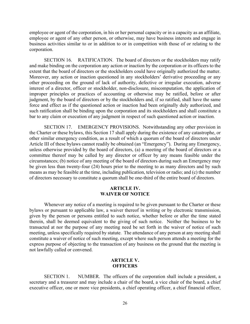 26 employee or agent of the corporation, in his or her personal capacity or in a capacity as an affiliate, employee or agent of any other person, or otherwise, may have business interests and engage in business activities similar to or in addition to or in competition with those of or relating to the corporation. SECTION 16. RATIFICATION. The board of directors or the stockholders may ratify and make binding on the corporation any action or inaction by the corporation or its officers to the extent that the board of directors or the stockholders could have originally authorized the matter. Moreover, any action or inaction questioned in any stockholders’ derivative proceeding or any other proceeding on the ground of lack of authority, defective or irregular execution, adverse interest of a director, officer or stockholder, non-disclosure, miscomputation, the application of improper principles or practices of accounting or otherwise may be ratified, before or after judgment, by the board of directors or by the stockholders and, if so ratified, shall have the same force and effect as if the questioned action or inaction had been originally duly authorized, and such ratification shall be binding upon the corporation and its stockholders and shall constitute a bar to any claim or execution of any judgment in respect of such questioned action or inaction. SECTION 17. EMERGENCY PROVISIONS. Notwithstanding any other provision in the Charter or these bylaws, this Section 17 shall apply during the existence of any catastrophe, or other similar emergency condition, as a result of which a quorum of the board of directors under Article III of these bylaws cannot readily be obtained (an “Emergency”). During any Emergency, unless otherwise provided by the board of directors, (a) a meeting of the board of directors or a committee thereof may be called by any director or officer by any means feasible under the circumstances; (b) notice of any meeting of the board of directors during such an Emergency may be given less than twenty-four (24) hours prior to the meeting to as many directors and by such means as may be feasible at the time, including publication, television or radio; and (c) the number of directors necessary to constitute a quorum shall be one-third of the entire board of directors. ARTICLE IV. WAIVER OF NOTICE Whenever any notice of a meeting is required to be given pursuant to the Charter or these bylaws or pursuant to applicable law, a waiver thereof in writing or by electronic transmission, given by the person or persons entitled to such notice, whether before or after the time stated therein, shall be deemed equivalent to the giving of such notice. Neither the business to be transacted at nor the purpose of any meeting need be set forth in the waiver of notice of such meeting, unless specifically required by statute. The attendance of any person at any meeting shall constitute a waiver of notice of such meeting, except where such person attends a meeting for the express purpose of objecting to the transaction of any business on the ground that the meeting is not lawfully called or convened. ARTICLE V. OFFICERS SECTION 1. NUMBER. The officers of the corporation shall include a president, a secretary and a treasurer and may include a chair of the board, a vice chair of the board, a chief executive officer, one or more vice presidents, a chief operating officer, a chief financial officer,