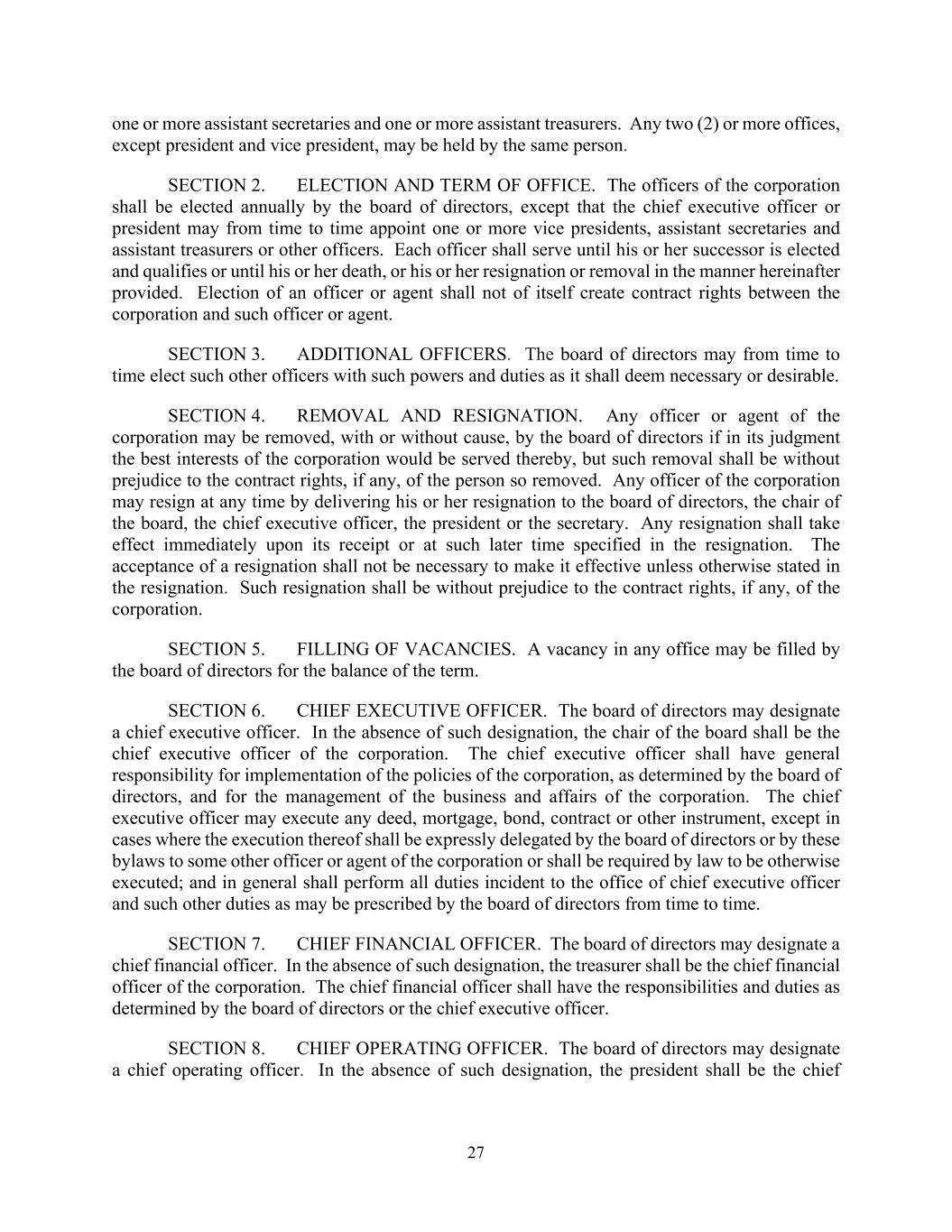 27 one or more assistant secretaries and one or more assistant treasurers. Any two (2) or more offices, except president and vice president, may be held by the same person. SECTION 2. ELECTION AND TERM OF OFFICE. The officers of the corporation shall be elected annually by the board of directors, except that the chief executive officer or president may from time to time appoint one or more vice presidents, assistant secretaries and assistant treasurers or other officers. Each officer shall serve until his or her successor is elected and qualifies or until his or her death, or his or her resignation or removal in the manner hereinafter provided. Election of an officer or agent shall not of itself create contract rights between the corporation and such officer or agent. SECTION 3. ADDITIONAL OFFICERS. The board of directors may from time to time elect such other officers with such powers and duties as it shall deem necessary or desirable. SECTION 4. REMOVAL AND RESIGNATION. Any officer or agent of the corporation may be removed, with or without cause, by the board of directors if in its judgment the best interests of the corporation would be served thereby, but such removal shall be without prejudice to the contract rights, if any, of the person so removed. Any officer of the corporation may resign at any time by delivering his or her resignation to the board of directors, the chair of the board, the chief executive officer, the president or the secretary. Any resignation shall take effect immediately upon its receipt or at such later time specified in the resignation. The acceptance of a resignation shall not be necessary to make it effective unless otherwise stated in the resignation. Such resignation shall be without prejudice to the contract rights, if any, of the corporation. SECTION 5. FILLING OF VACANCIES. A vacancy in any office may be filled by the board of directors for the balance of the term. SECTION 6. CHIEF EXECUTIVE OFFICER. The board of directors may designate a chief executive officer. In the absence of such designation, the chair of the board shall be the chief executive officer of the corporation. The chief executive officer shall have general responsibility for implementation of the policies of the corporation, as determined by the board of directors, and for the management of the business and affairs of the corporation. The chief executive officer may execute any deed, mortgage, bond, contract or other instrument, except in cases where the execution thereof shall be expressly delegated by the board of directors or by these bylaws to some other officer or agent of the corporation or shall be required by law to be otherwise executed; and in general shall perform all duties incident to the office of chief executive officer and such other duties as may be prescribed by the board of directors from time to time. SECTION 7. CHIEF FINANCIAL OFFICER. The board of directors may designate a chief financial officer. In the absence of such designation, the treasurer shall be the chief financial officer of the corporation. The chief financial officer shall have the responsibilities and duties as determined by the board of directors or the chief executive officer. SECTION 8. CHIEF OPERATING OFFICER. The board of directors may designate a chief operating officer. In the absence of such designation, the president shall be the chief