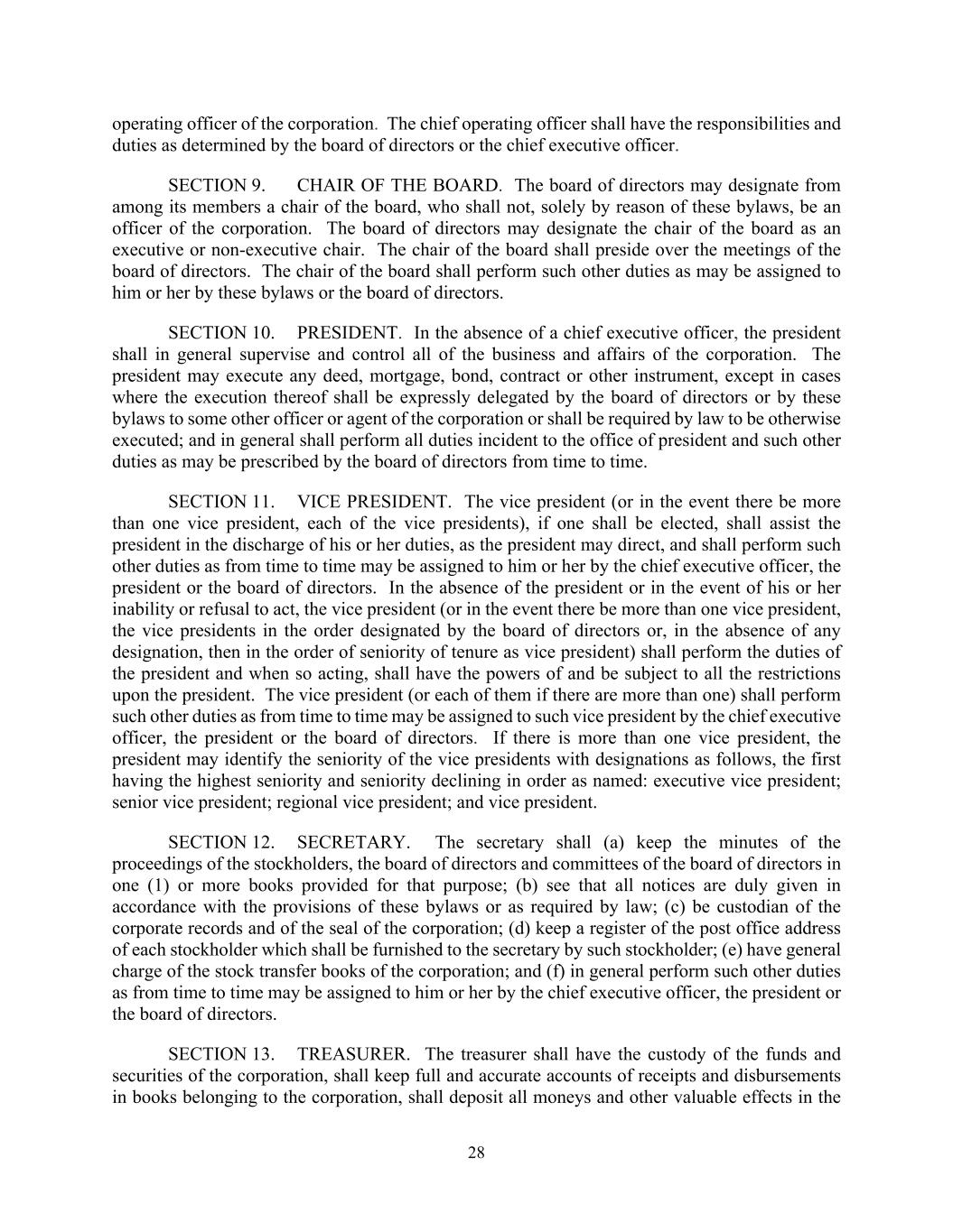 28 operating officer of the corporation. The chief operating officer shall have the responsibilities and duties as determined by the board of directors or the chief executive officer. SECTION 9. CHAIR OF THE BOARD. The board of directors may designate from among its members a chair of the board, who shall not, solely by reason of these bylaws, be an officer of the corporation. The board of directors may designate the chair of the board as an executive or non-executive chair. The chair of the board shall preside over the meetings of the board of directors. The chair of the board shall perform such other duties as may be assigned to him or her by these bylaws or the board of directors. SECTION 10. PRESIDENT. In the absence of a chief executive officer, the president shall in general supervise and control all of the business and affairs of the corporation. The president may execute any deed, mortgage, bond, contract or other instrument, except in cases where the execution thereof shall be expressly delegated by the board of directors or by these bylaws to some other officer or agent of the corporation or shall be required by law to be otherwise executed; and in general shall perform all duties incident to the office of president and such other duties as may be prescribed by the board of directors from time to time. SECTION 11. VICE PRESIDENT. The vice president (or in the event there be more than one vice president, each of the vice presidents), if one shall be elected, shall assist the president in the discharge of his or her duties, as the president may direct, and shall perform such other duties as from time to time may be assigned to him or her by the chief executive officer, the president or the board of directors. In the absence of the president or in the event of his or her inability or refusal to act, the vice president (or in the event there be more than one vice president, the vice presidents in the order designated by the board of directors or, in the absence of any designation, then in the order of seniority of tenure as vice president) shall perform the duties of the president and when so acting, shall have the powers of and be subject to all the restrictions upon the president. The vice president (or each of them if there are more than one) shall perform such other duties as from time to time may be assigned to such vice president by the chief executive officer, the president or the board of directors. If there is more than one vice president, the president may identify the seniority of the vice presidents with designations as follows, the first having the highest seniority and seniority declining in order as named: executive vice president; senior vice president; regional vice president; and vice president. SECTION 12. SECRETARY. The secretary shall (a) keep the minutes of the proceedings of the stockholders, the board of directors and committees of the board of directors in one (1) or more books provided for that purpose; (b) see that all notices are duly given in accordance with the provisions of these bylaws or as required by law; (c) be custodian of the corporate records and of the seal of the corporation; (d) keep a register of the post office address of each stockholder which shall be furnished to the secretary by such stockholder; (e) have general charge of the stock transfer books of the corporation; and (f) in general perform such other duties as from time to time may be assigned to him or her by the chief executive officer, the president or the board of directors. SECTION 13. TREASURER. The treasurer shall have the custody of the funds and securities of the corporation, shall keep full and accurate accounts of receipts and disbursements in books belonging to the corporation, shall deposit all moneys and other valuable effects in the