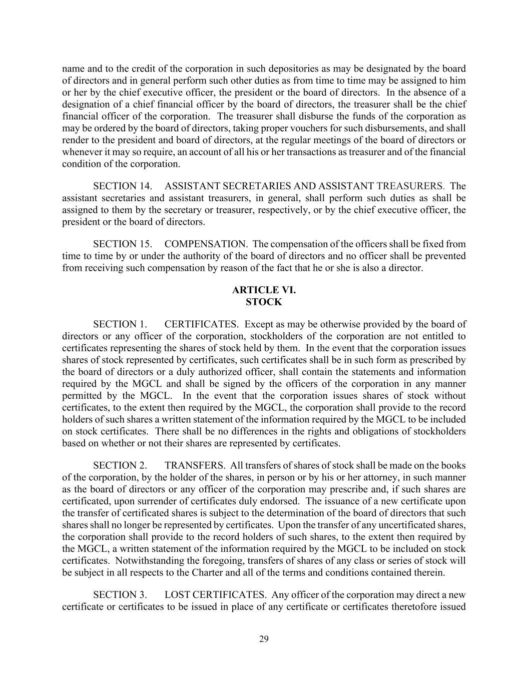 29 name and to the credit of the corporation in such depositories as may be designated by the board of directors and in general perform such other duties as from time to time may be assigned to him or her by the chief executive officer, the president or the board of directors. In the absence of a designation of a chief financial officer by the board of directors, the treasurer shall be the chief financial officer of the corporation. The treasurer shall disburse the funds of the corporation as may be ordered by the board of directors, taking proper vouchers for such disbursements, and shall render to the president and board of directors, at the regular meetings of the board of directors or whenever it may so require, an account of all his or her transactions as treasurer and of the financial condition of the corporation. SECTION 14. ASSISTANT SECRETARIES AND ASSISTANT TREASURERS. The assistant secretaries and assistant treasurers, in general, shall perform such duties as shall be assigned to them by the secretary or treasurer, respectively, or by the chief executive officer, the president or the board of directors. SECTION 15. COMPENSATION. The compensation of the officers shall be fixed from time to time by or under the authority of the board of directors and no officer shall be prevented from receiving such compensation by reason of the fact that he or she is also a director. ARTICLE VI. STOCK SECTION 1. CERTIFICATES. Except as may be otherwise provided by the board of directors or any officer of the corporation, stockholders of the corporation are not entitled to certificates representing the shares of stock held by them. In the event that the corporation issues shares of stock represented by certificates, such certificates shall be in such form as prescribed by the board of directors or a duly authorized officer, shall contain the statements and information required by the MGCL and shall be signed by the officers of the corporation in any manner permitted by the MGCL. In the event that the corporation issues shares of stock without certificates, to the extent then required by the MGCL, the corporation shall provide to the record holders of such shares a written statement of the information required by the MGCL to be included on stock certificates. There shall be no differences in the rights and obligations of stockholders based on whether or not their shares are represented by certificates. SECTION 2. TRANSFERS. All transfers of shares of stock shall be made on the books of the corporation, by the holder of the shares, in person or by his or her attorney, in such manner as the board of directors or any officer of the corporation may prescribe and, if such shares are certificated, upon surrender of certificates duly endorsed. The issuance of a new certificate upon the transfer of certificated shares is subject to the determination of the board of directors that such shares shall no longer be represented by certificates. Upon the transfer of any uncertificated shares, the corporation shall provide to the record holders of such shares, to the extent then required by the MGCL, a written statement of the information required by the MGCL to be included on stock certificates. Notwithstanding the foregoing, transfers of shares of any class or series of stock will be subject in all respects to the Charter and all of the terms and conditions contained therein. SECTION 3. LOST CERTIFICATES. Any officer of the corporation may direct a new certificate or certificates to be issued in place of any certificate or certificates theretofore issued